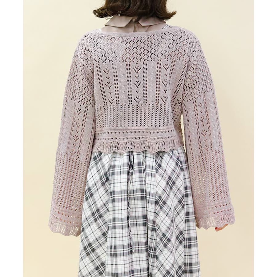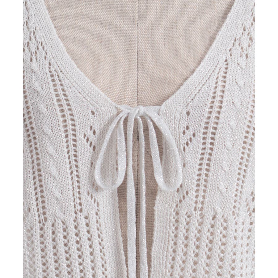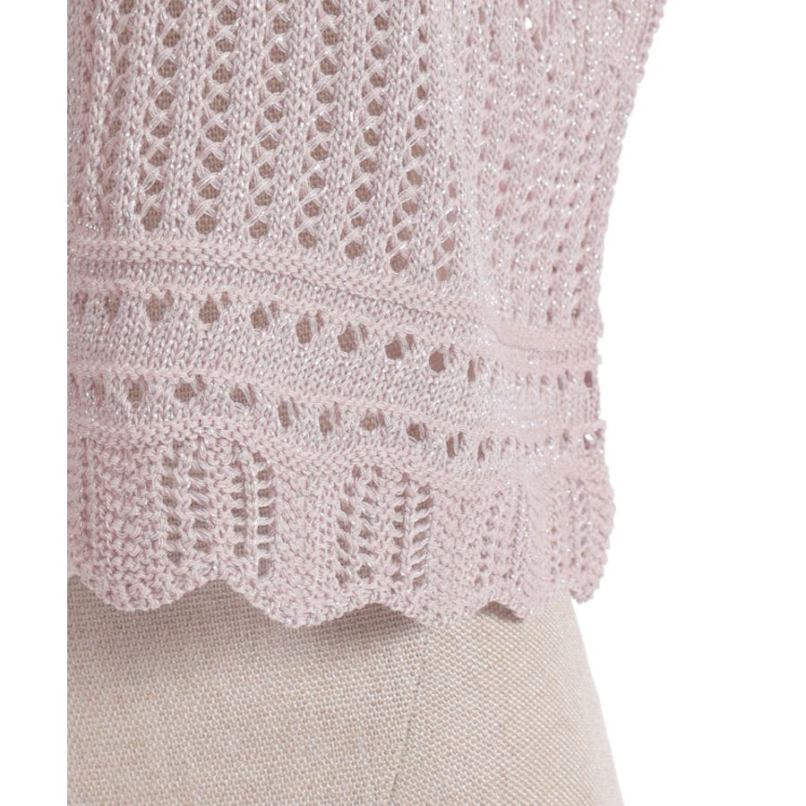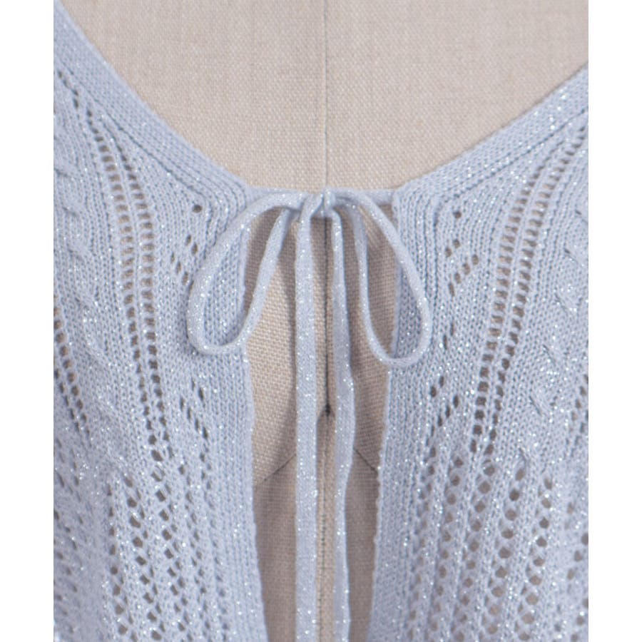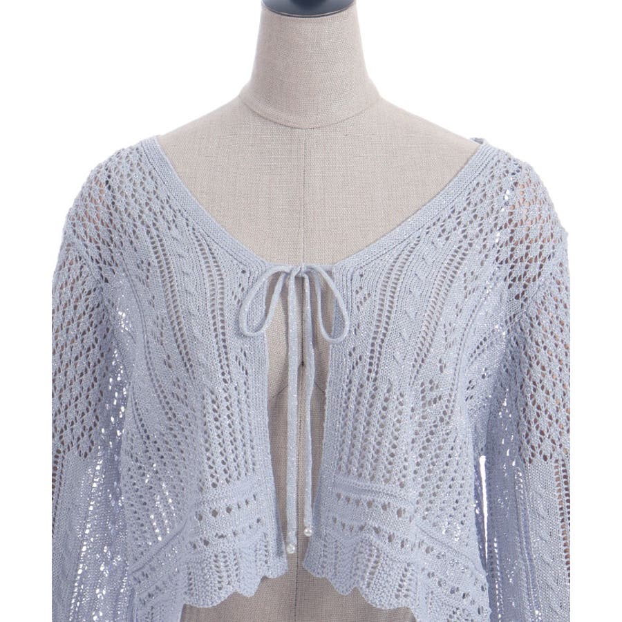 キラキララメがガーリーな透かし編みのカーデです。