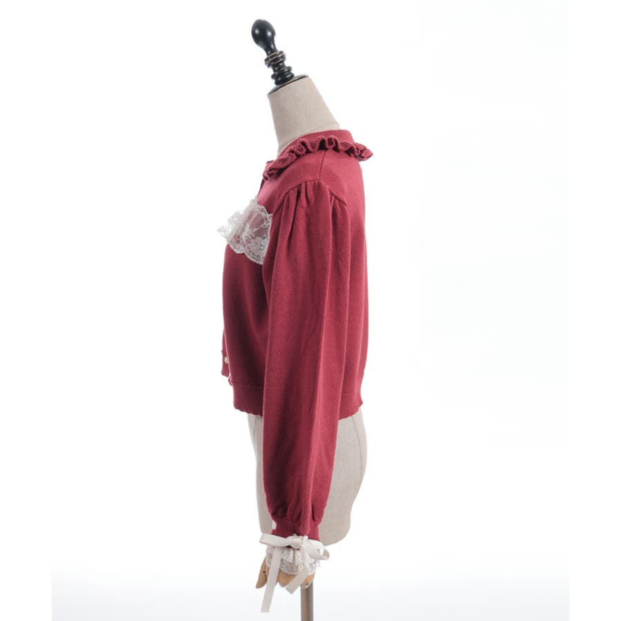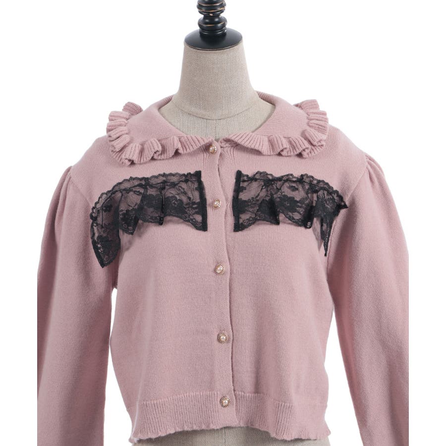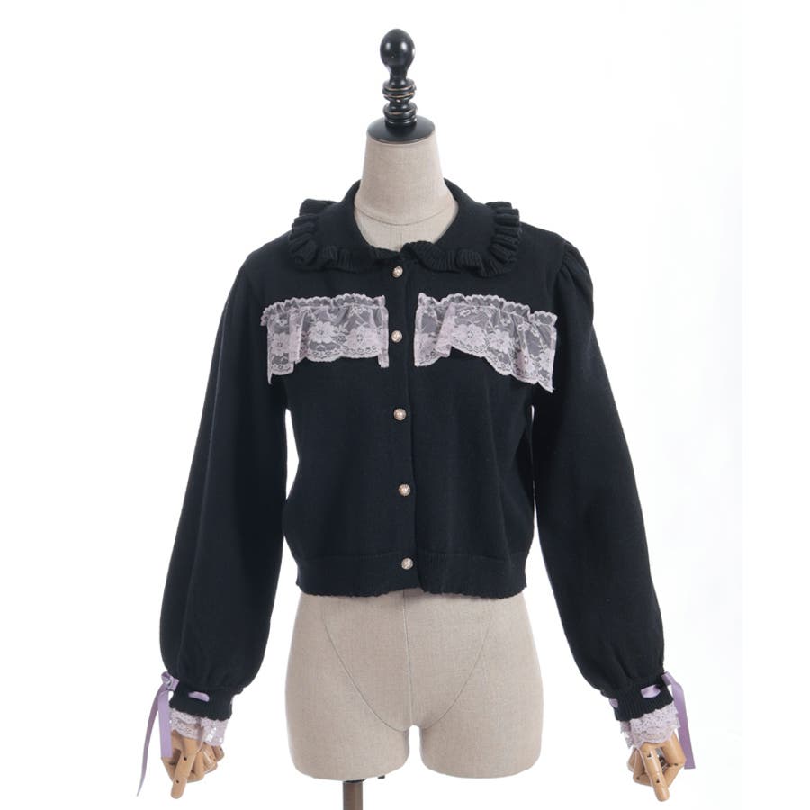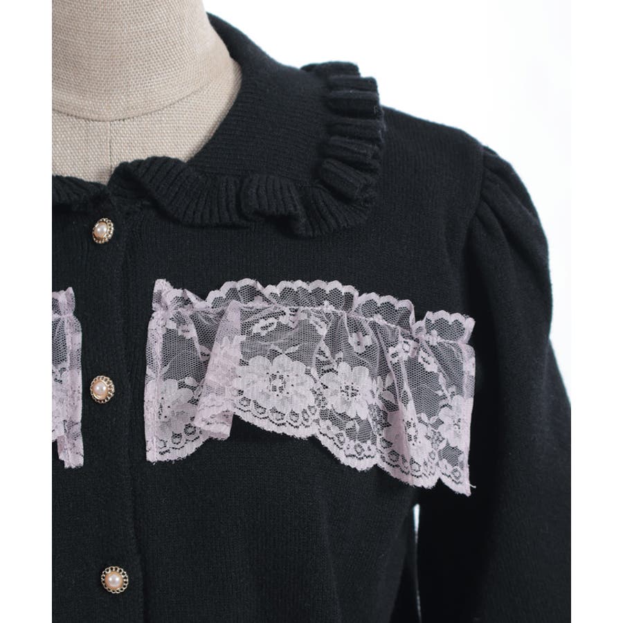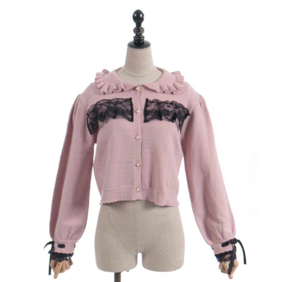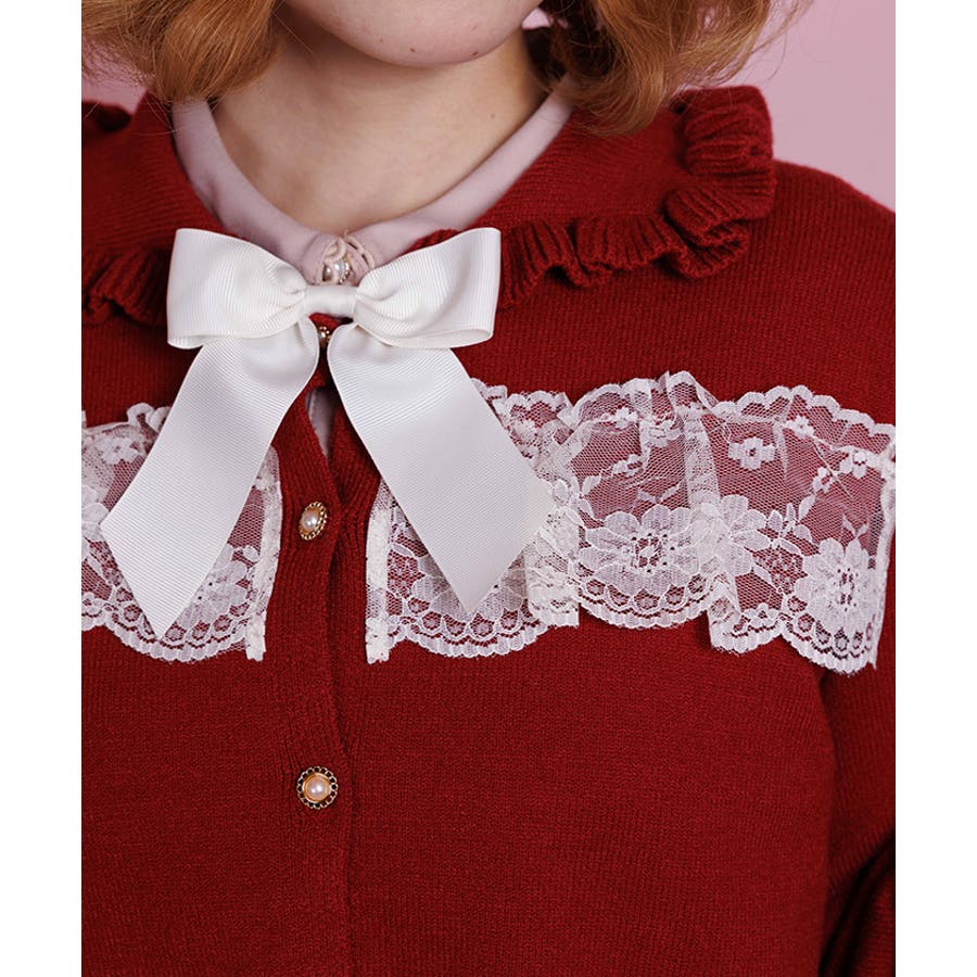 配色がガーリーなレース&梯子リボンをあしらったニットカーディガンです。