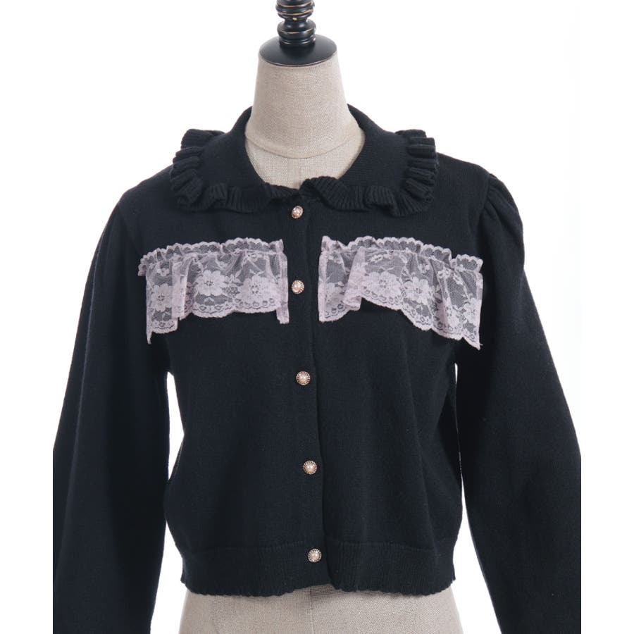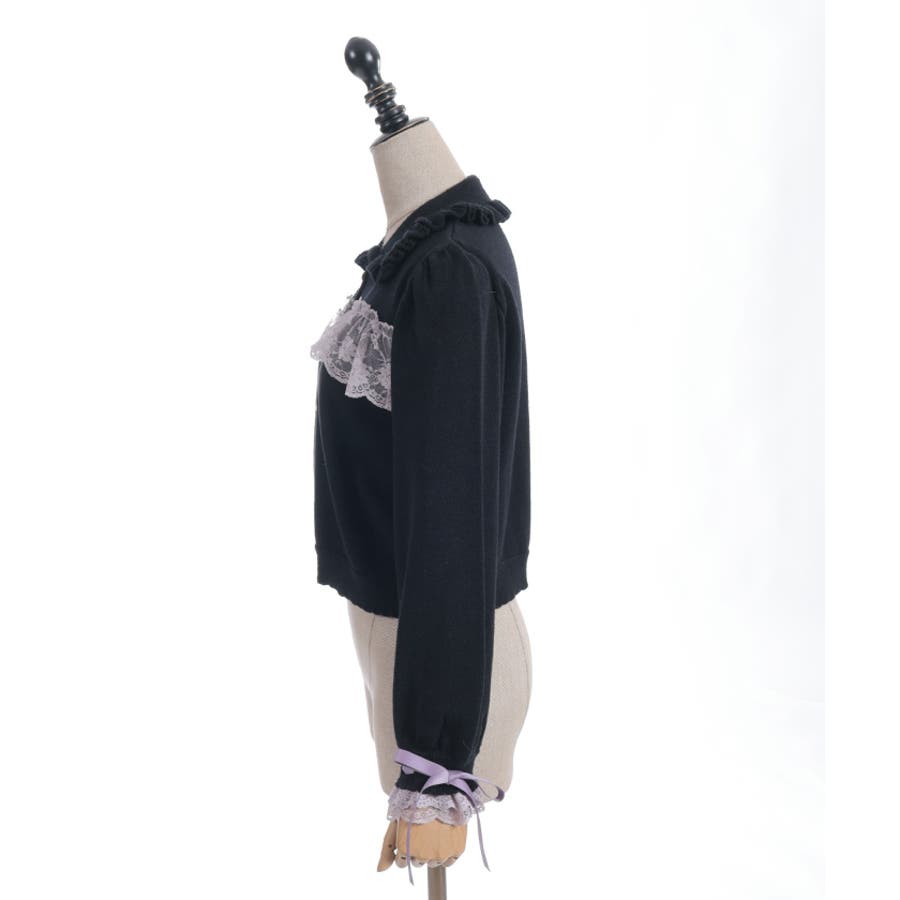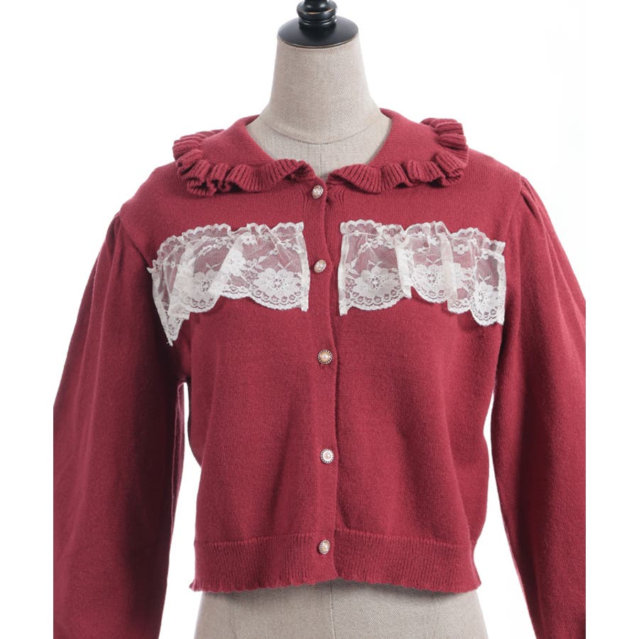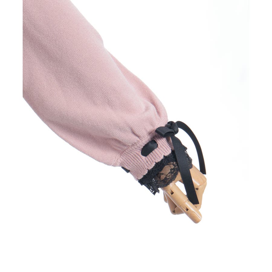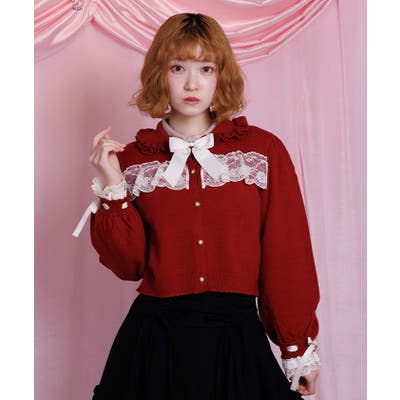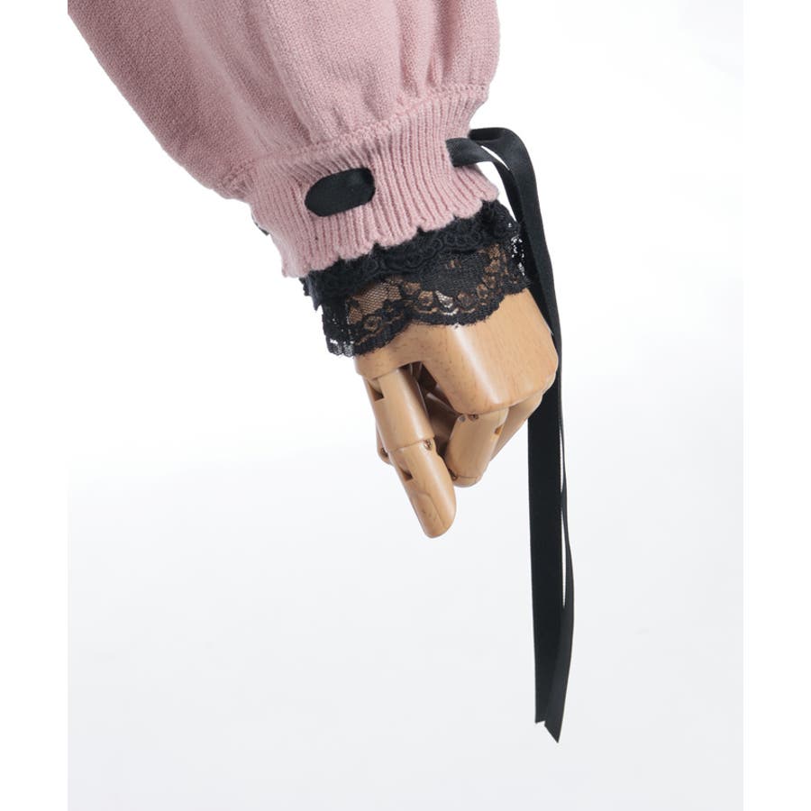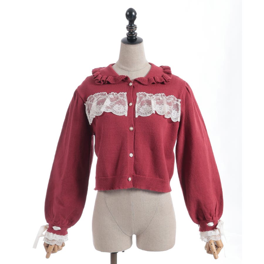 配色がガーリーなレース&梯子リボンをあしらったニットカーディガンです。