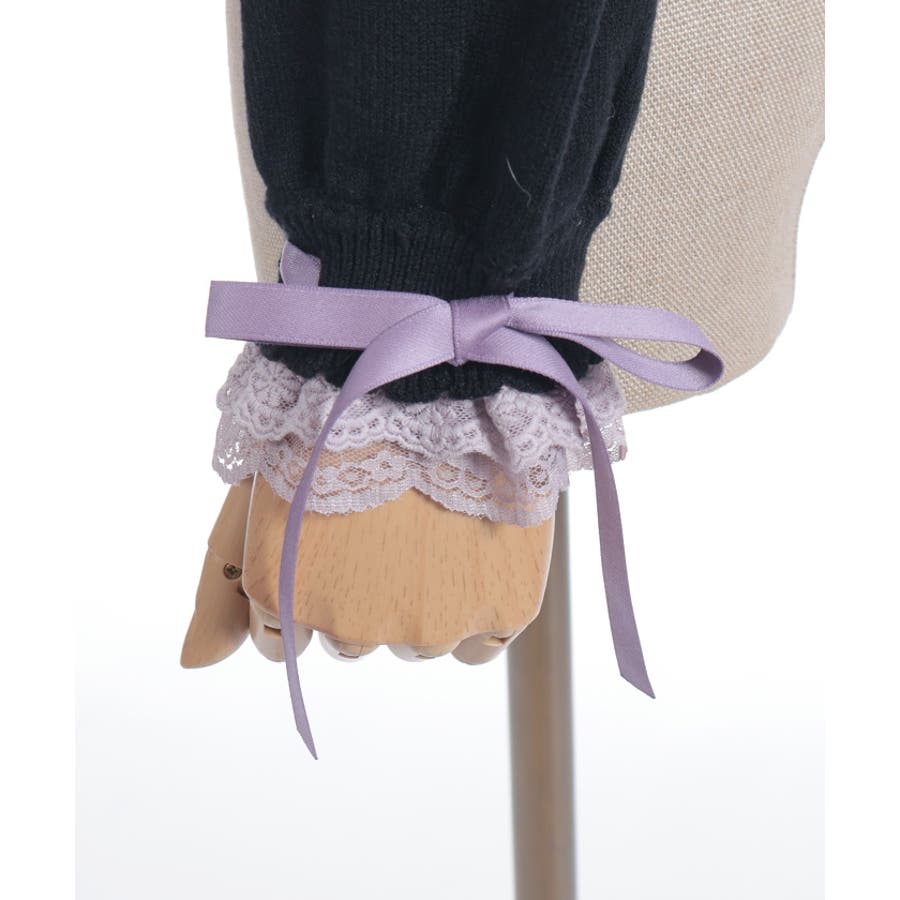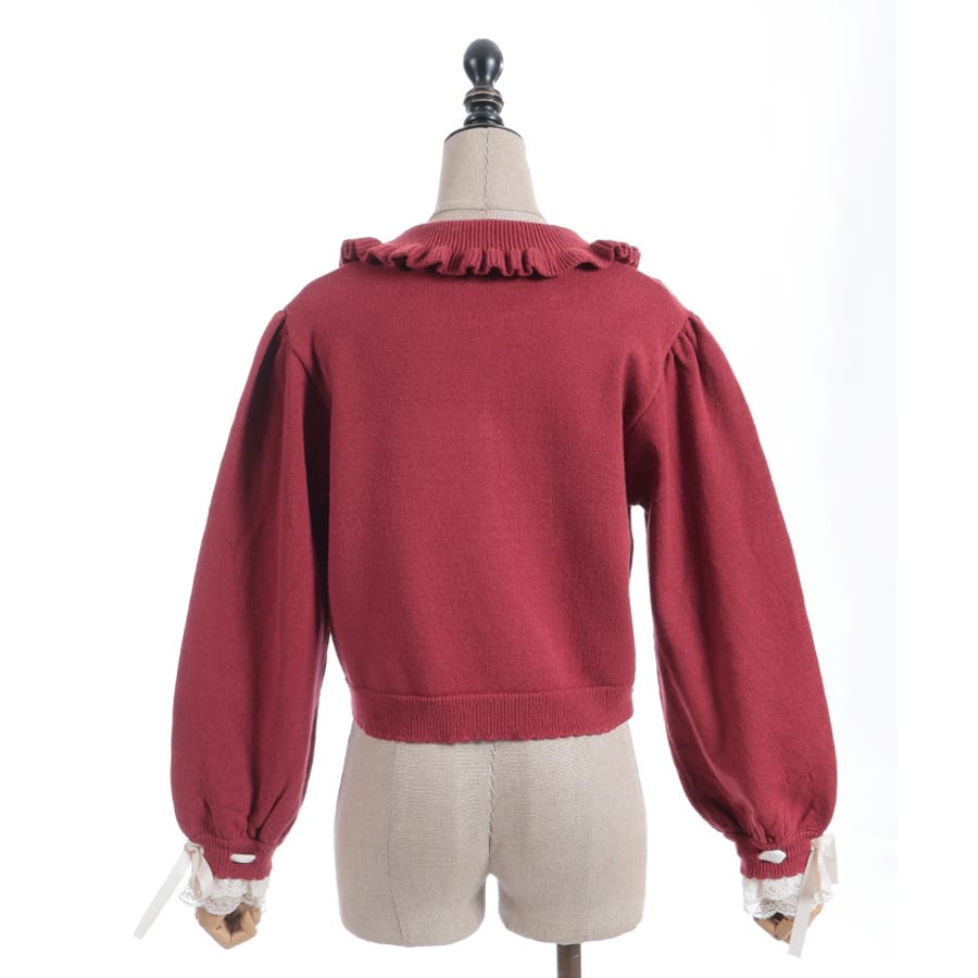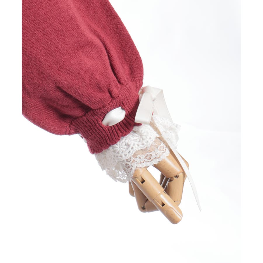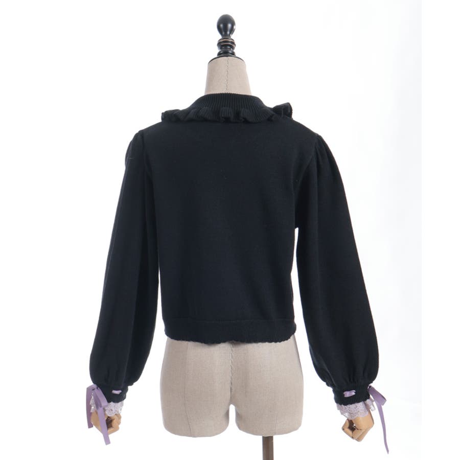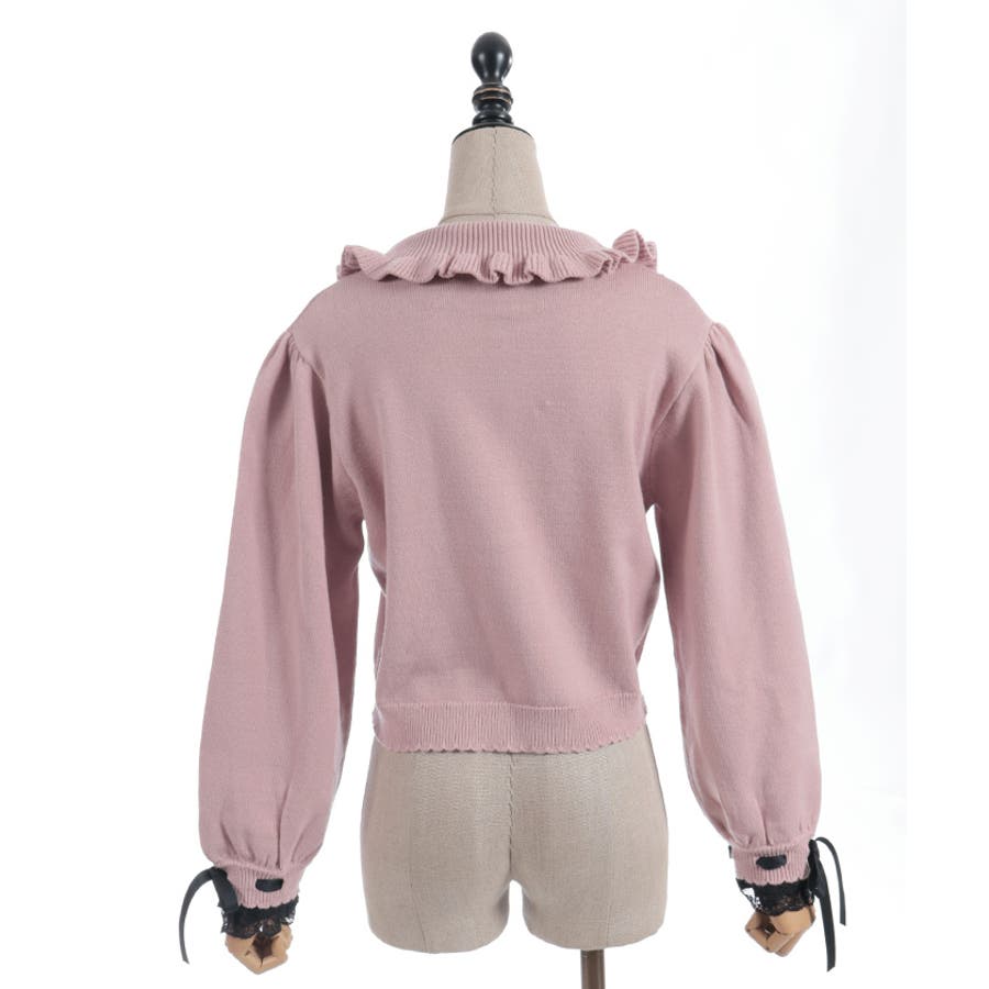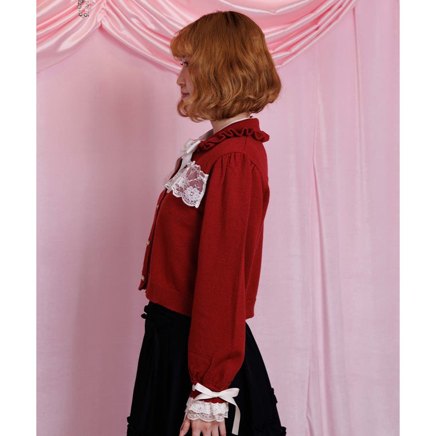 配色がガーリーなレース&梯子リボンをあしらったニットカーディガンです。