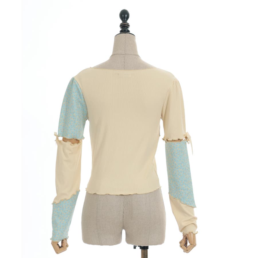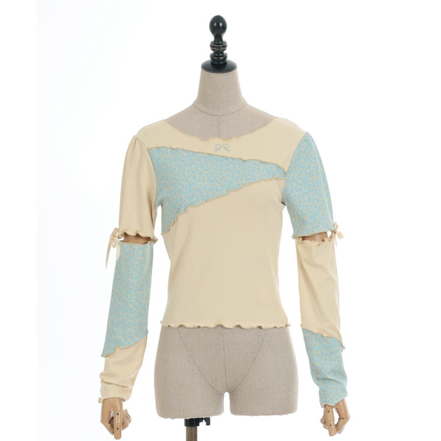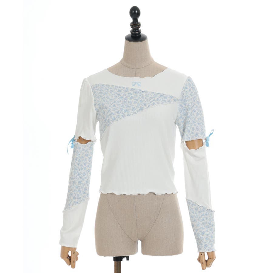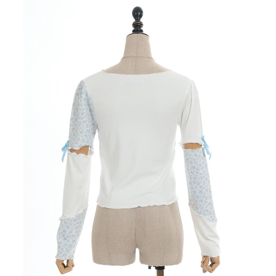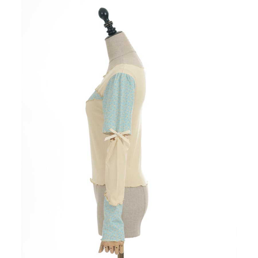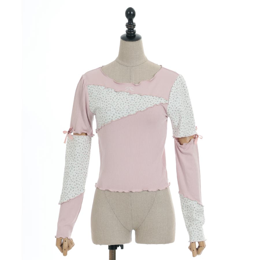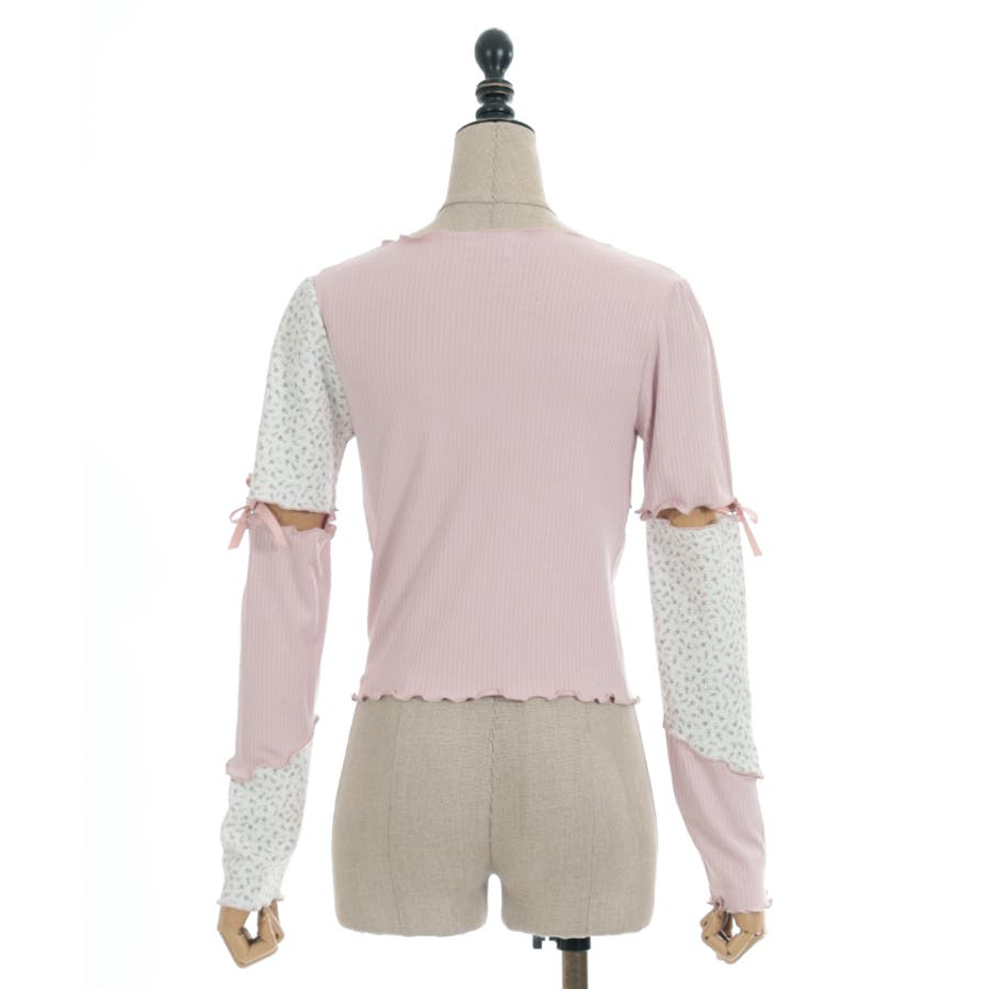 小花柄と無地がメローロックで合わさった可愛らしいデザインです。胸元にはさりげなくリボンの刺繍をあしらっています。袖はリボンで取り外しができ、夏場まで着用できます。