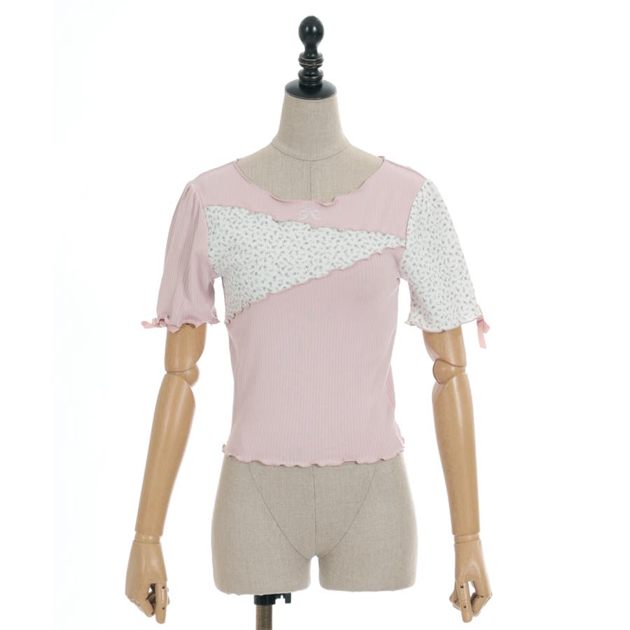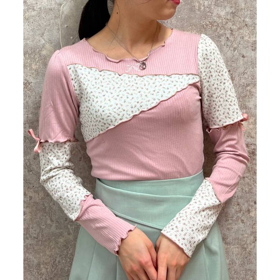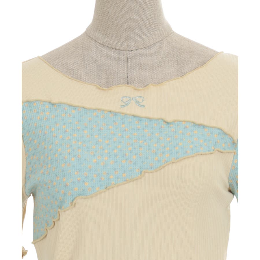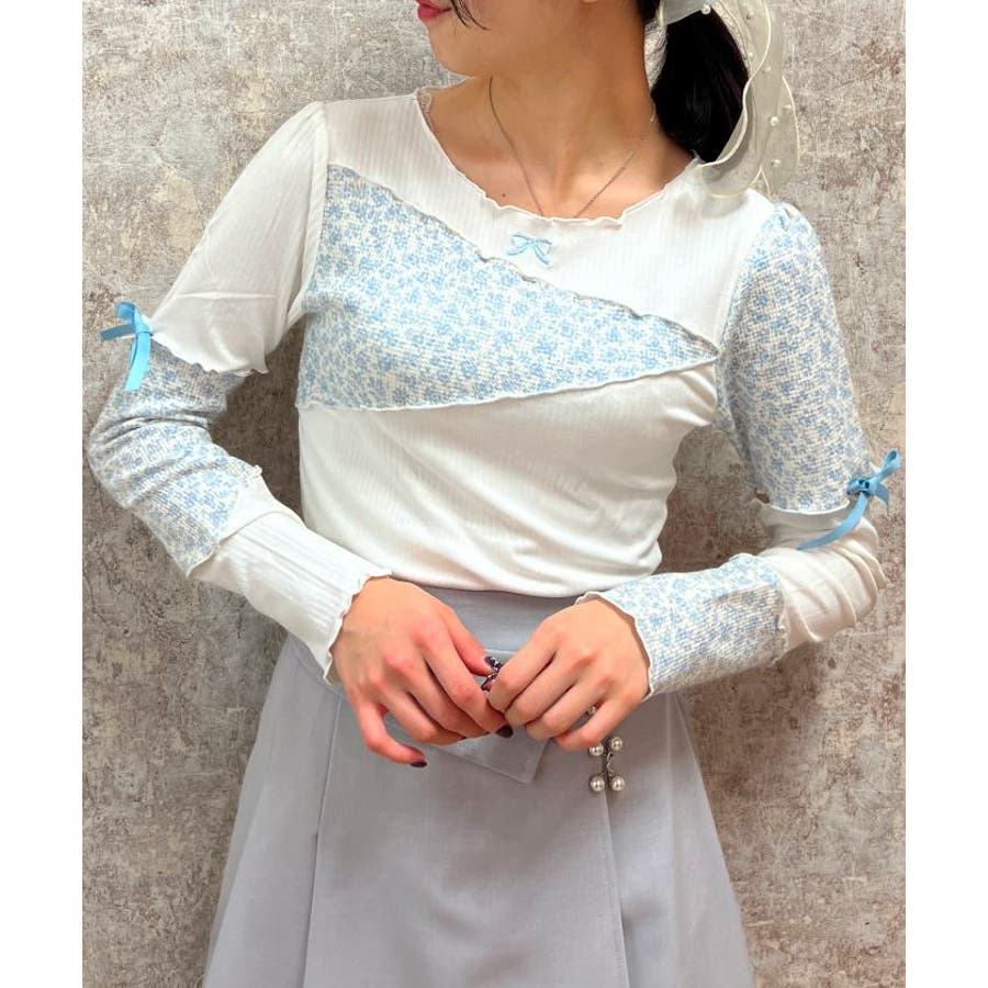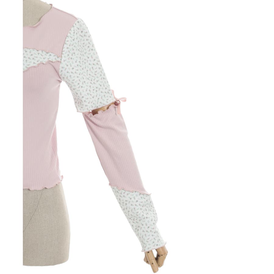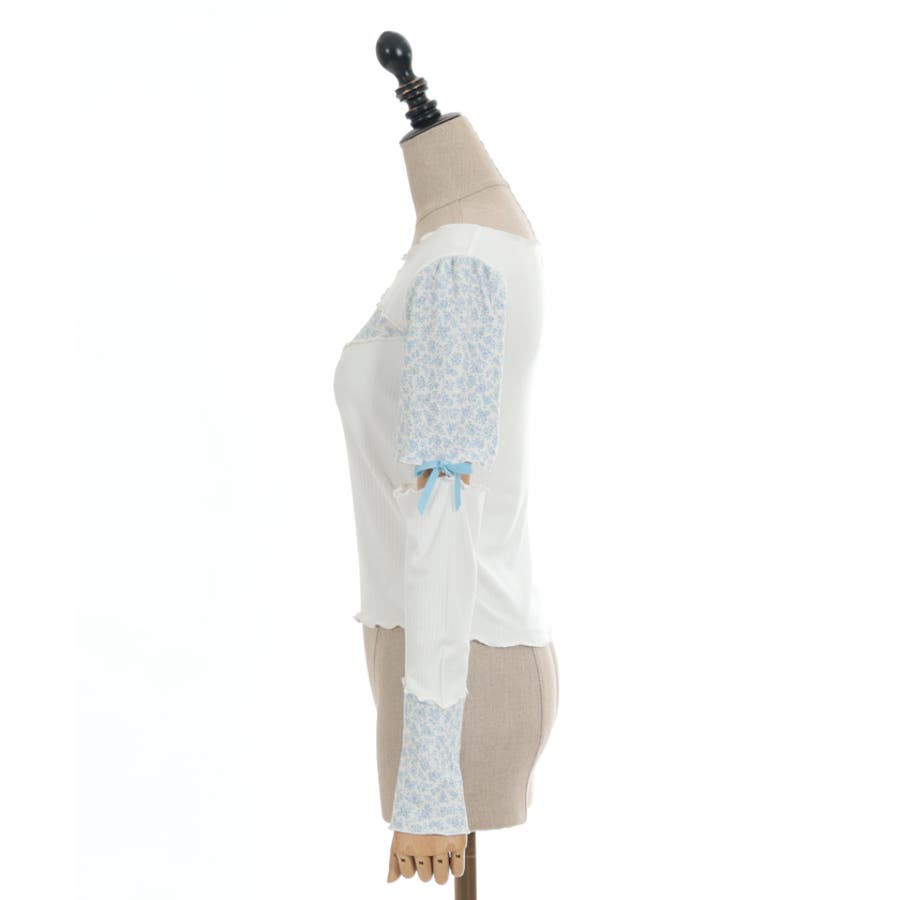 小花柄と無地がメローロックで合わさった可愛らしいデザインです。胸元にはさりげなくリボンの刺繍をあしらっています。袖はリボンで取り外しができ、夏場まで着用できます。