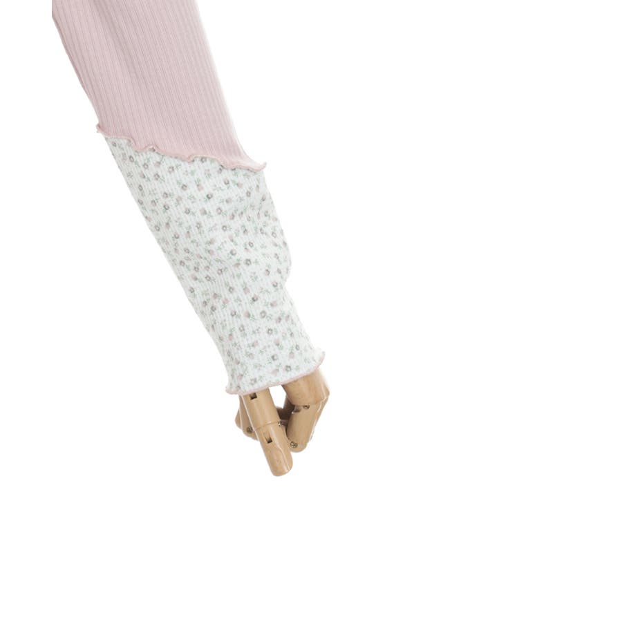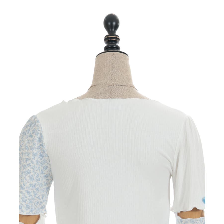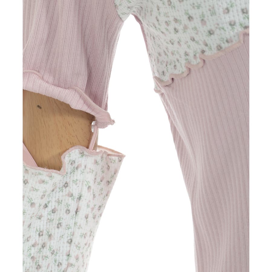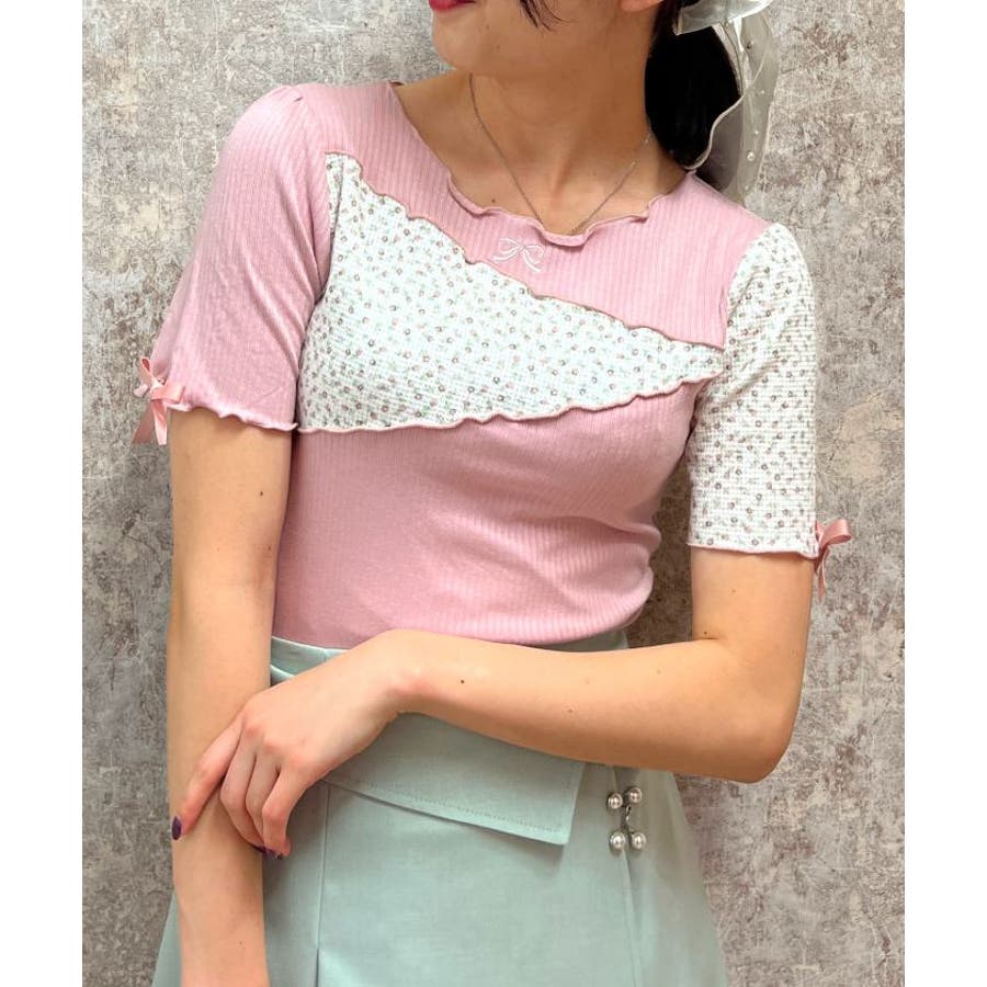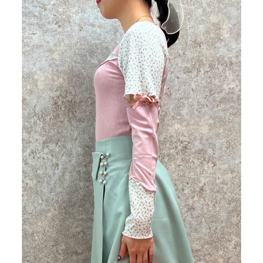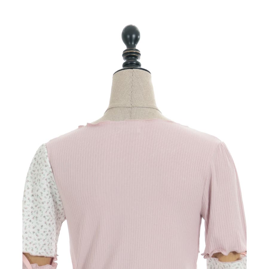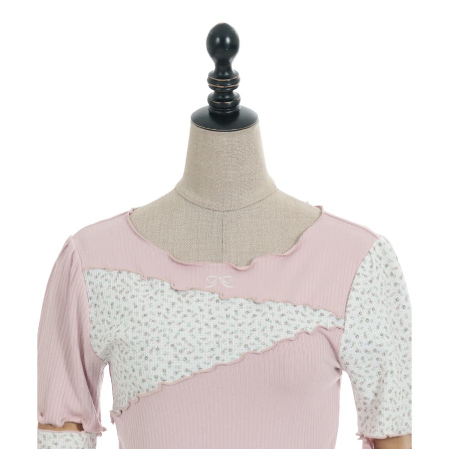 小花柄と無地がメローロックで合わさった可愛らしいデザインです。胸元にはさりげなくリボンの刺繍をあしらっています。袖はリボンで取り外しができ、夏場まで着用できます。
