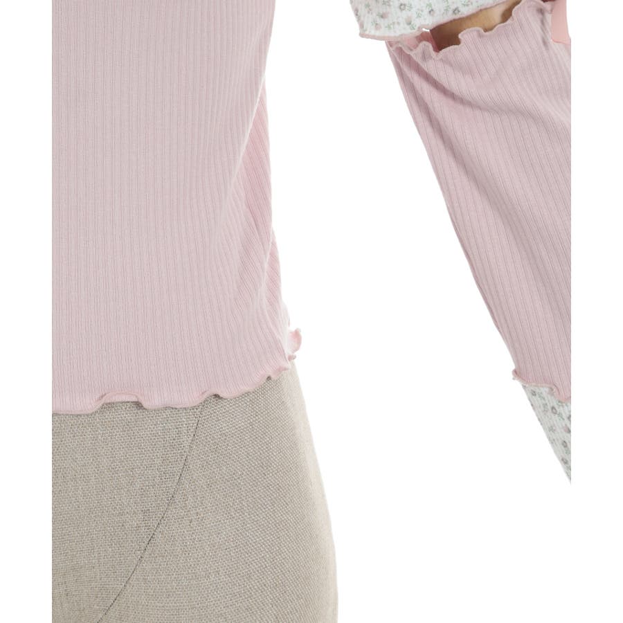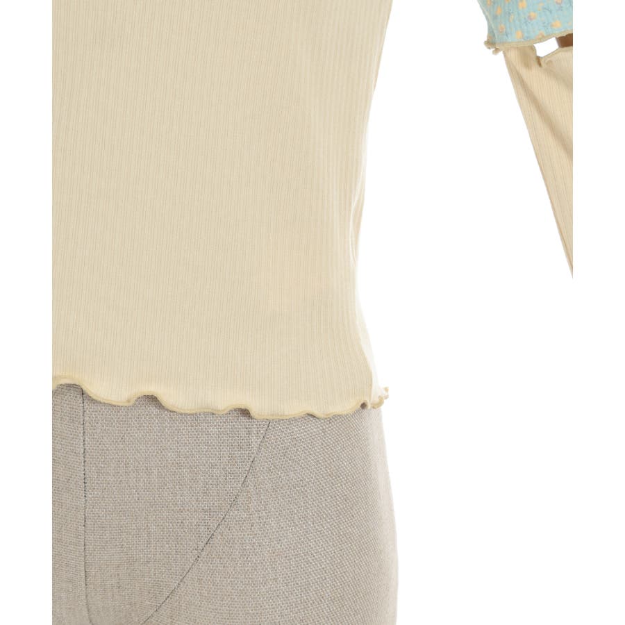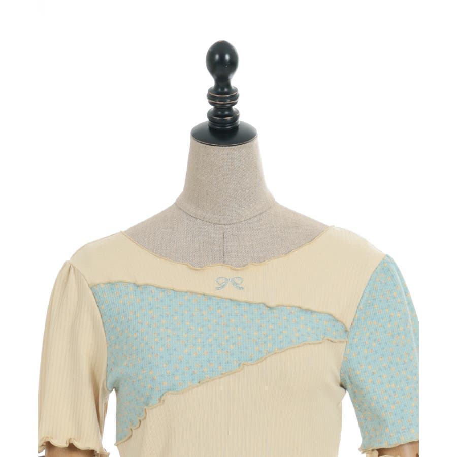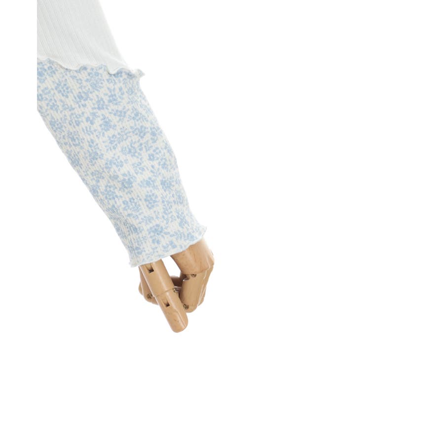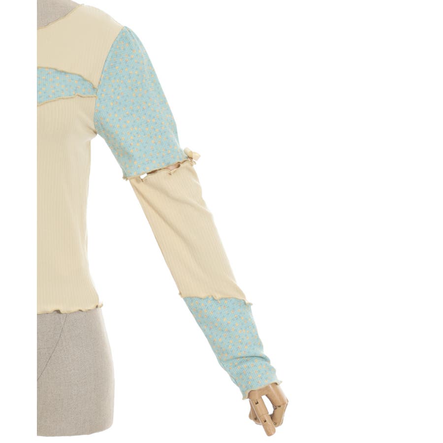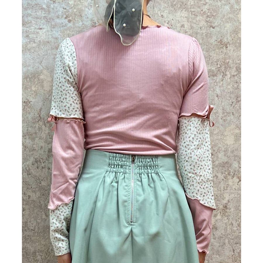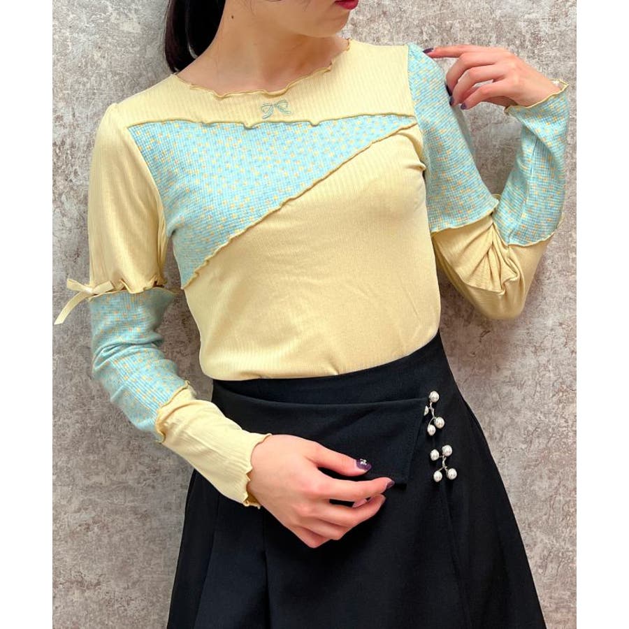 小花柄と無地がメローロックで合わさった可愛らしいデザインです。胸元にはさりげなくリボンの刺繍をあしらっています。袖はリボンで取り外しができ、夏場まで着用できます。