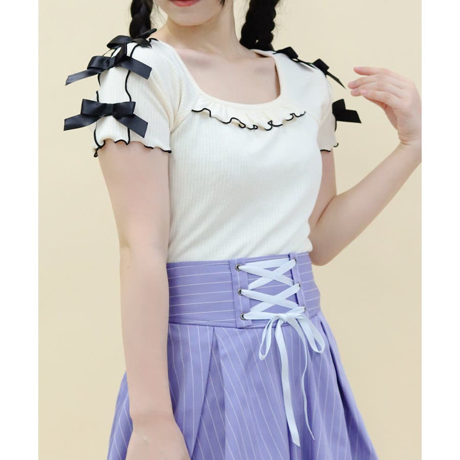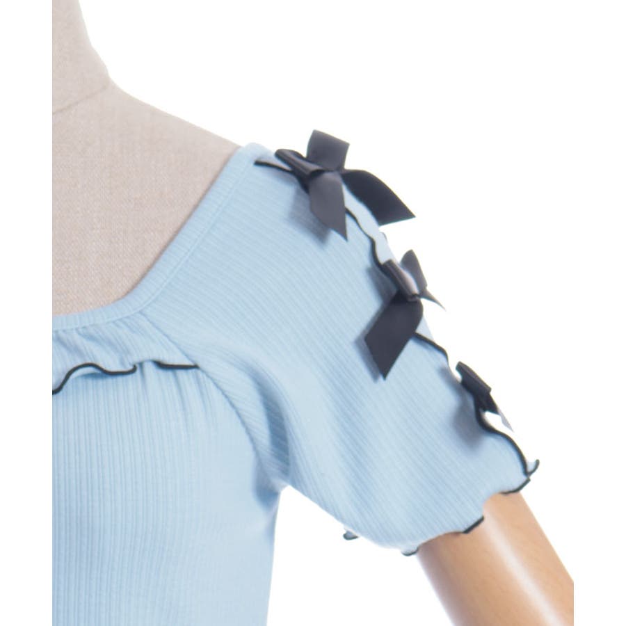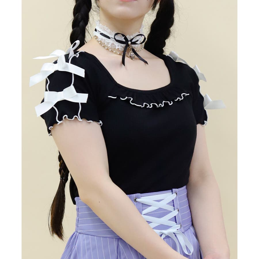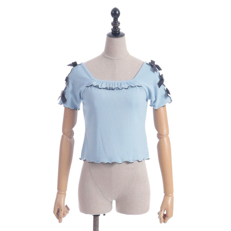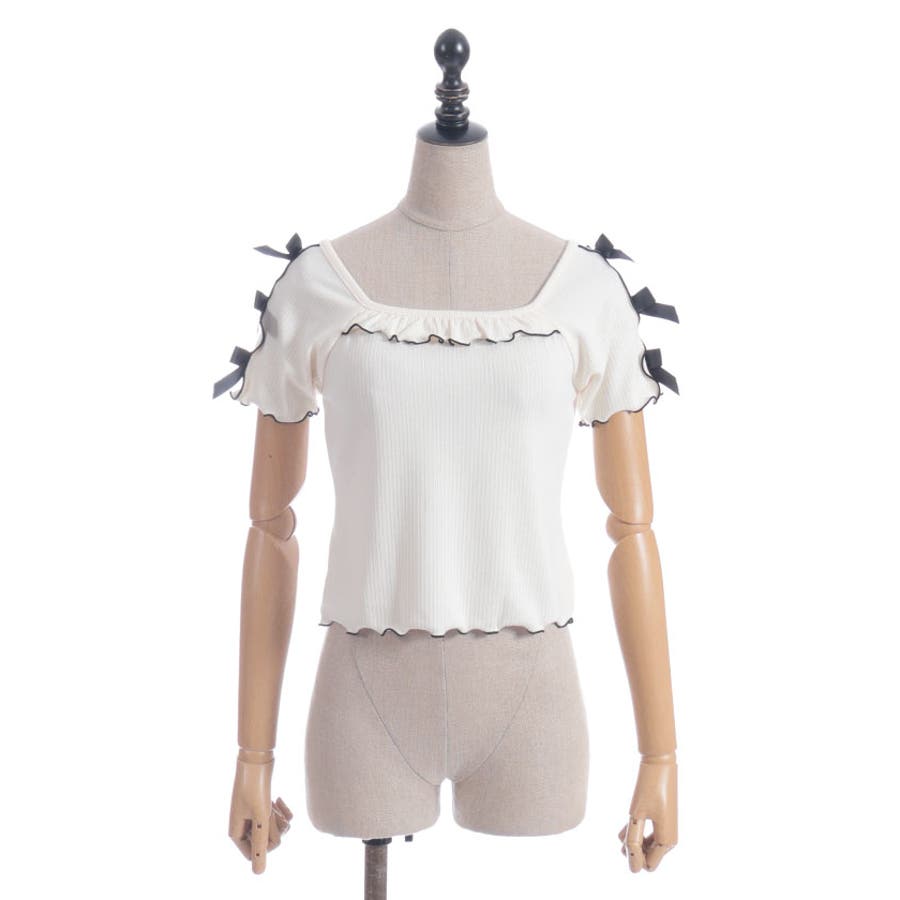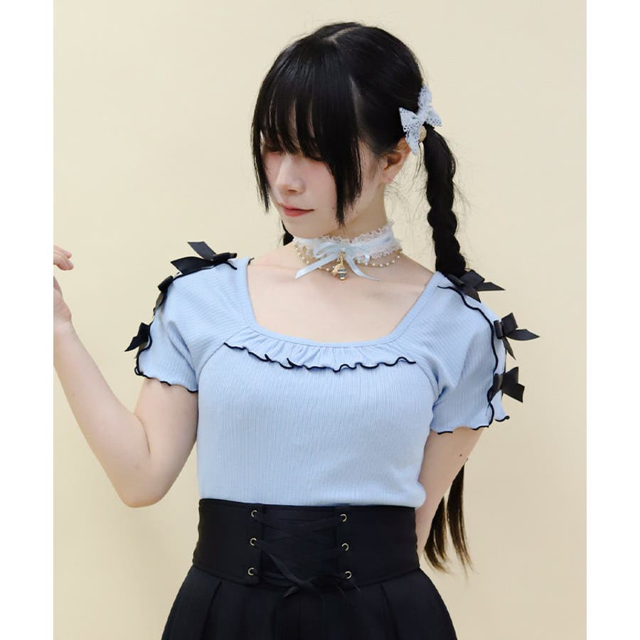 カジュアルになりがちなカットトップスをリボンやフリルで飾ったアイテムです。