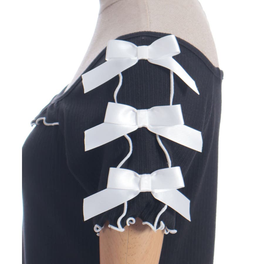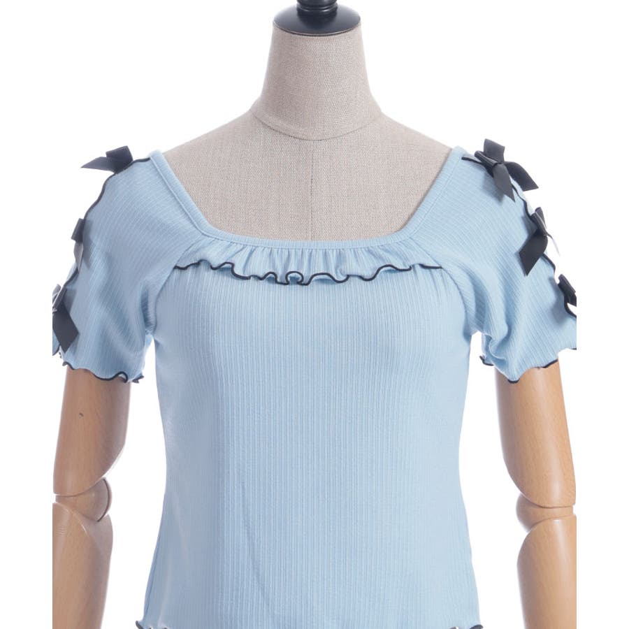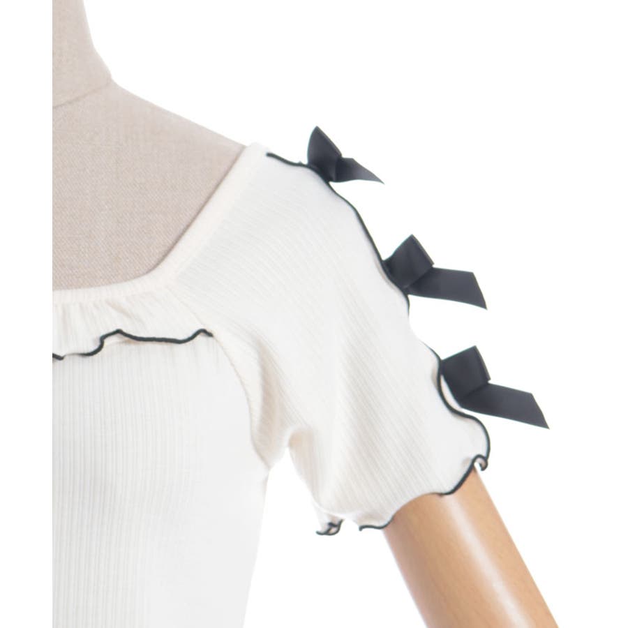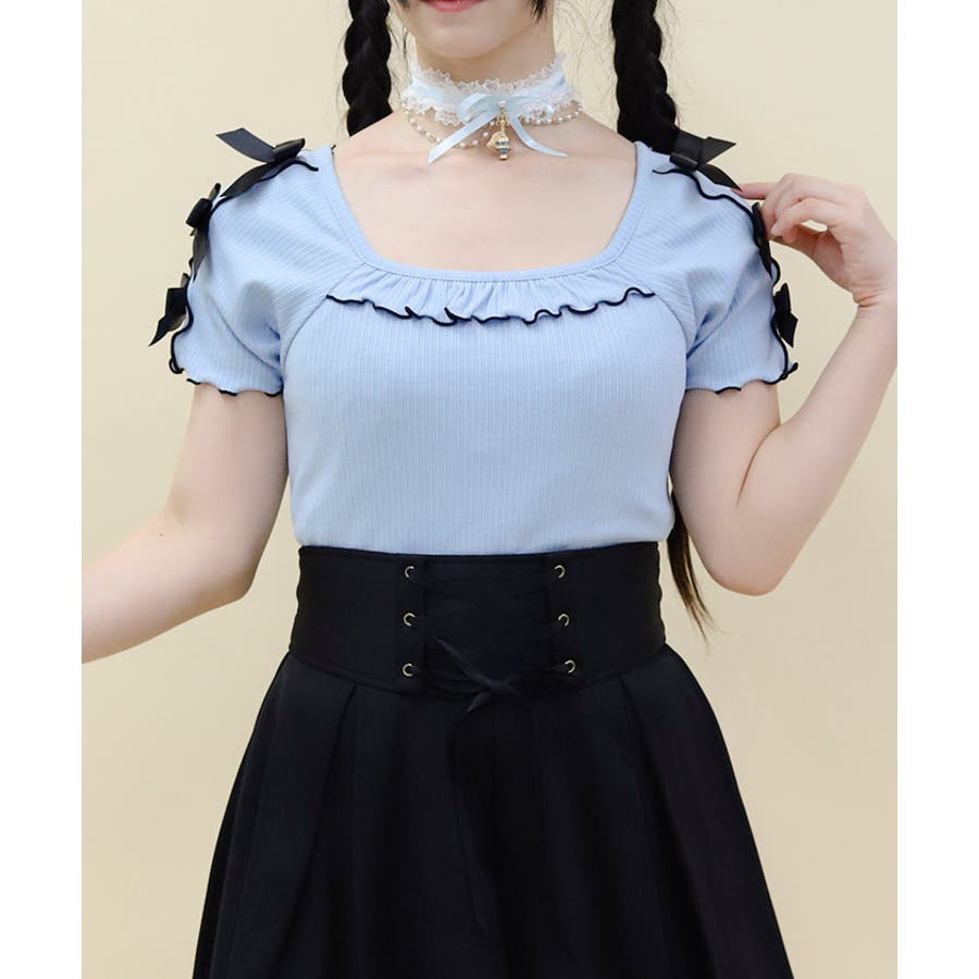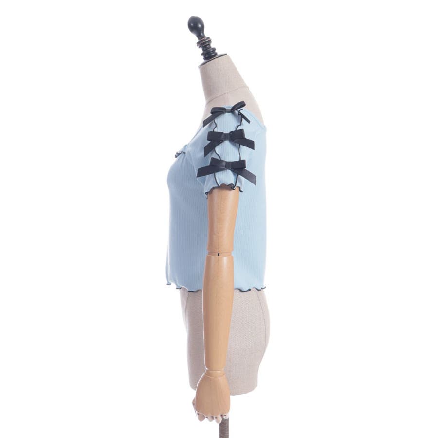 カジュアルになりがちなカットトップスをリボンやフリルで飾ったアイテムです。