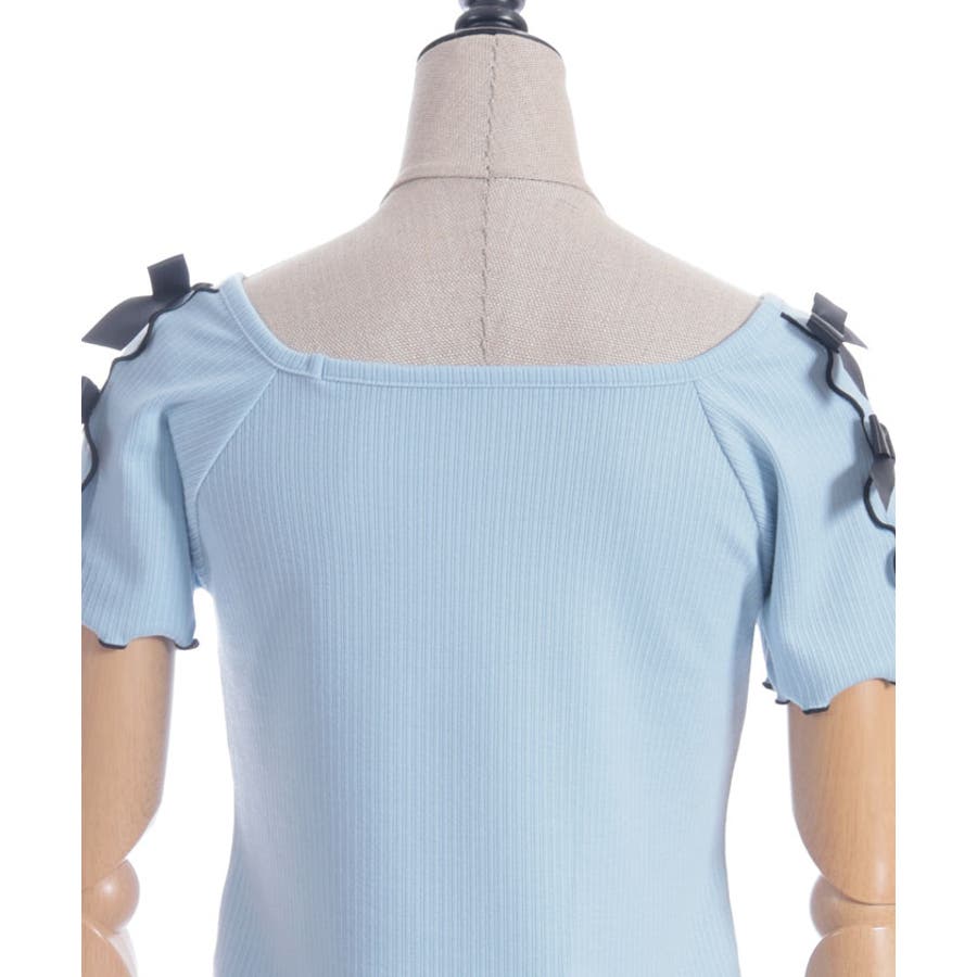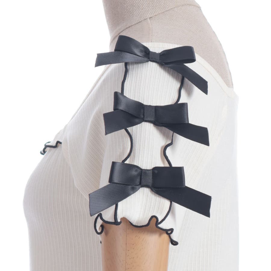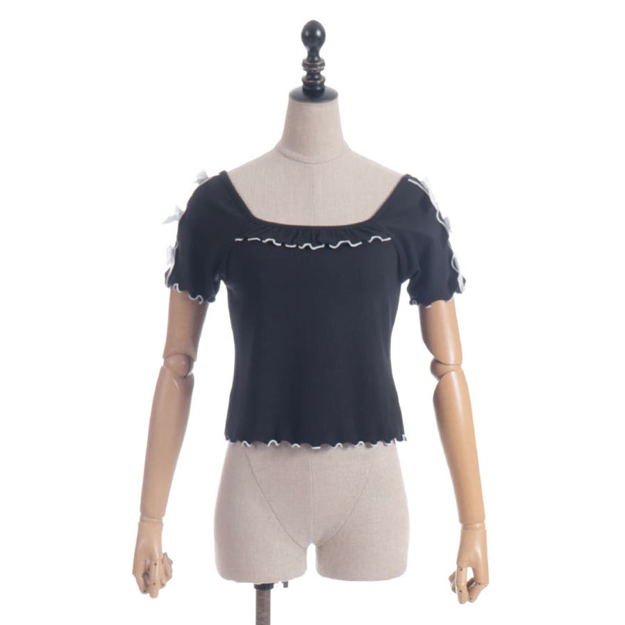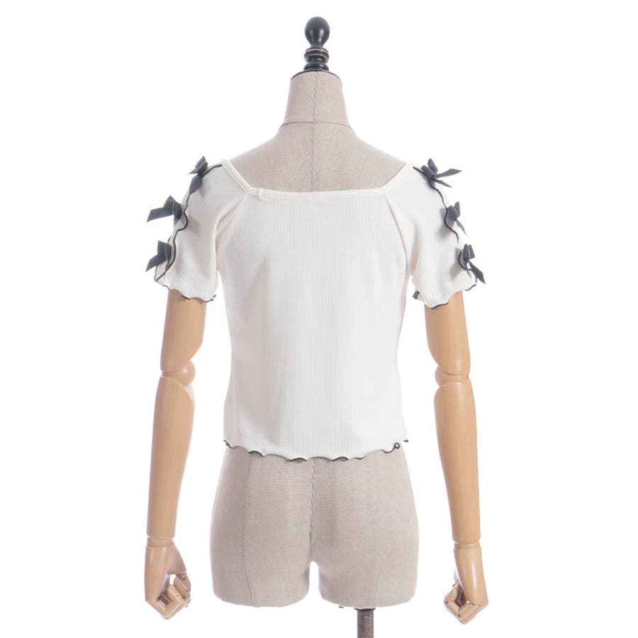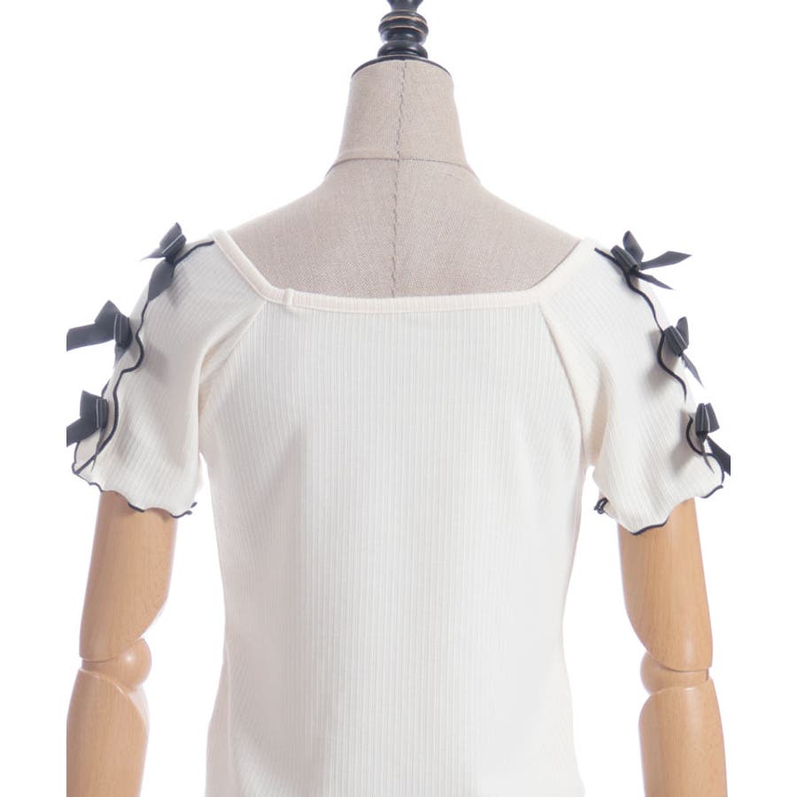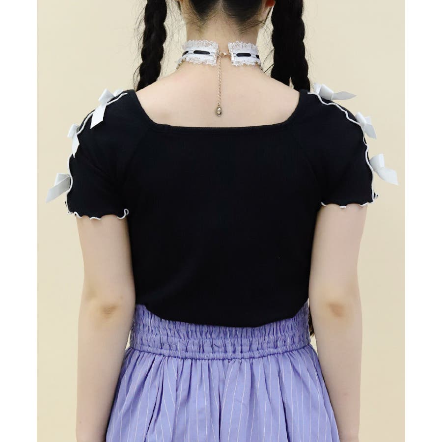 カジュアルになりがちなカットトップスをリボンやフリルで飾ったアイテムです。