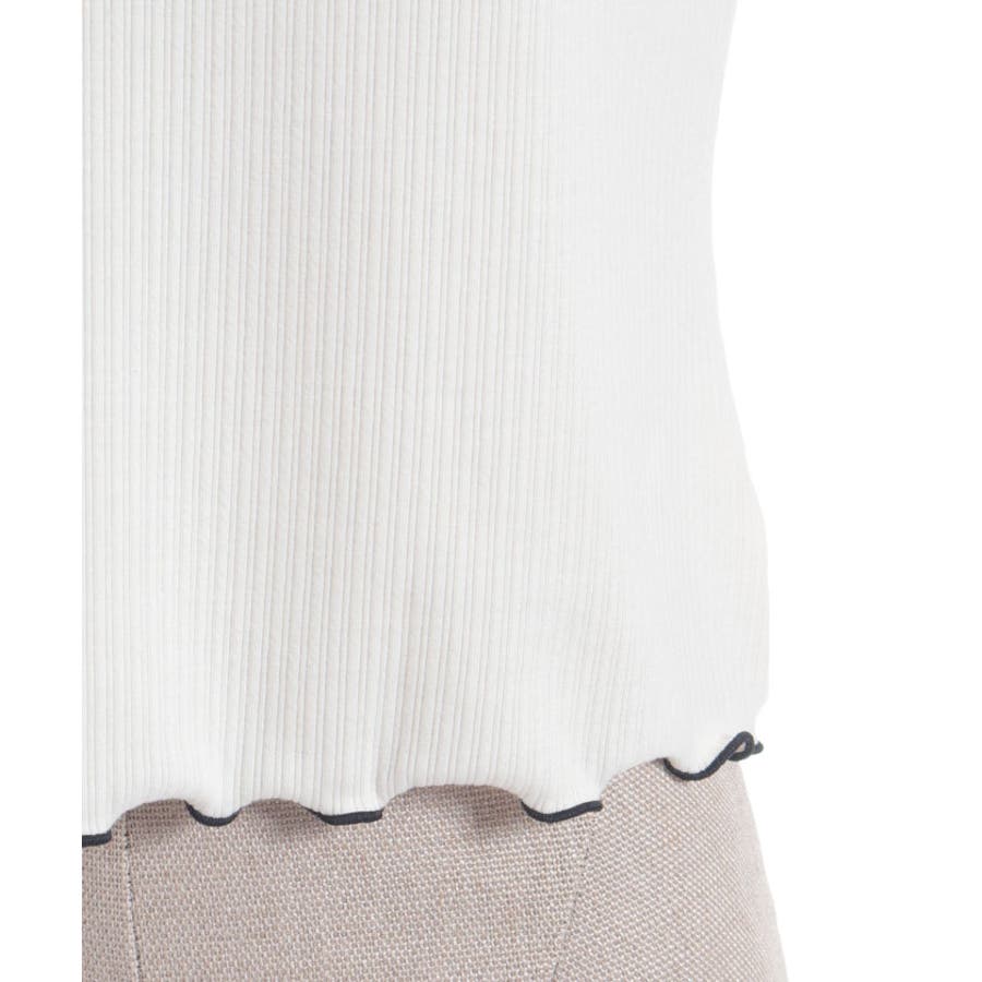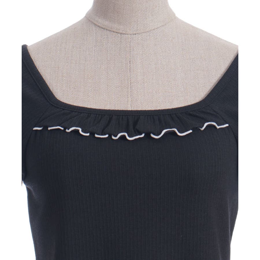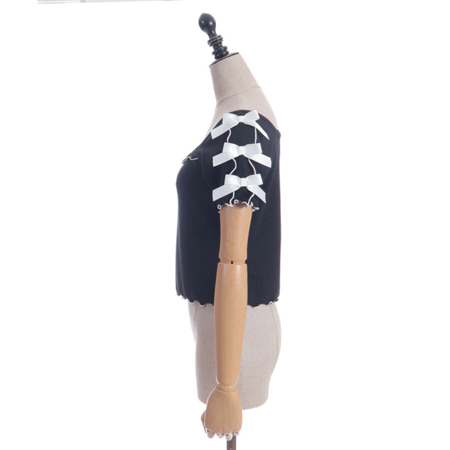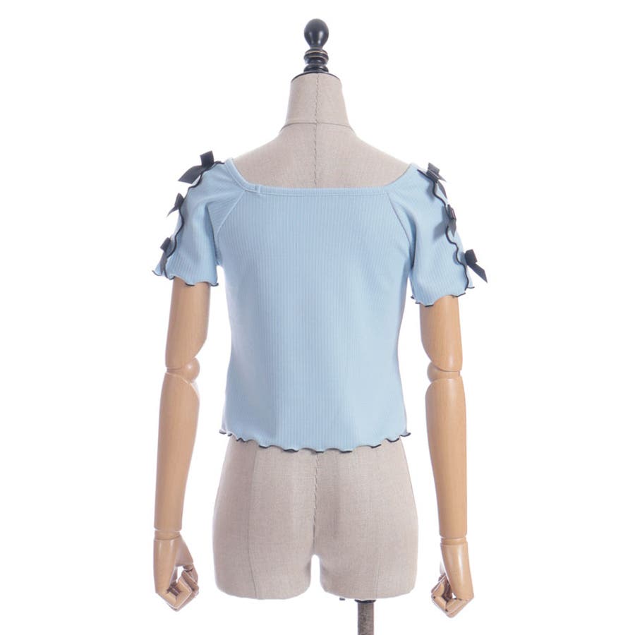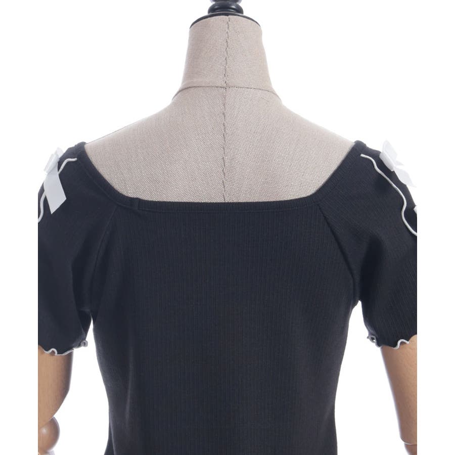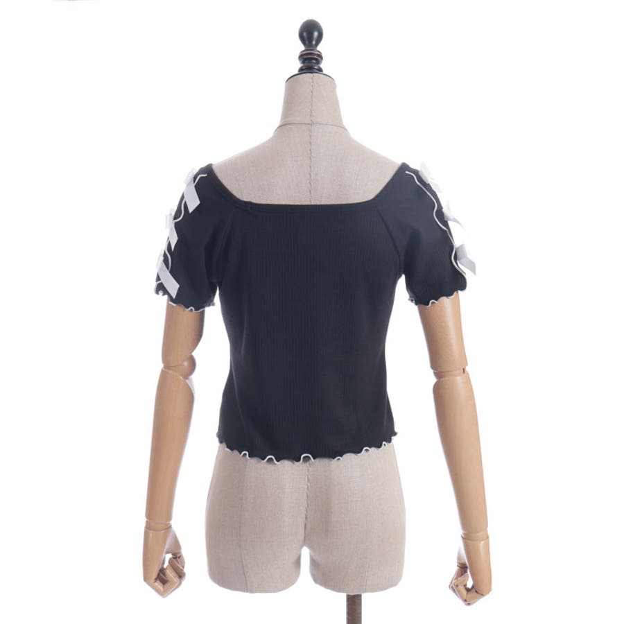 カジュアルになりがちなカットトップスをリボンやフリルで飾ったアイテムです。
