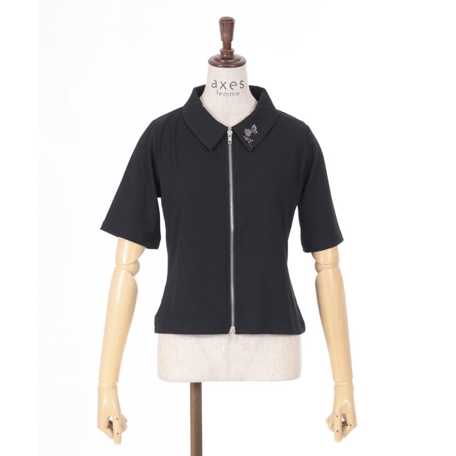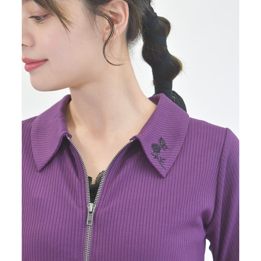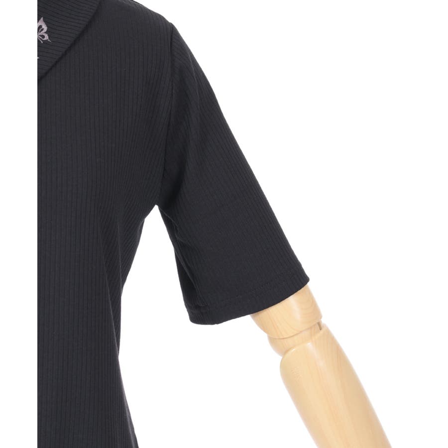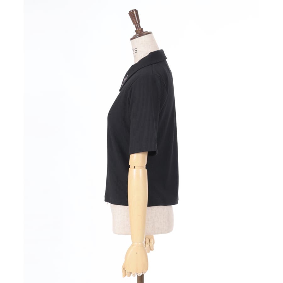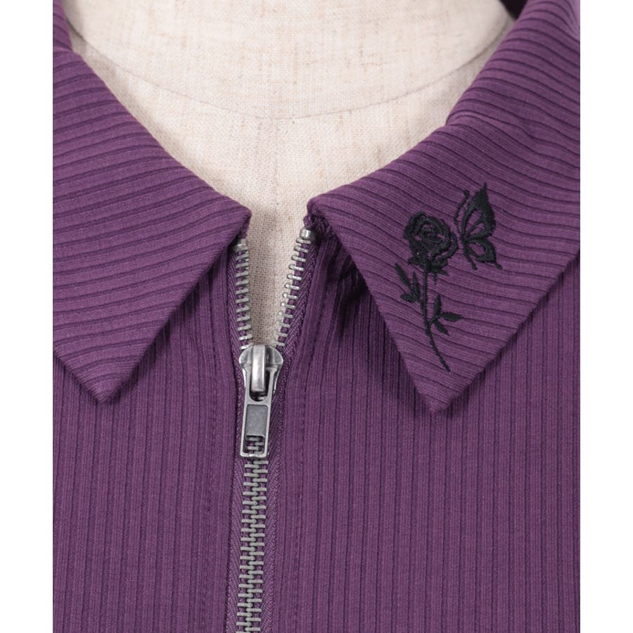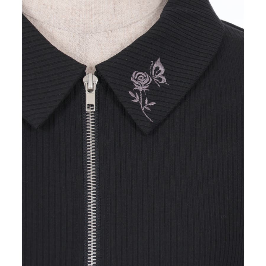 ストライプ見えするリブで全体的にすっきりとしたシルエットに◎。襟先にはローズ・バタフライ刺繍をワンカラーであしらいアクセントに♪