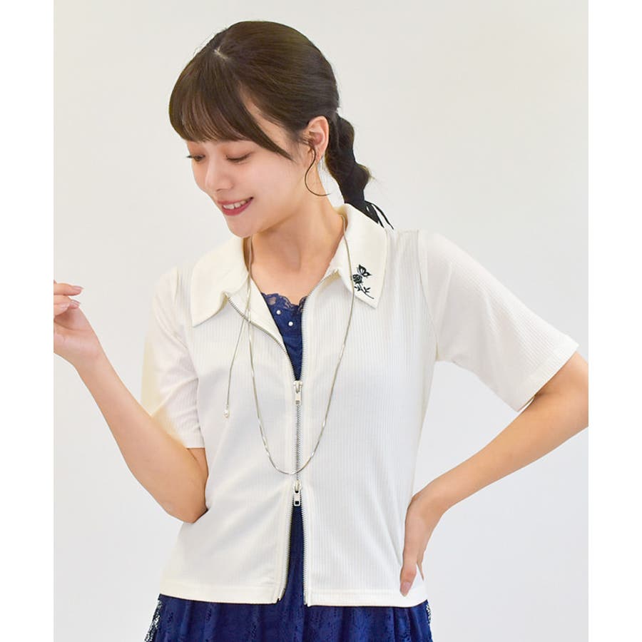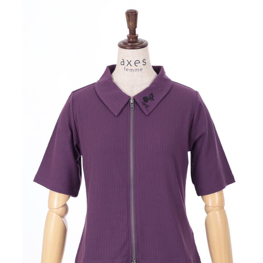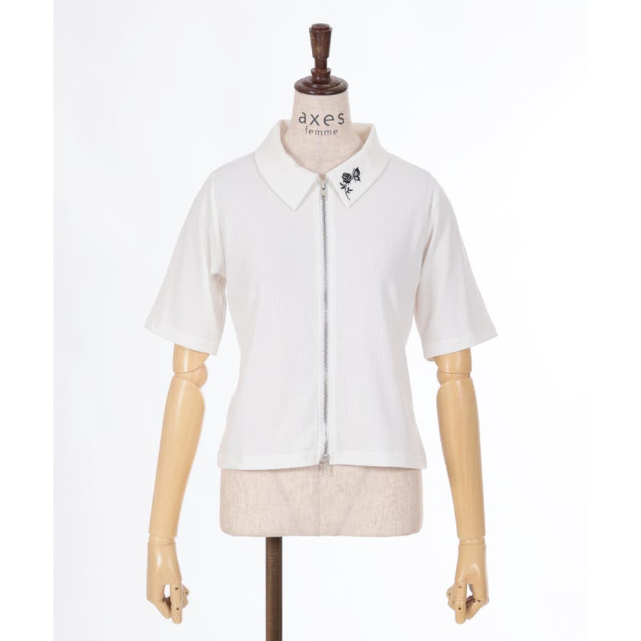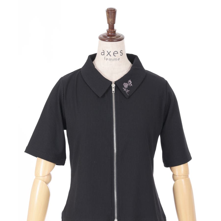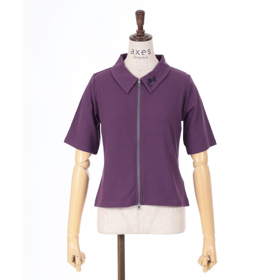 ストライプ見えするリブで全体的にすっきりとしたシルエットに◎。襟先にはローズ・バタフライ刺繍をワンカラーであしらいアクセントに♪