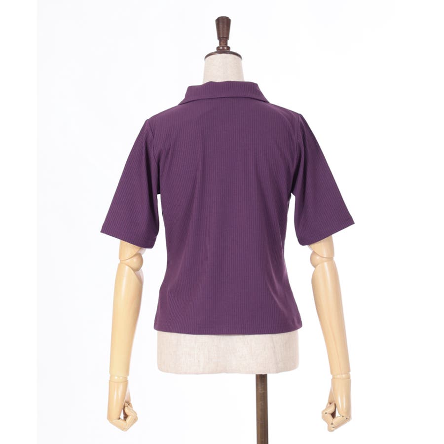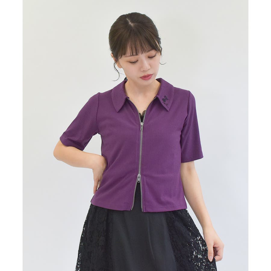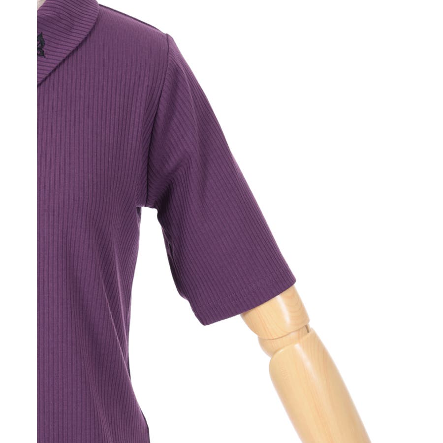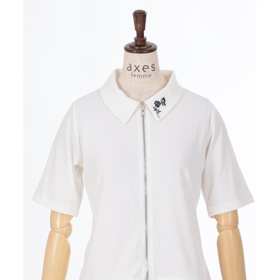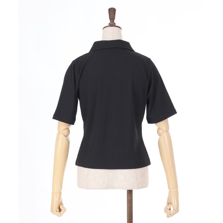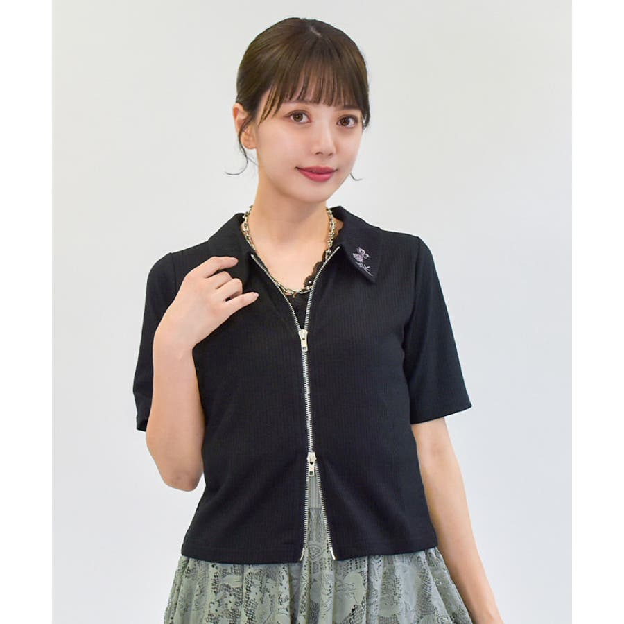 ストライプ見えするリブで全体的にすっきりとしたシルエットに◎。襟先にはローズ・バタフライ刺繍をワンカラーであしらいアクセントに♪