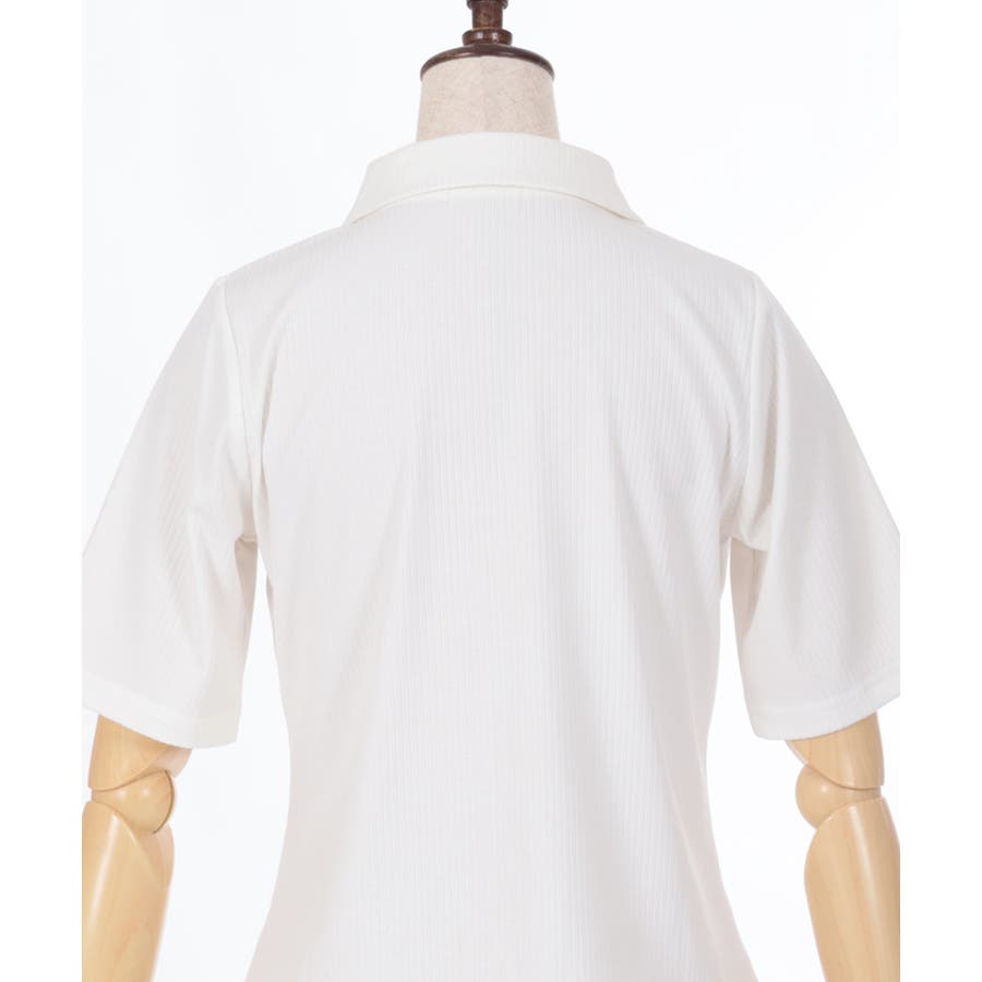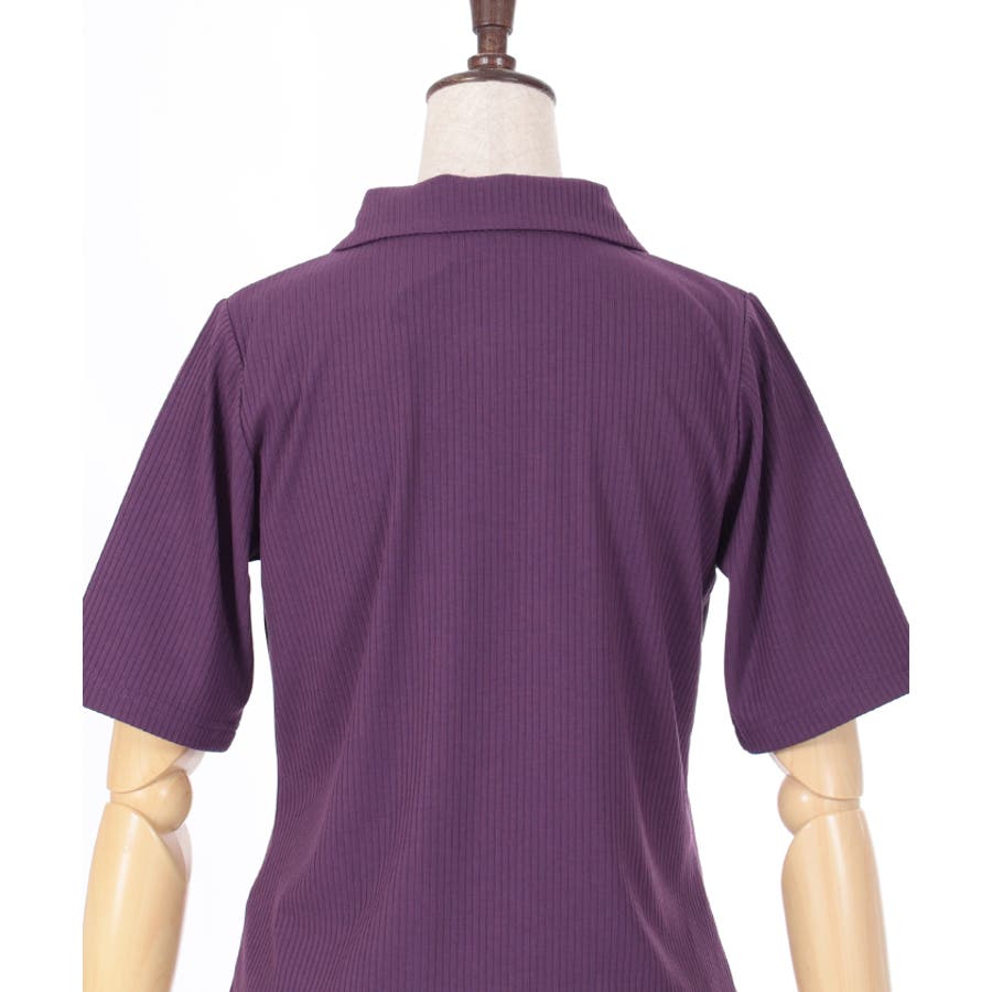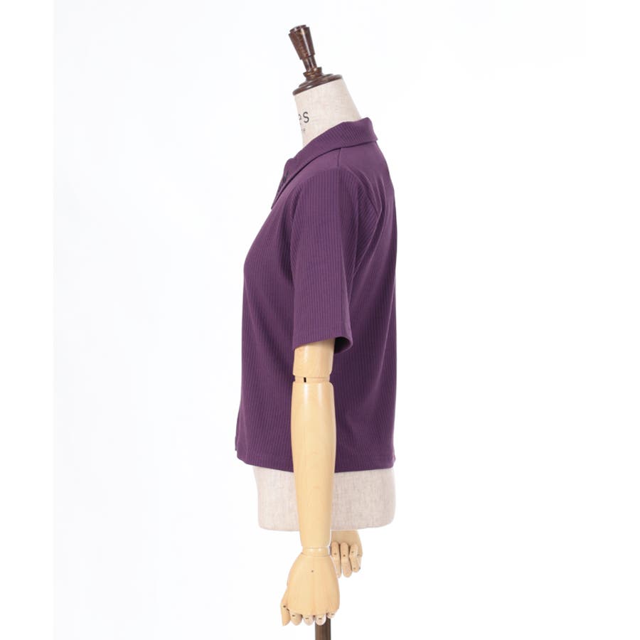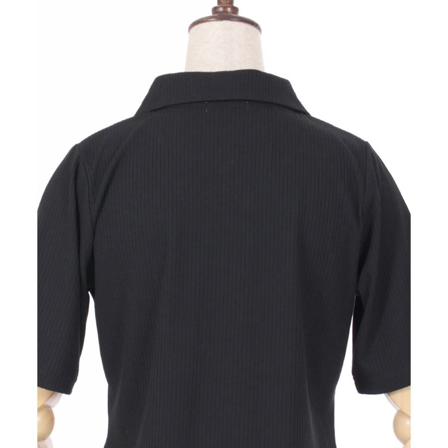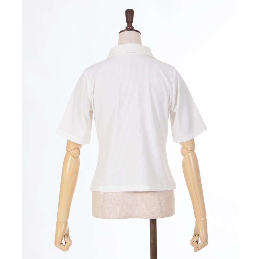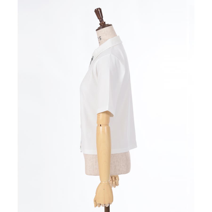 ストライプ見えするリブで全体的にすっきりとしたシルエットに◎。襟先にはローズ・バタフライ刺繍をワンカラーであしらいアクセントに♪