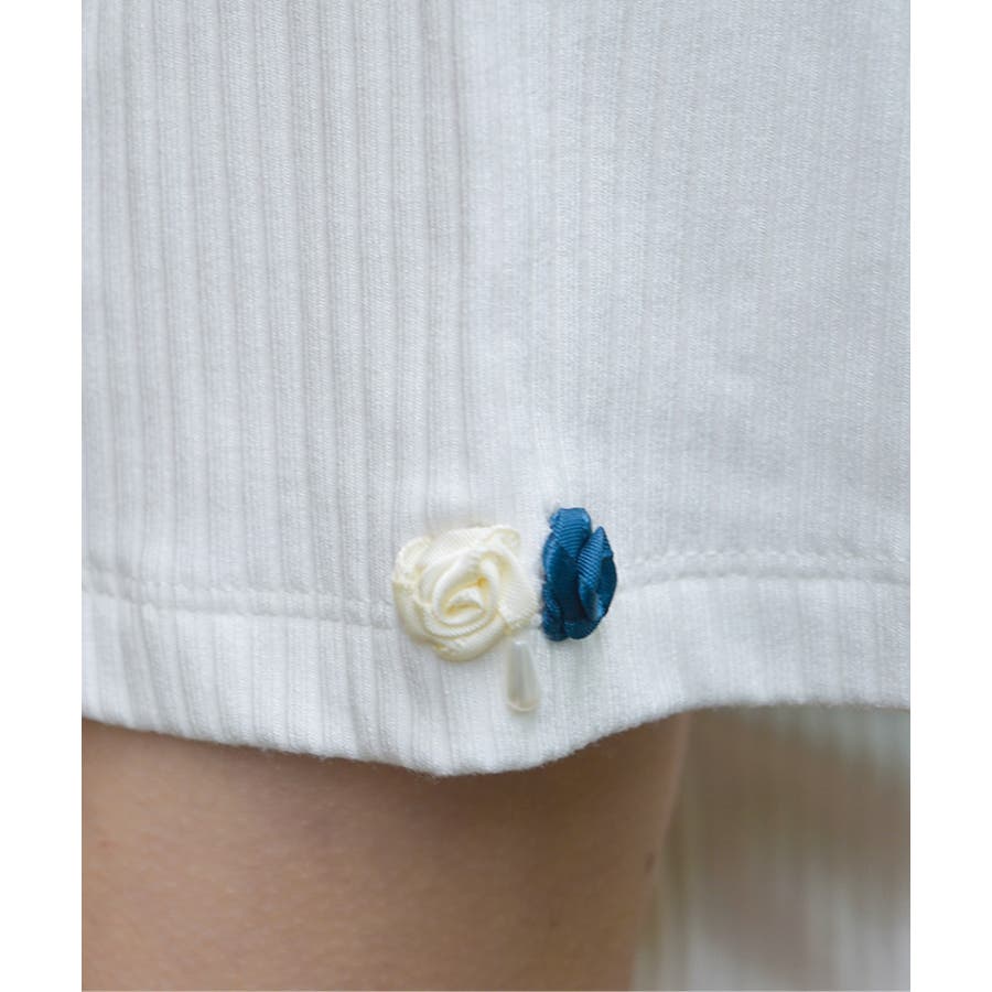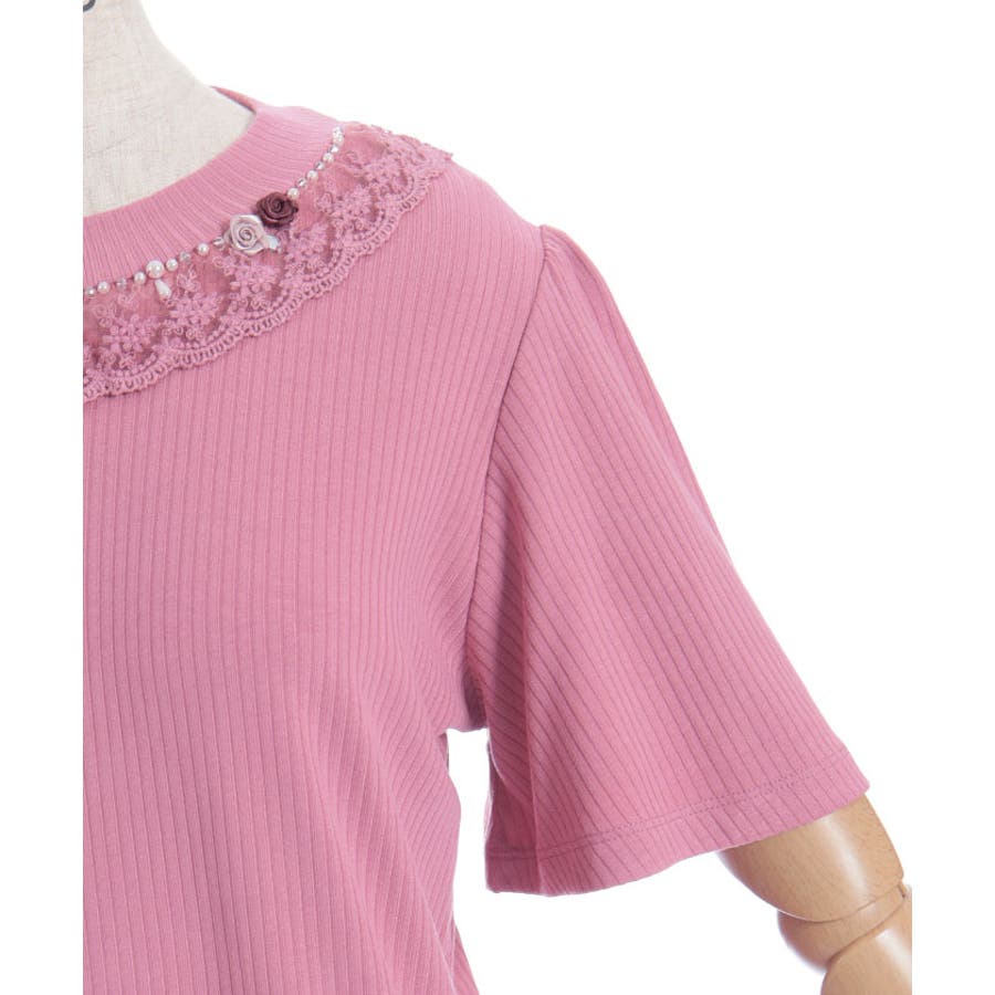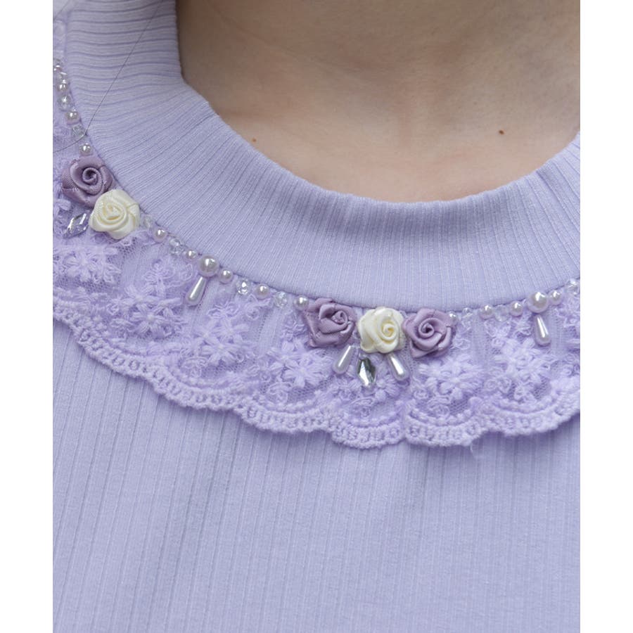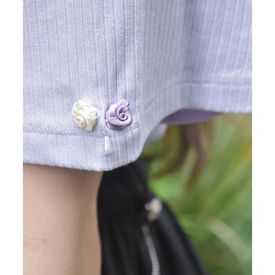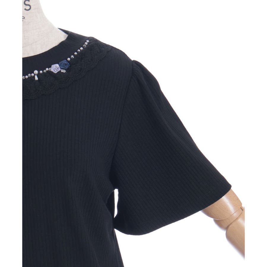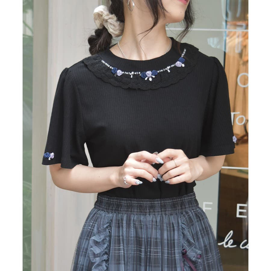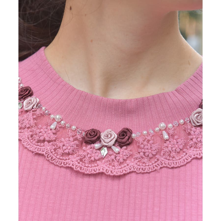 サテンリボンで作られた巻きバラが胸元を上品に彩る半袖トップスです。