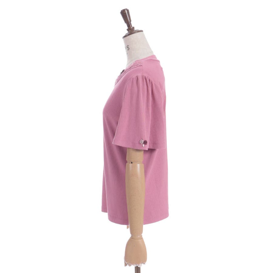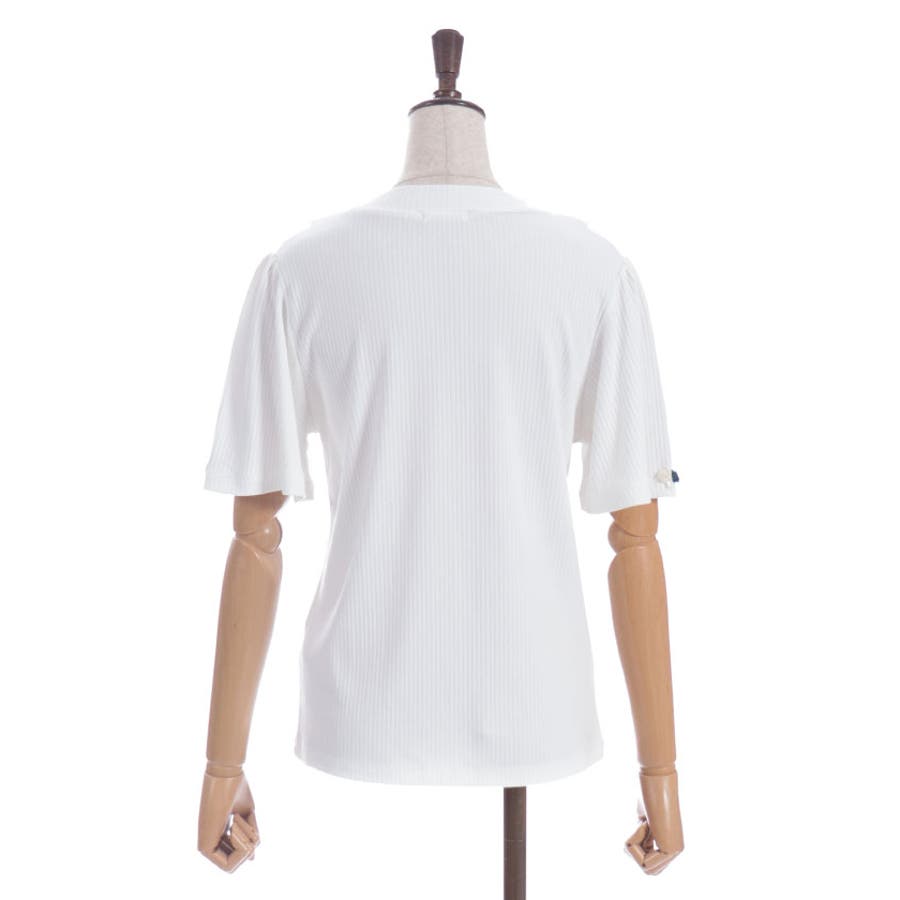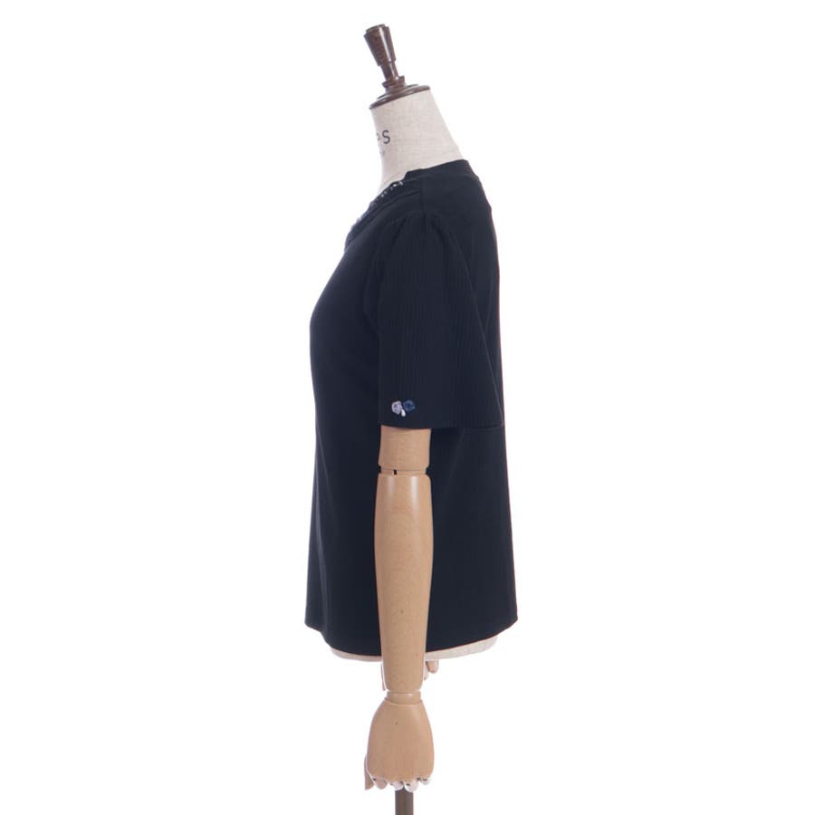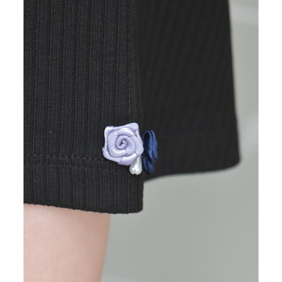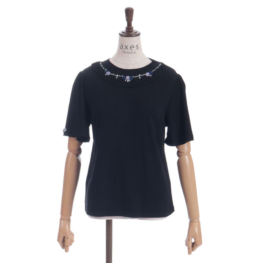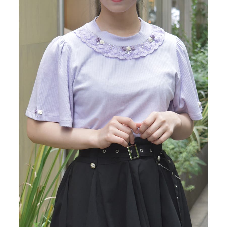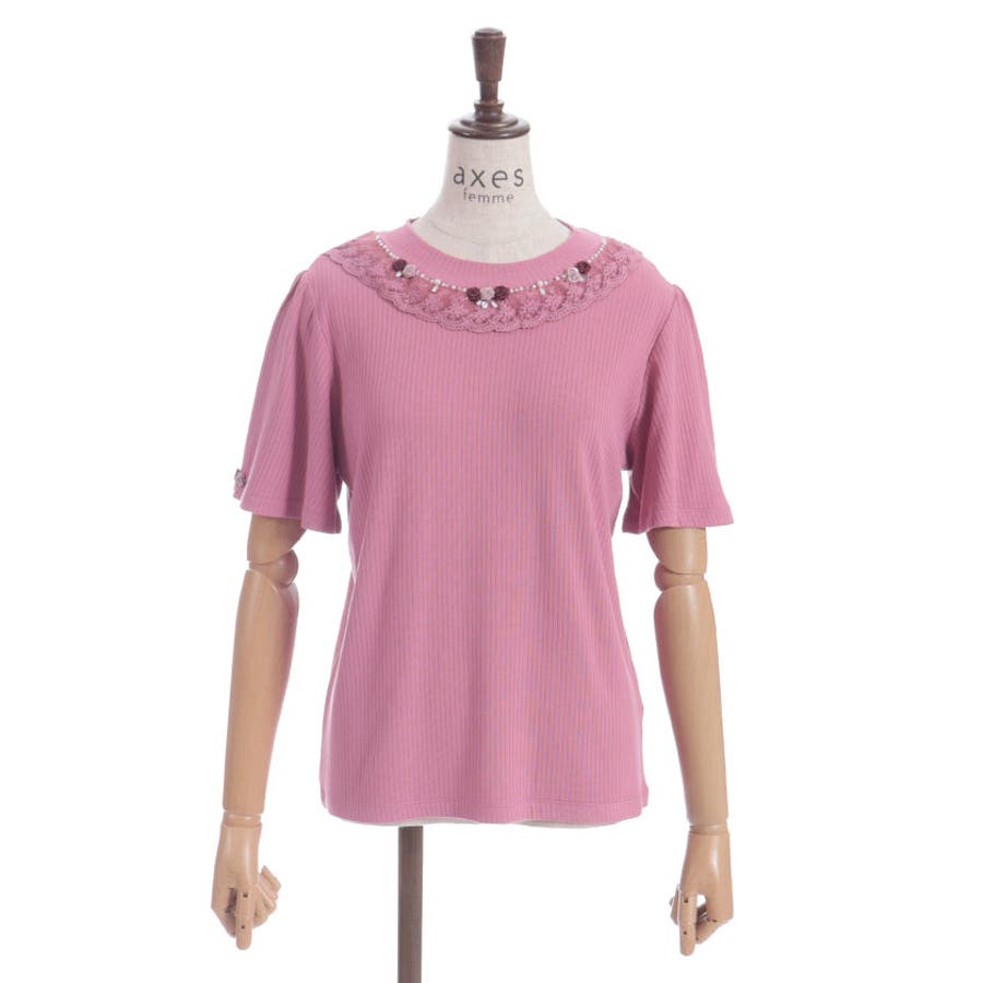サテンリボンで作られた巻きバラが胸元を上品に彩る半袖トップスです。