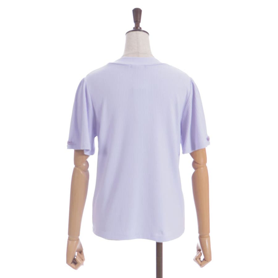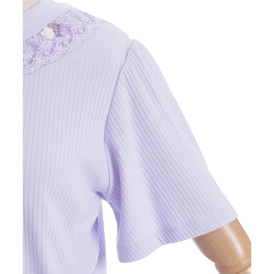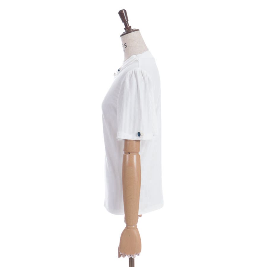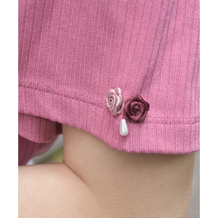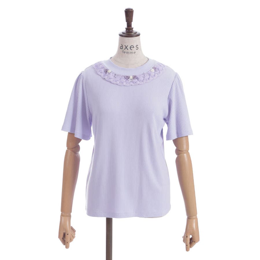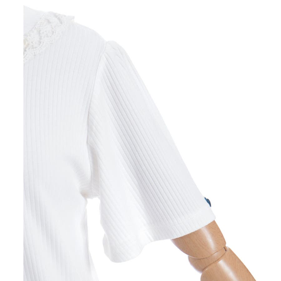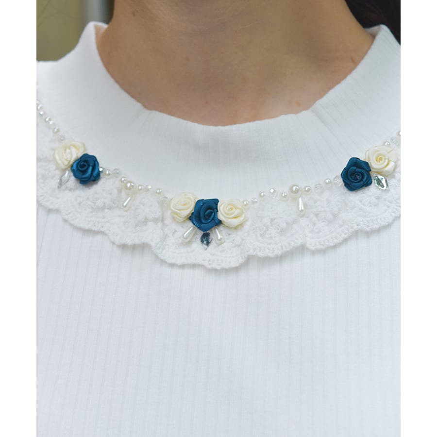 サテンリボンで作られた巻きバラが胸元を上品に彩る半袖トップスです。
