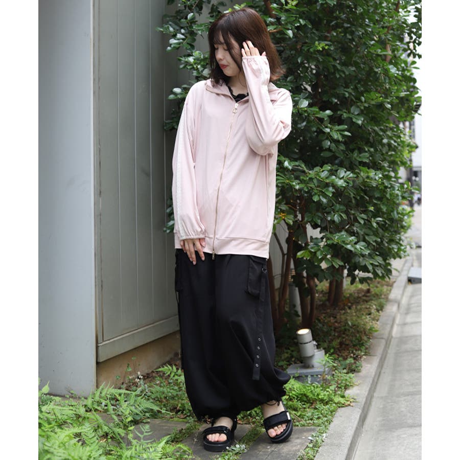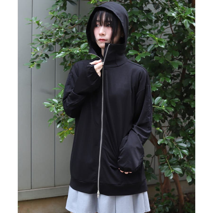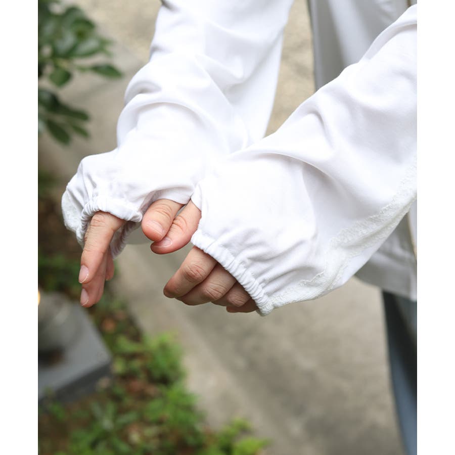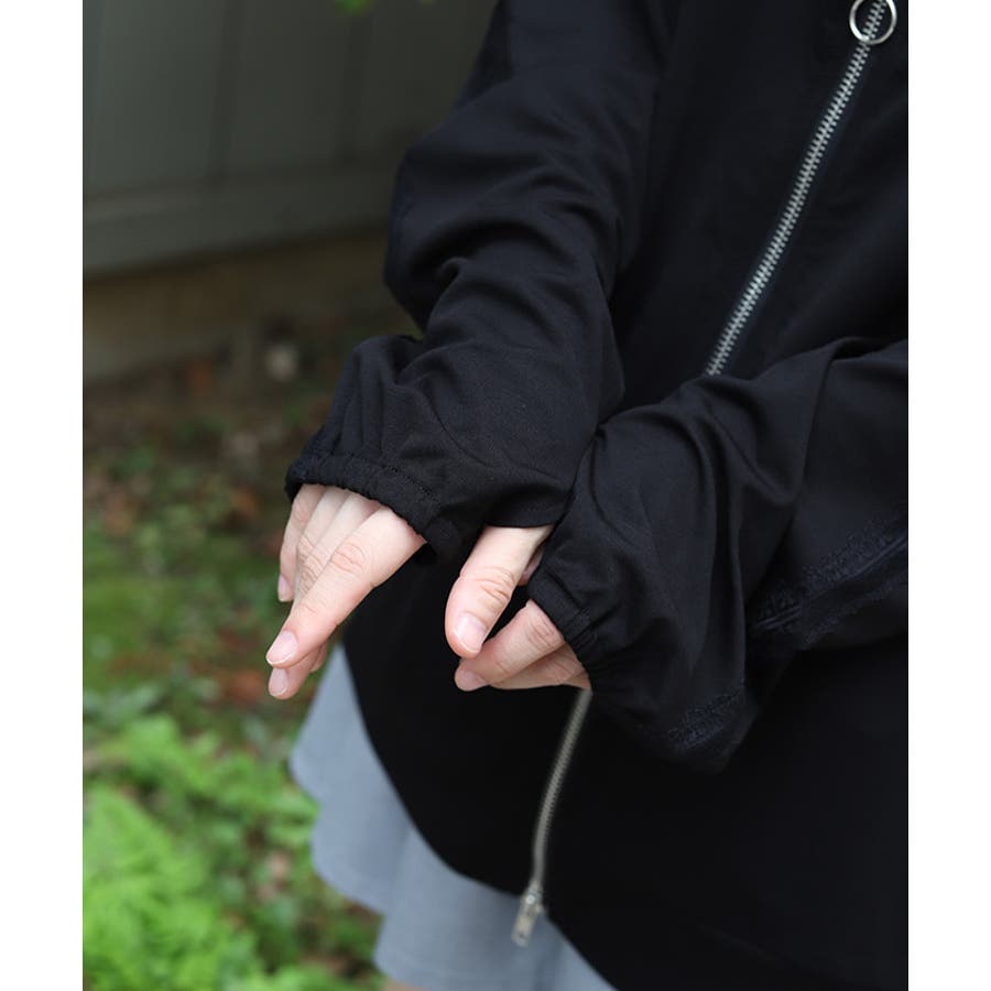 日差しから顔周りもカバーしてくれる長めのジップと、指穴付き×ゴム仕様の袖口で手の甲まで徹底ガードされたデザイン。