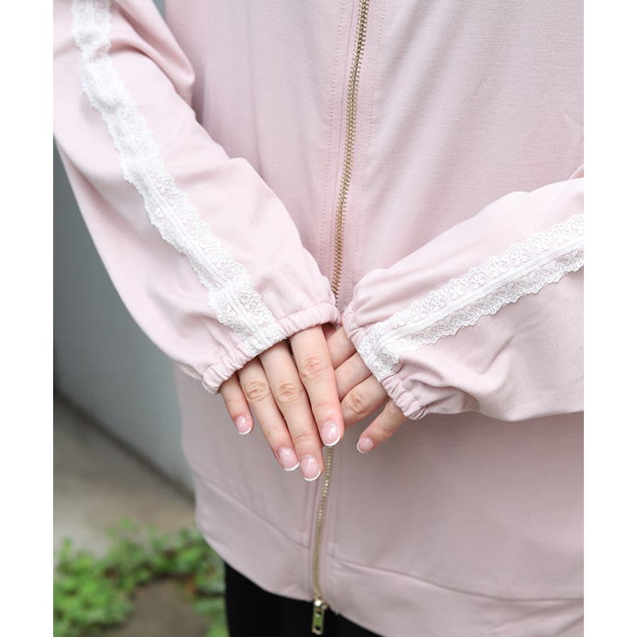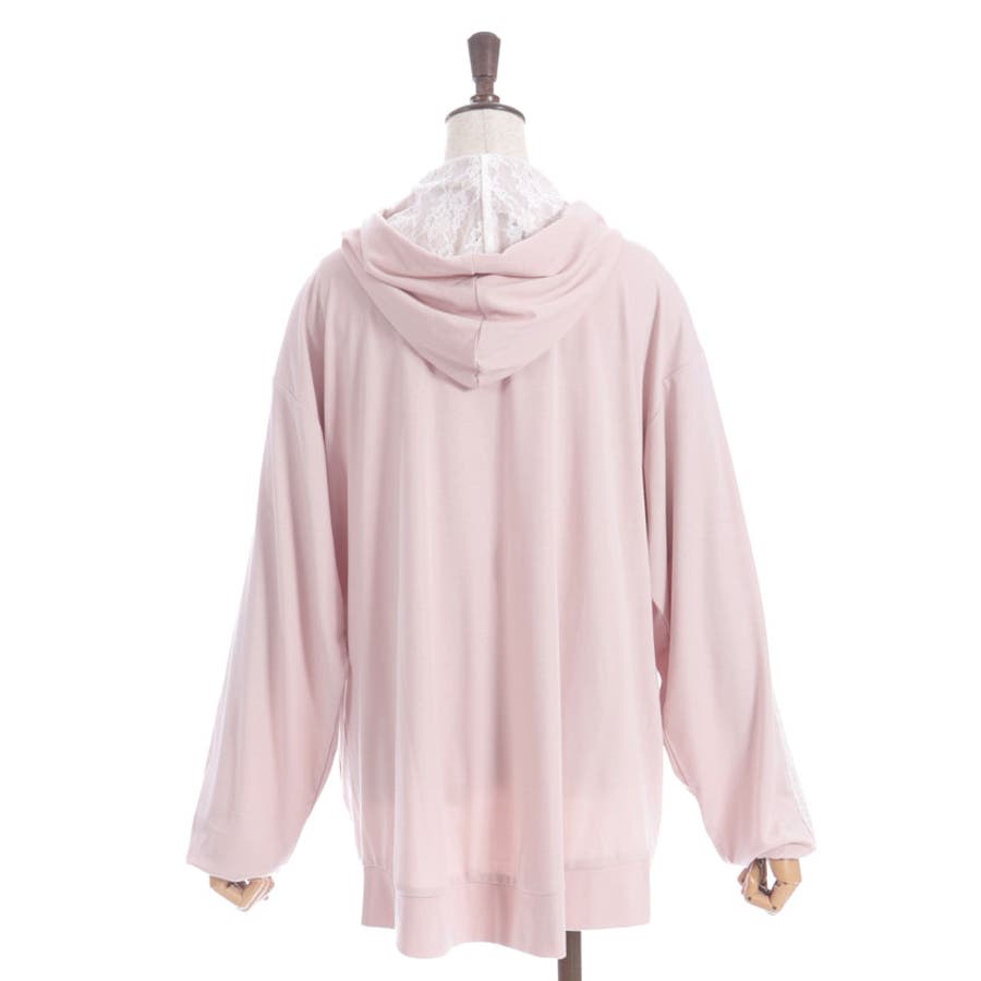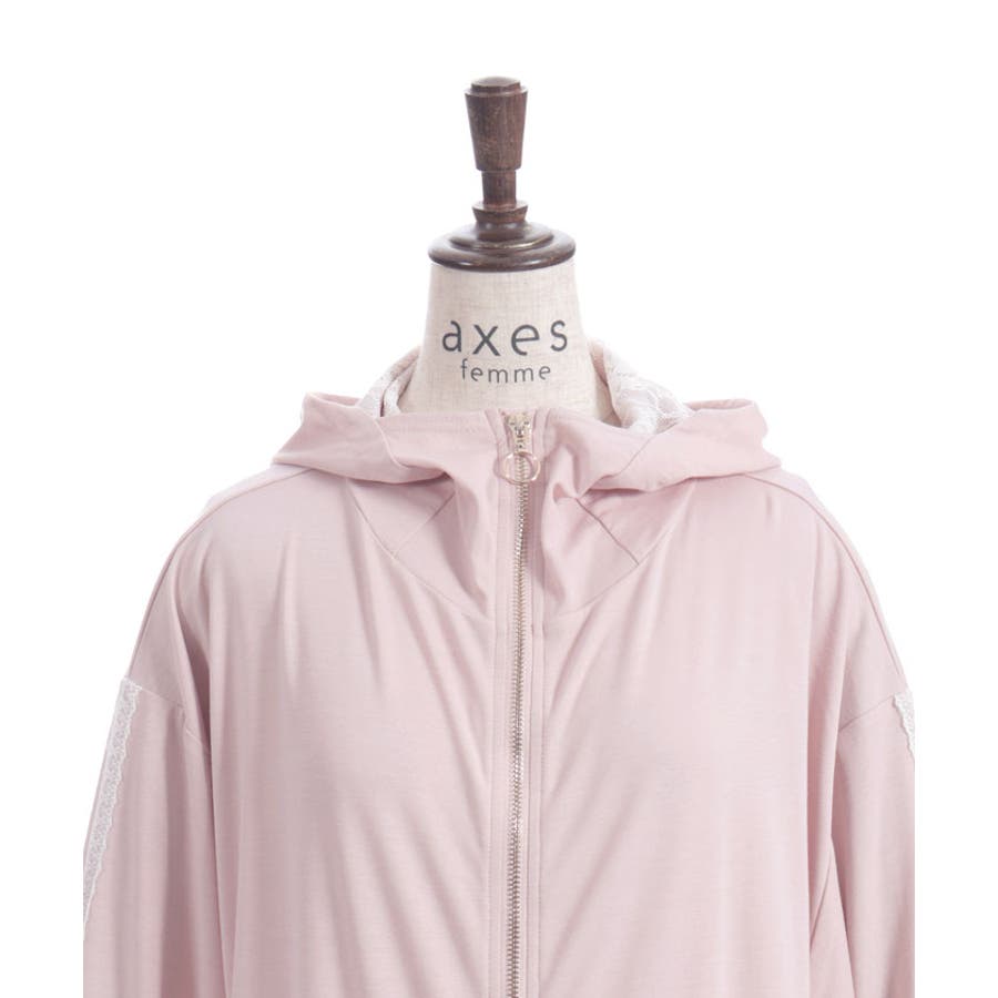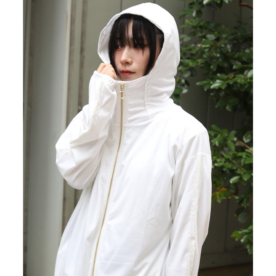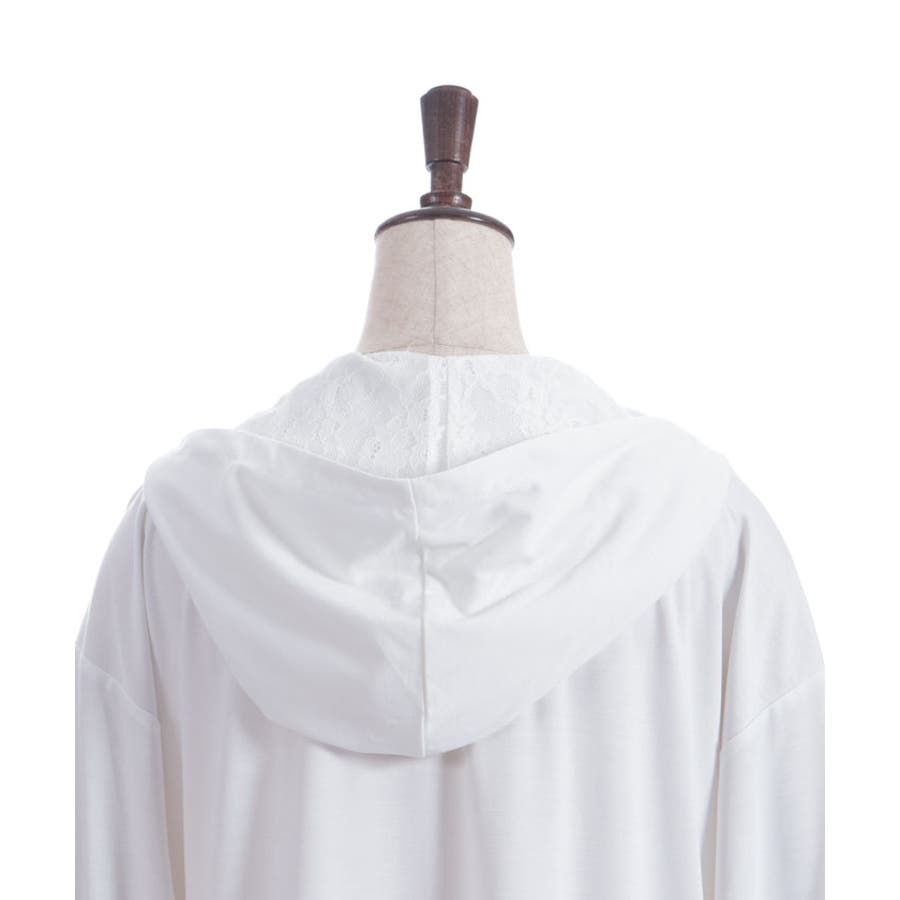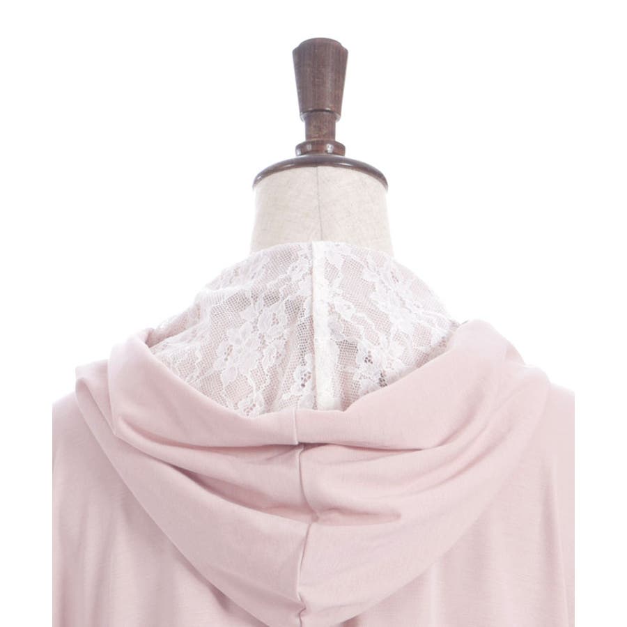 フード裏にはレース生地を重ね、袖山には繊細な柄のチュールレースを付けたデザインで、フェミニン感をプラス。