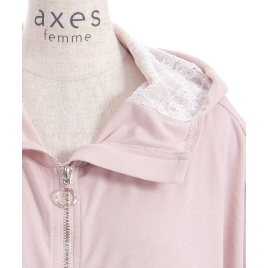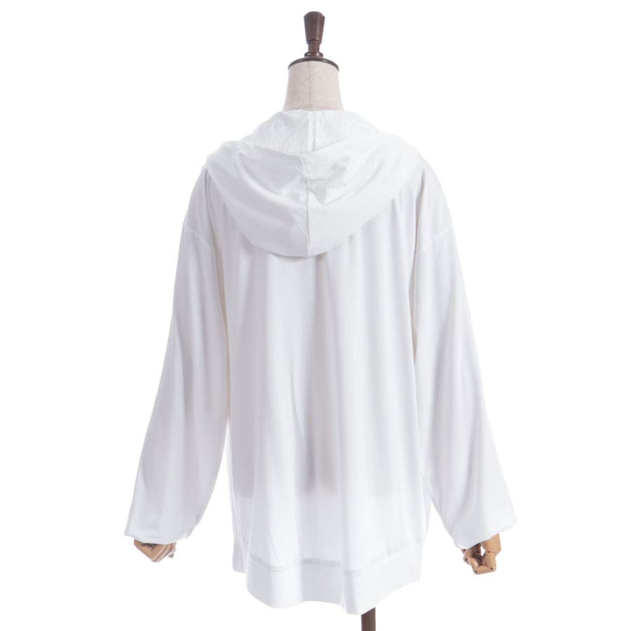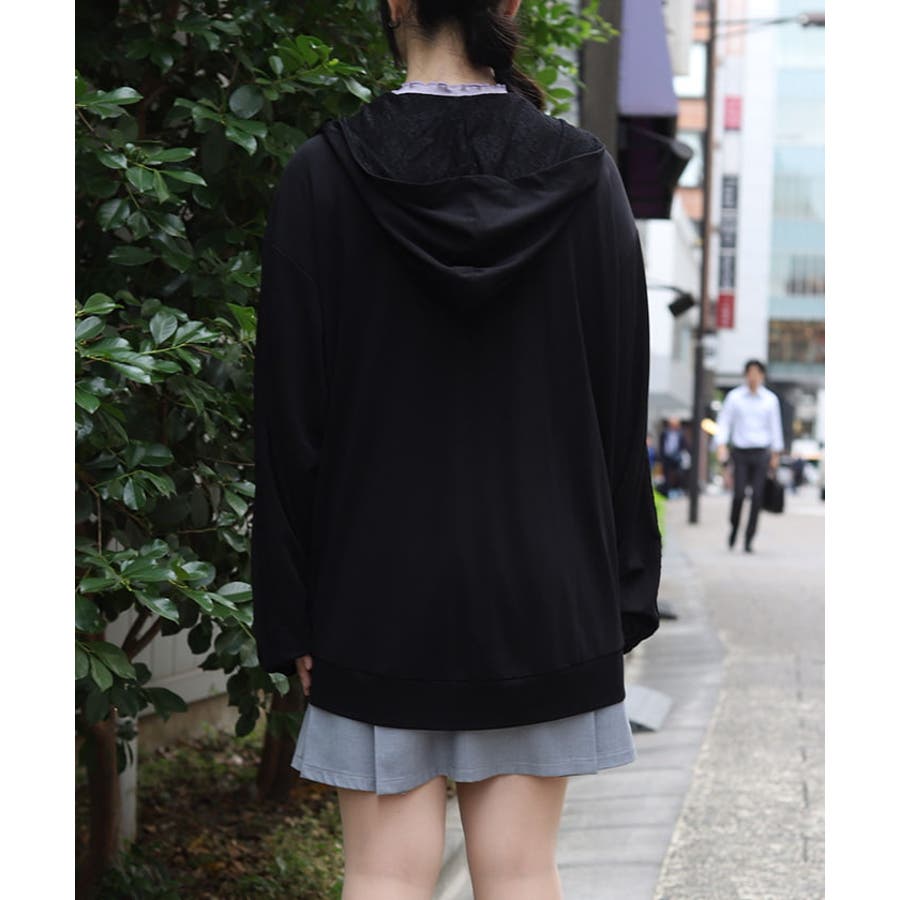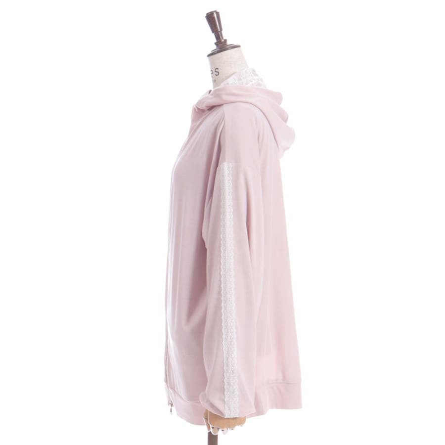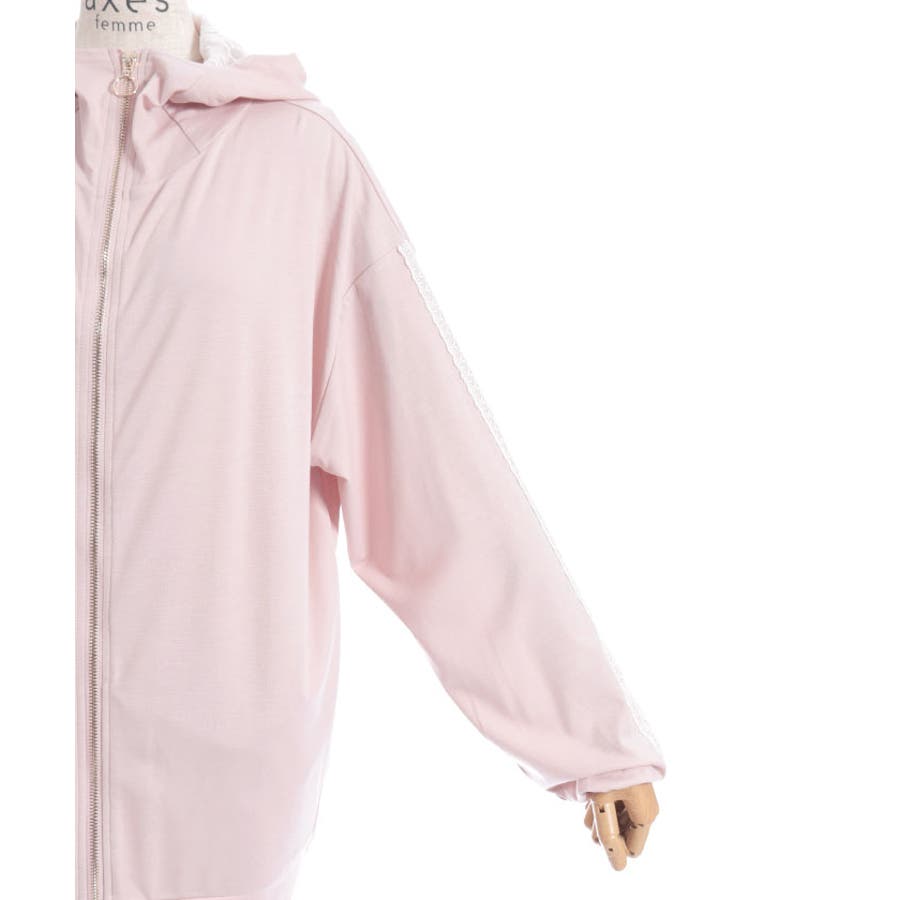 フード裏にはレース生地を重ね、袖山には繊細な柄のチュールレースを付けたデザインで、フェミニン感をプラス。