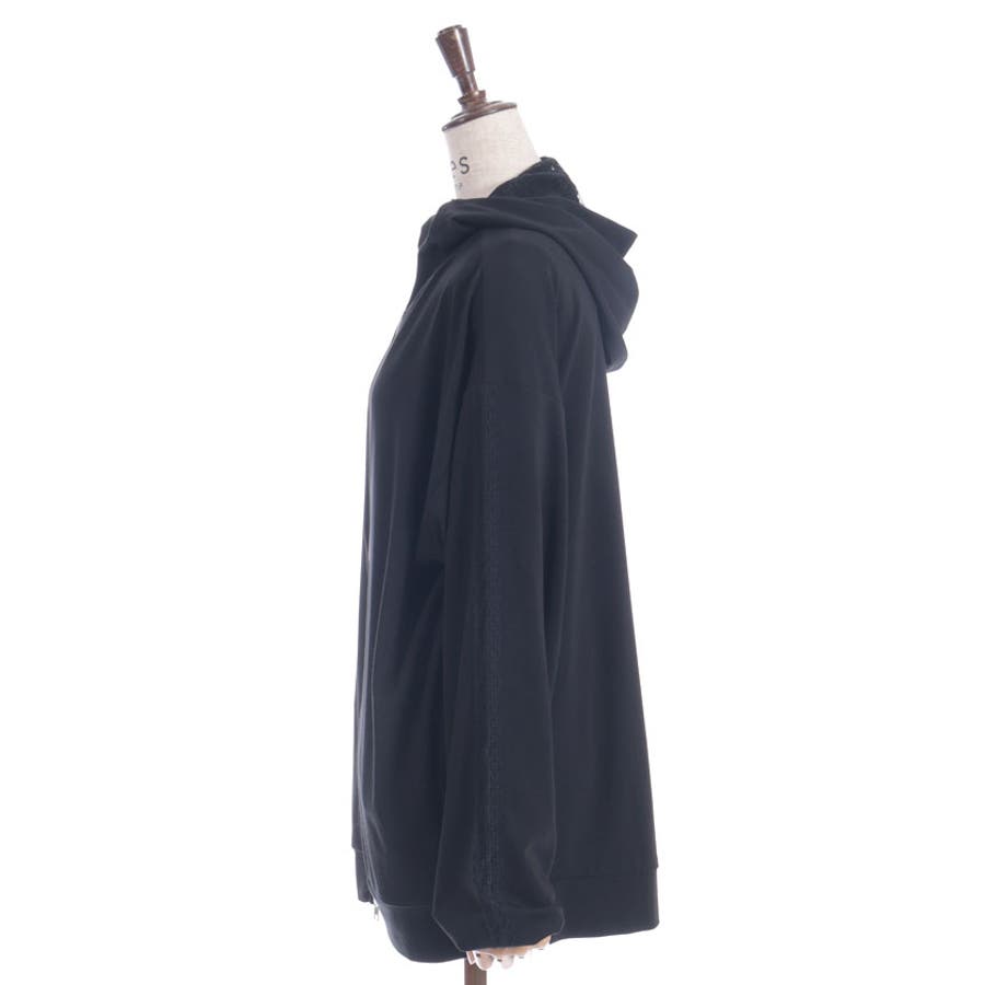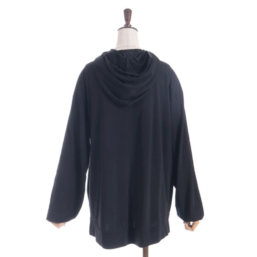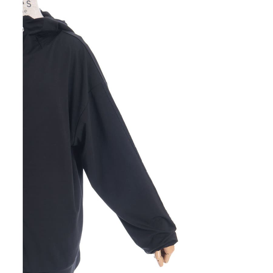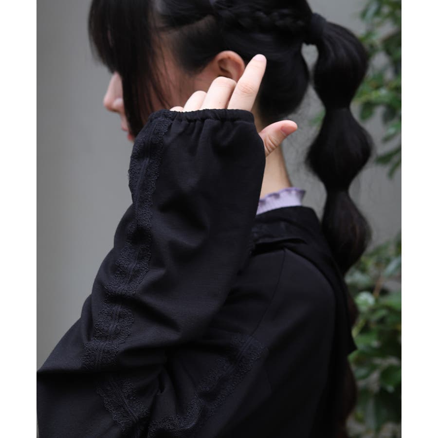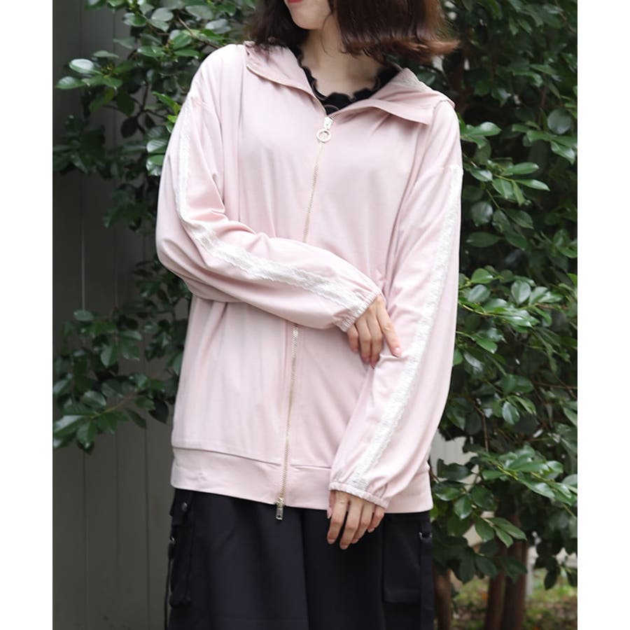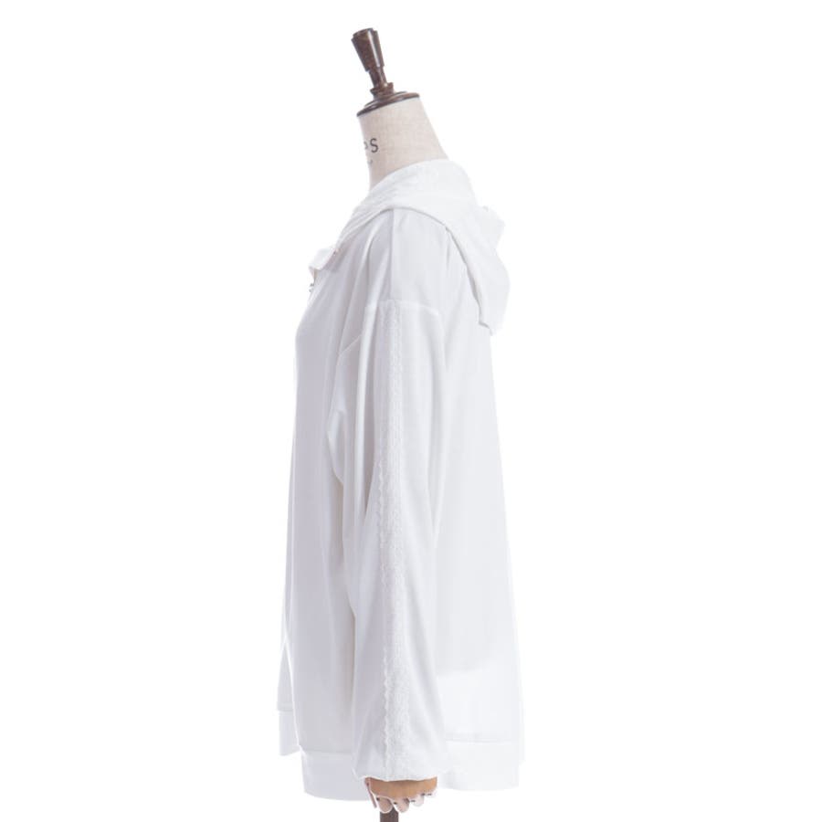 フード裏にはレース生地を重ね、袖山には繊細な柄のチュールレースを付けたデザインで、フェミニン感をプラス。
