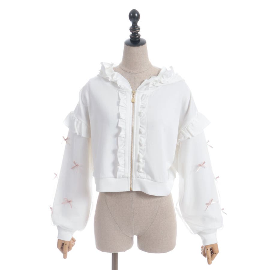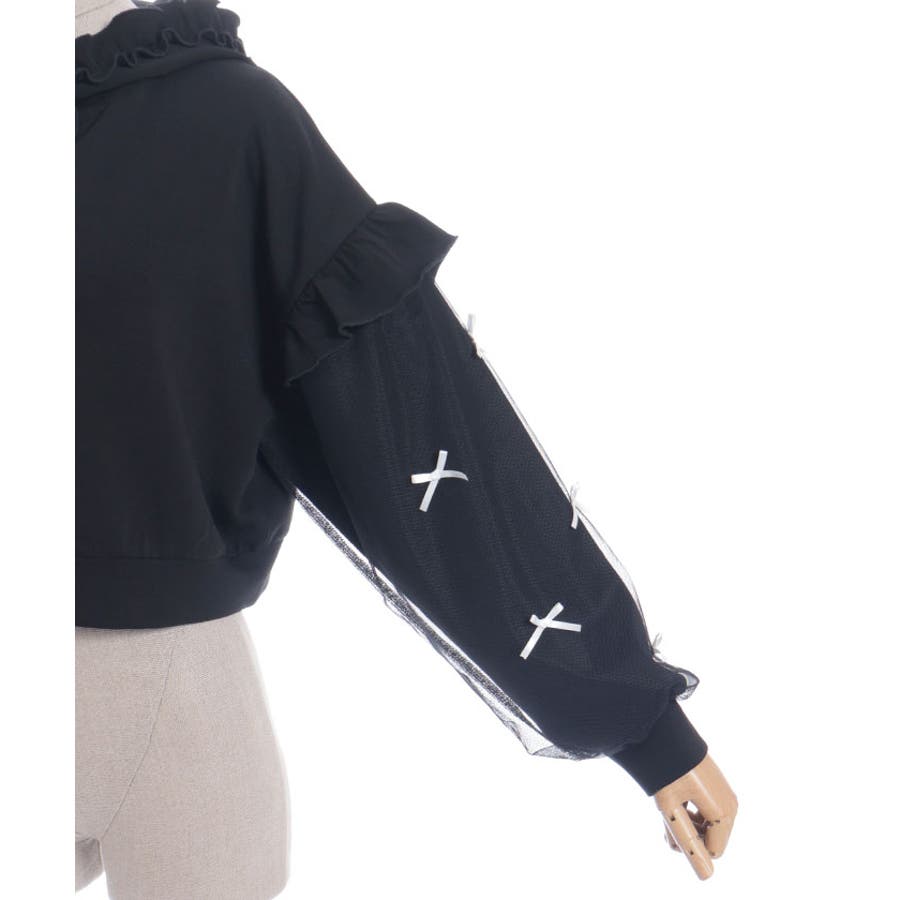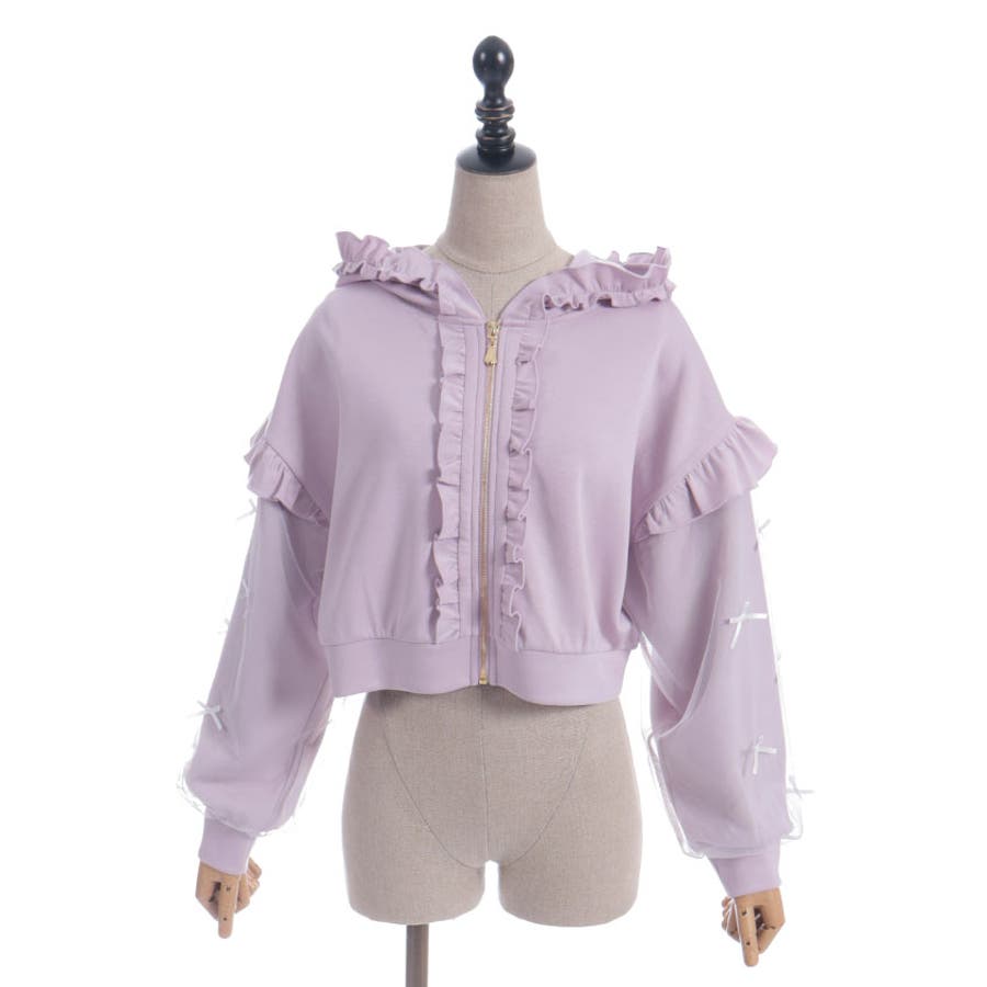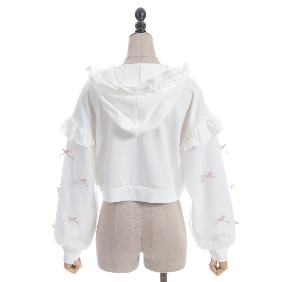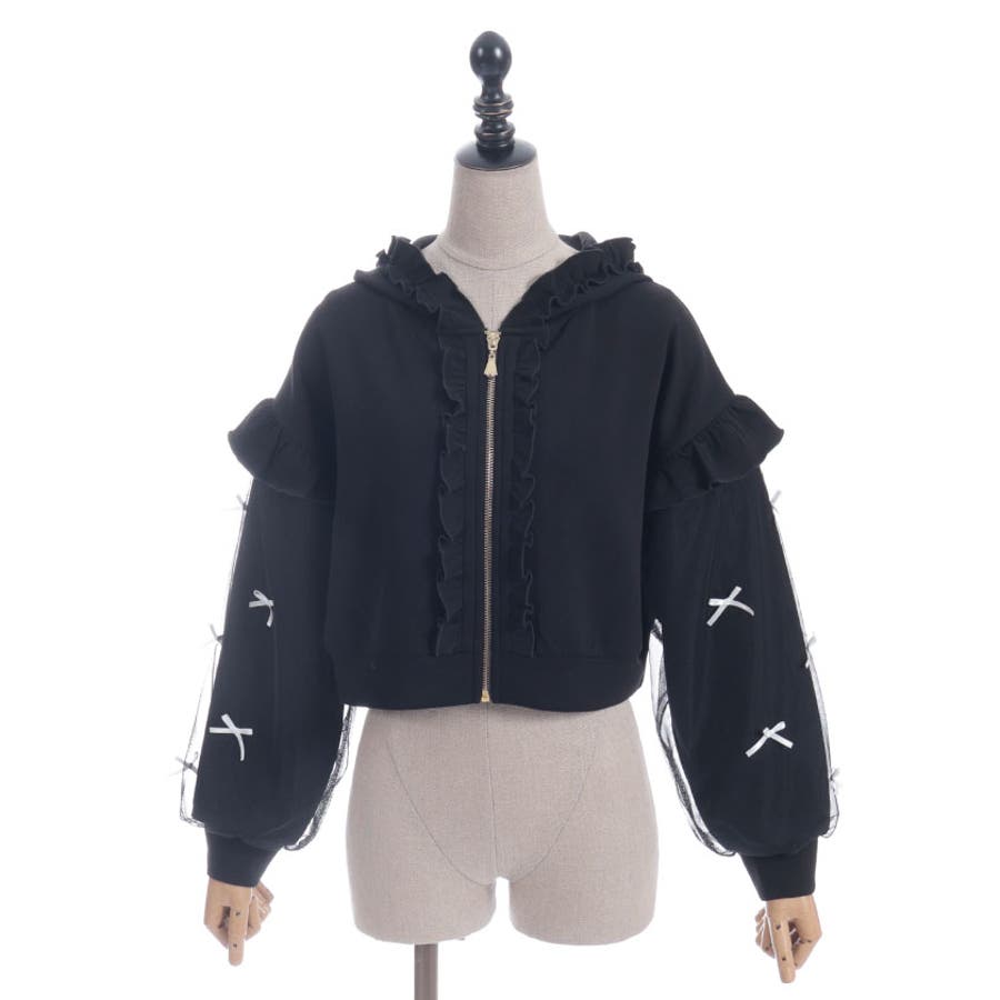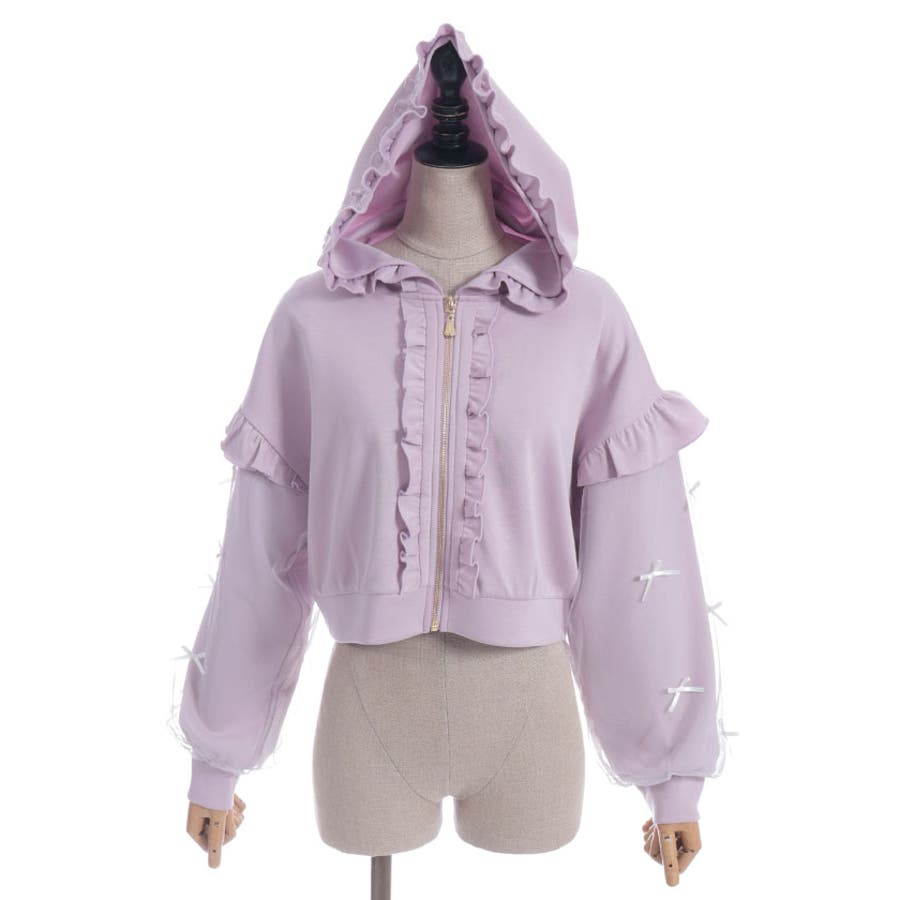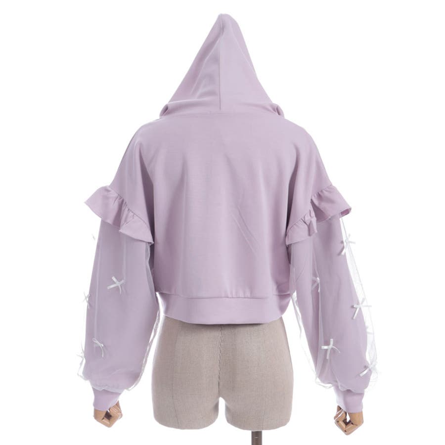 袖にチュールにリボンを散りばめたガーリーなパーカーです。