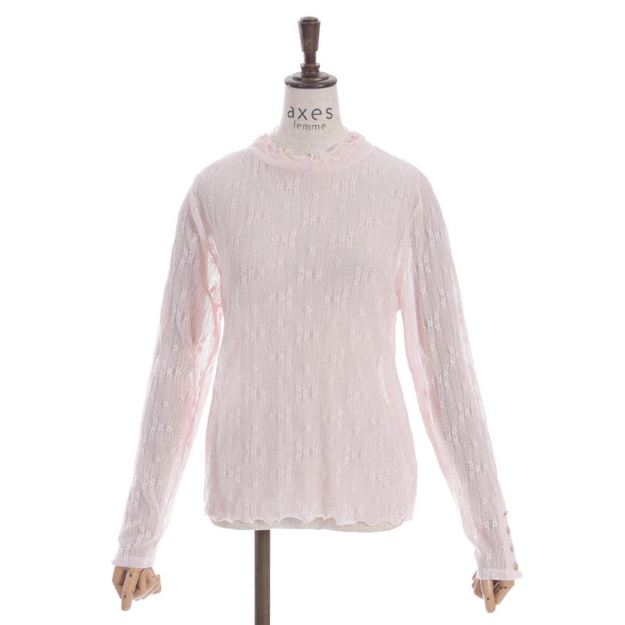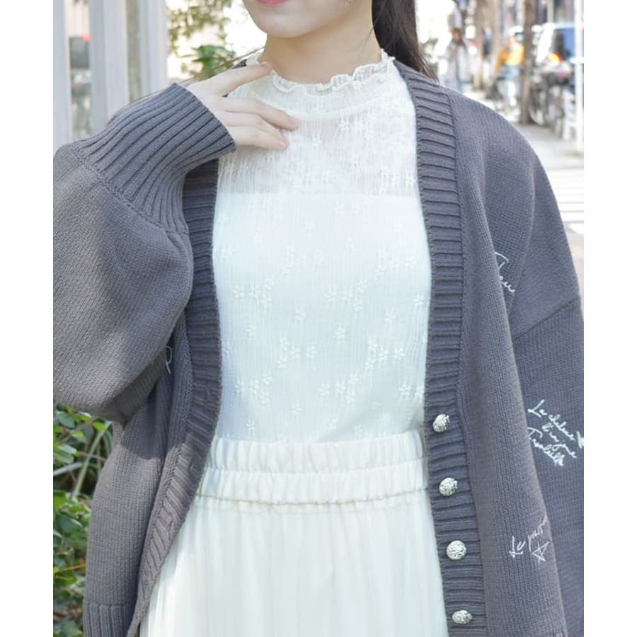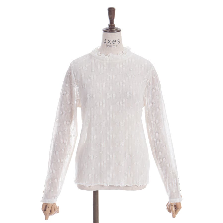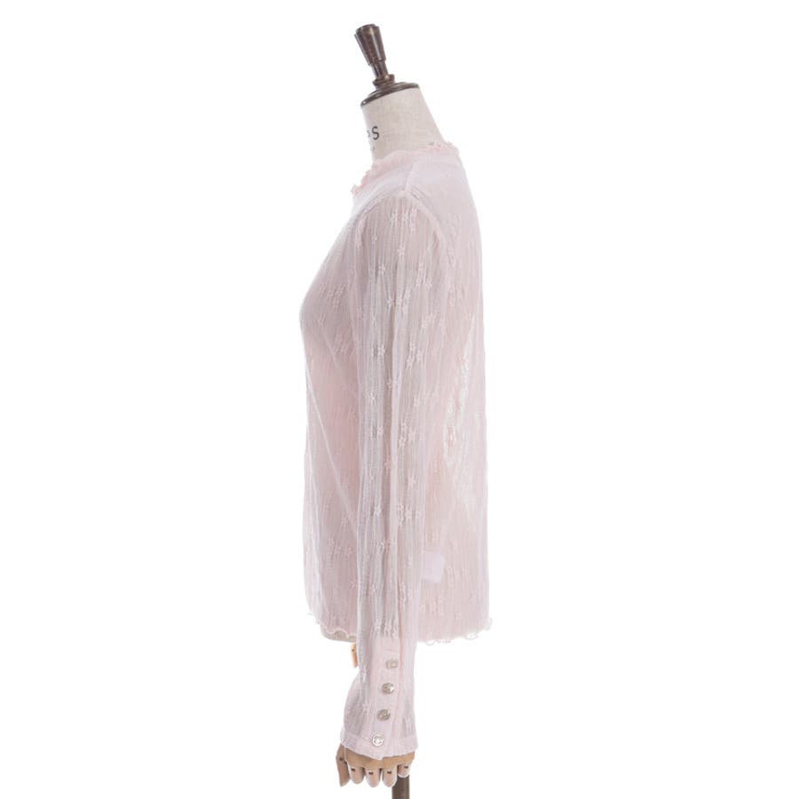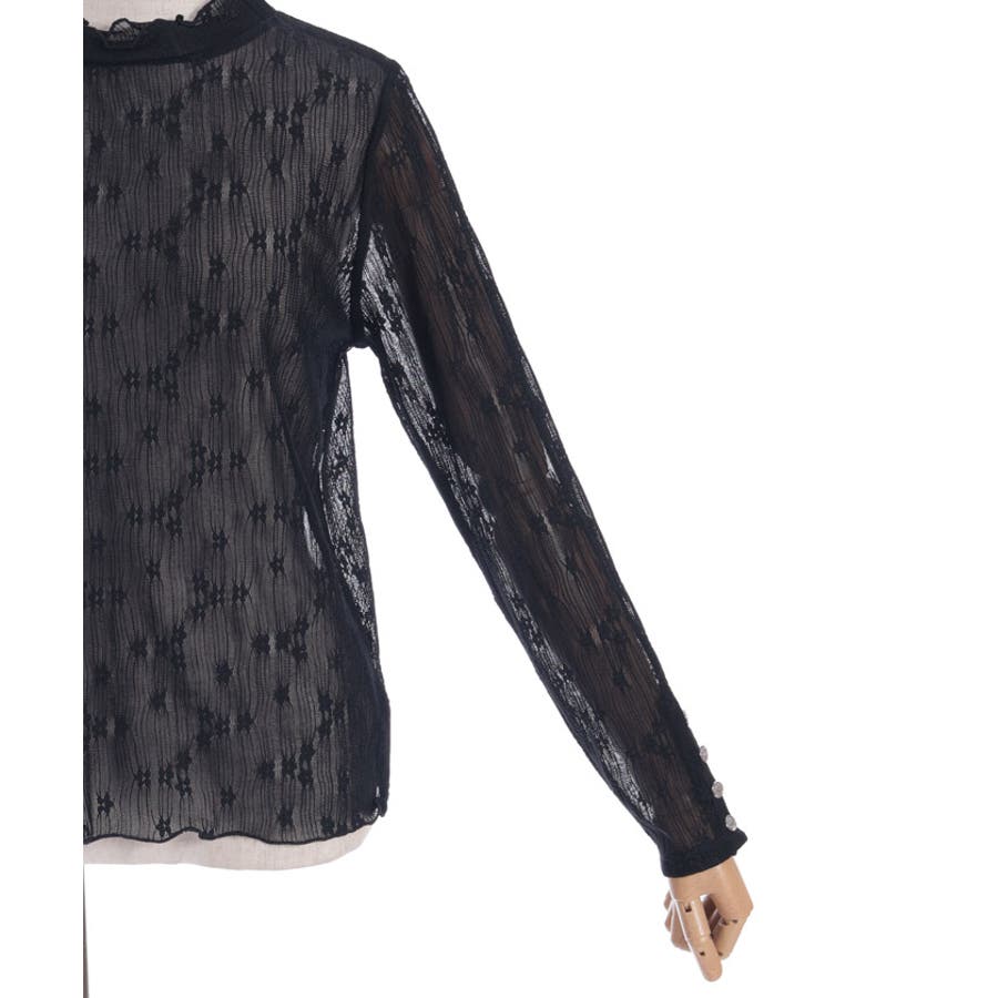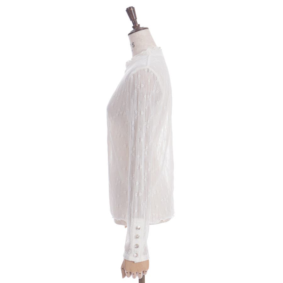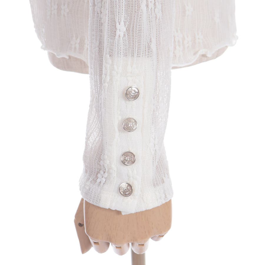 袖の華やかな連ボタンがポイントのレースのシアーインナーです。
