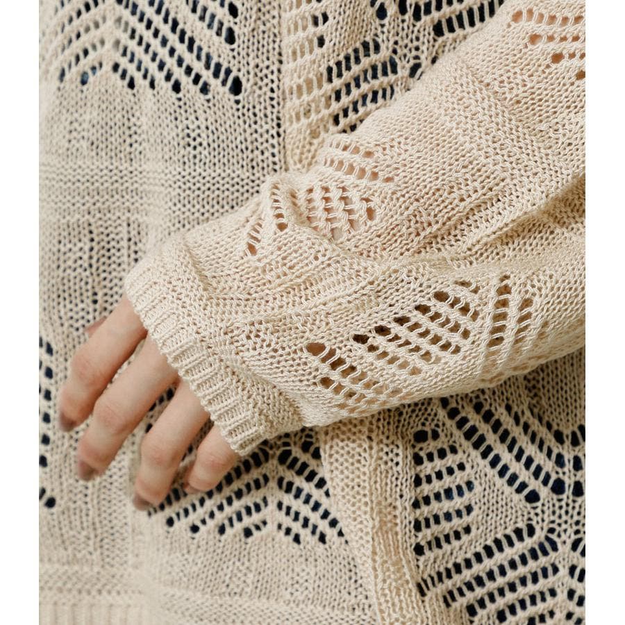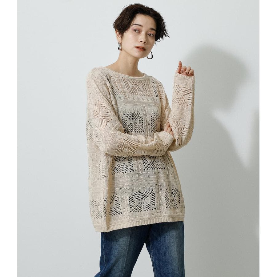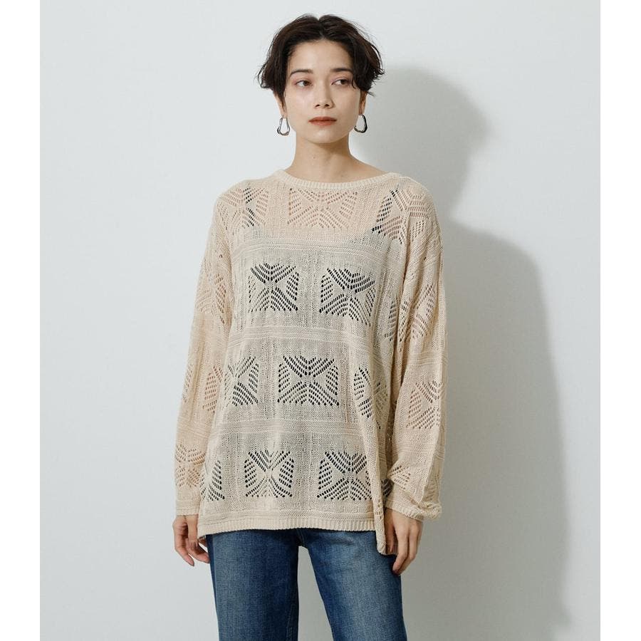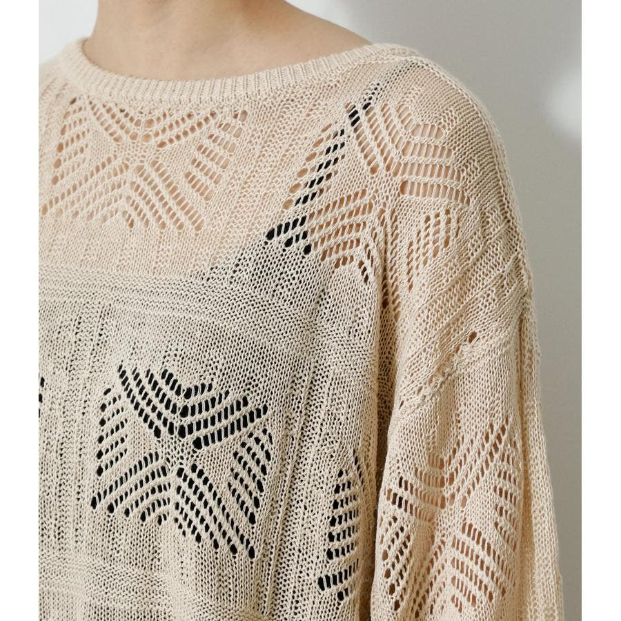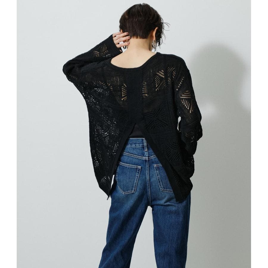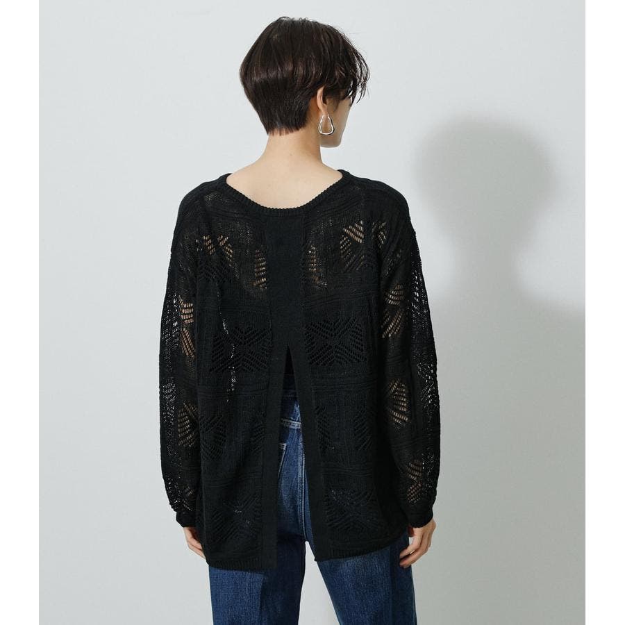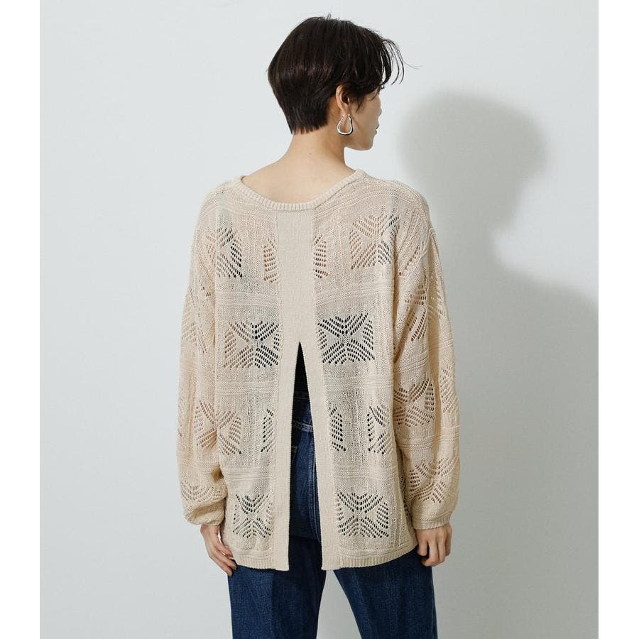 ・幾何学柄を施したクロシェ編みニットです。・深く入ったバックスリットが抜け感を演出し、トレンドライクな印象に。・程よくルーズなシルエットなので、細身のパンツはもちろん、トレンドのフレアパンツと合わせメリハリのあるスタイルに仕上げてあげるのがおすすめ。