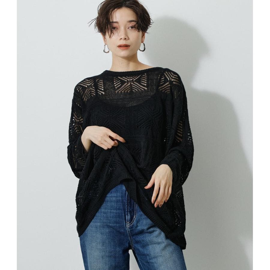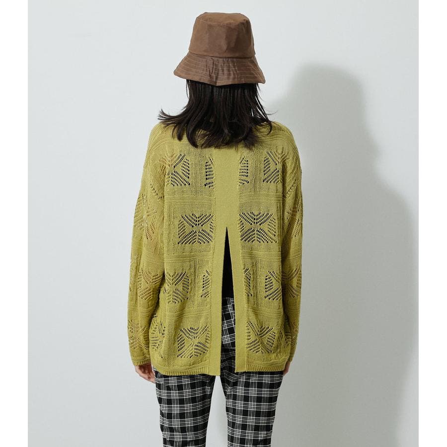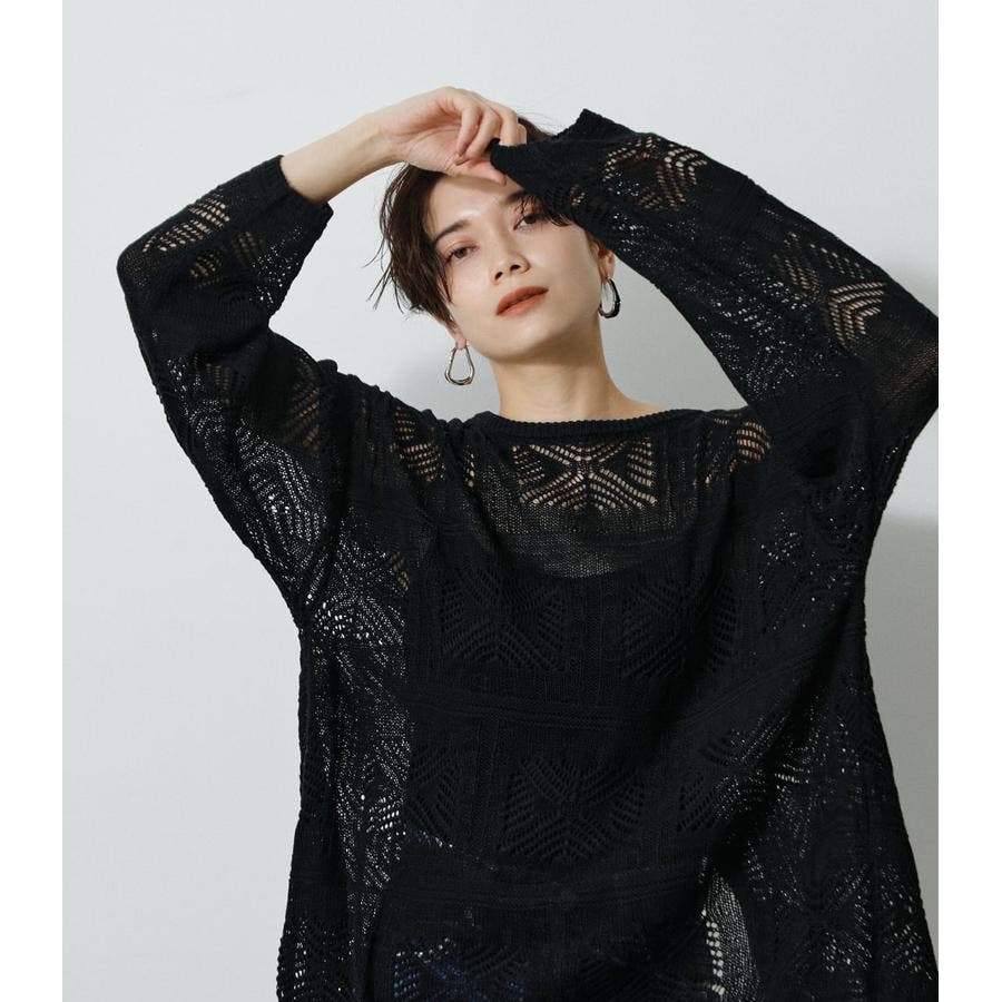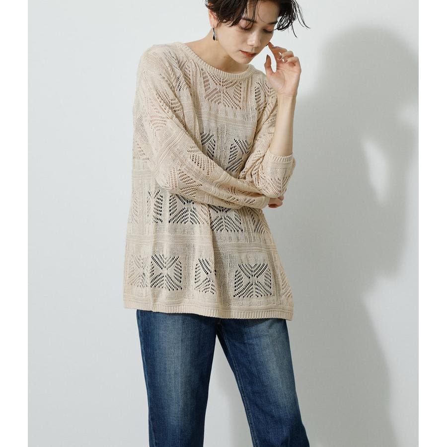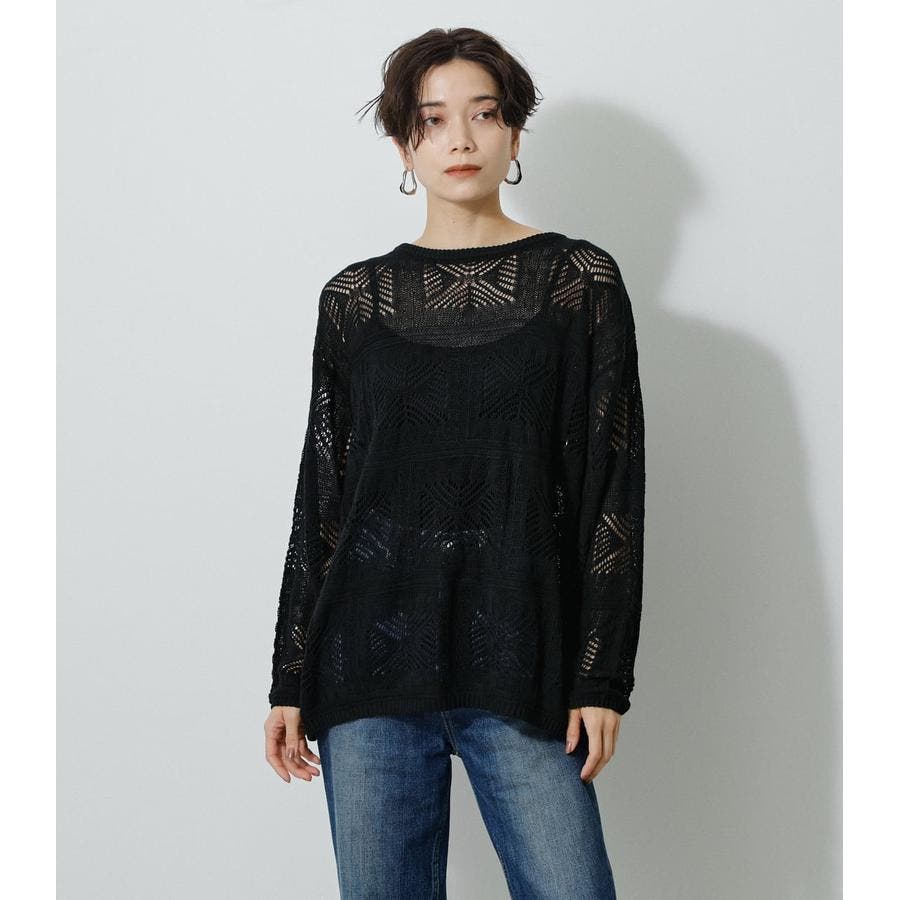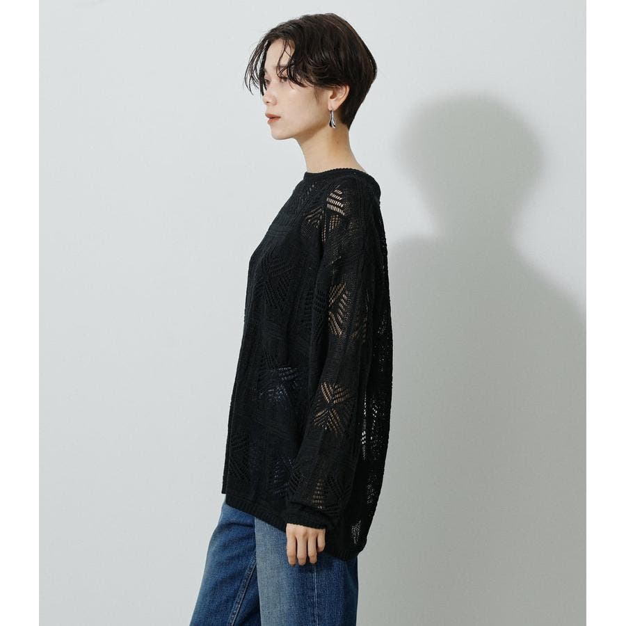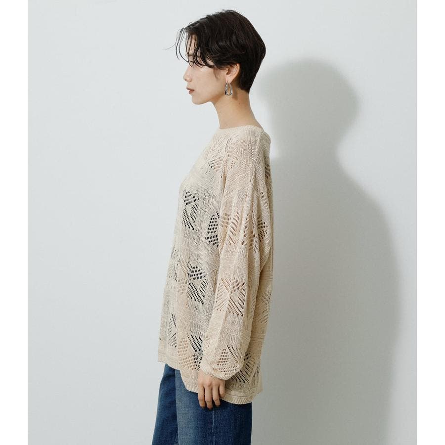 ・幾何学柄を施したクロシェ編みニットです。・深く入ったバックスリットが抜け感を演出し、トレンドライクな印象に。・程よくルーズなシルエットなので、細身のパンツはもちろん、トレンドのフレアパンツと合わせメリハリのあるスタイルに仕上げてあげるのがおすすめ。