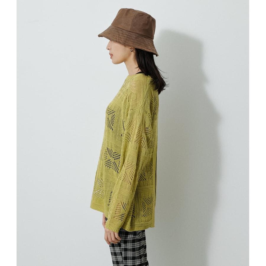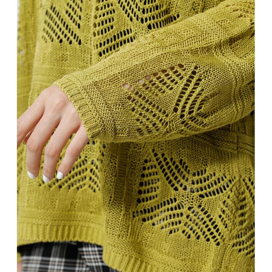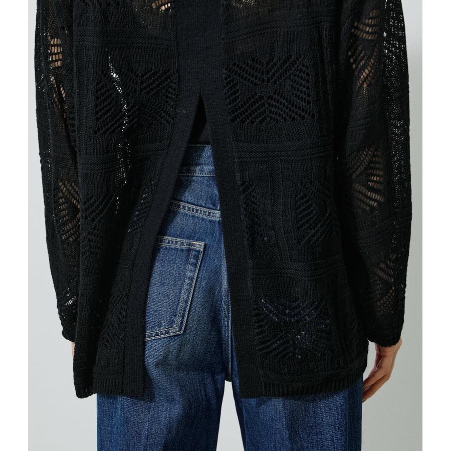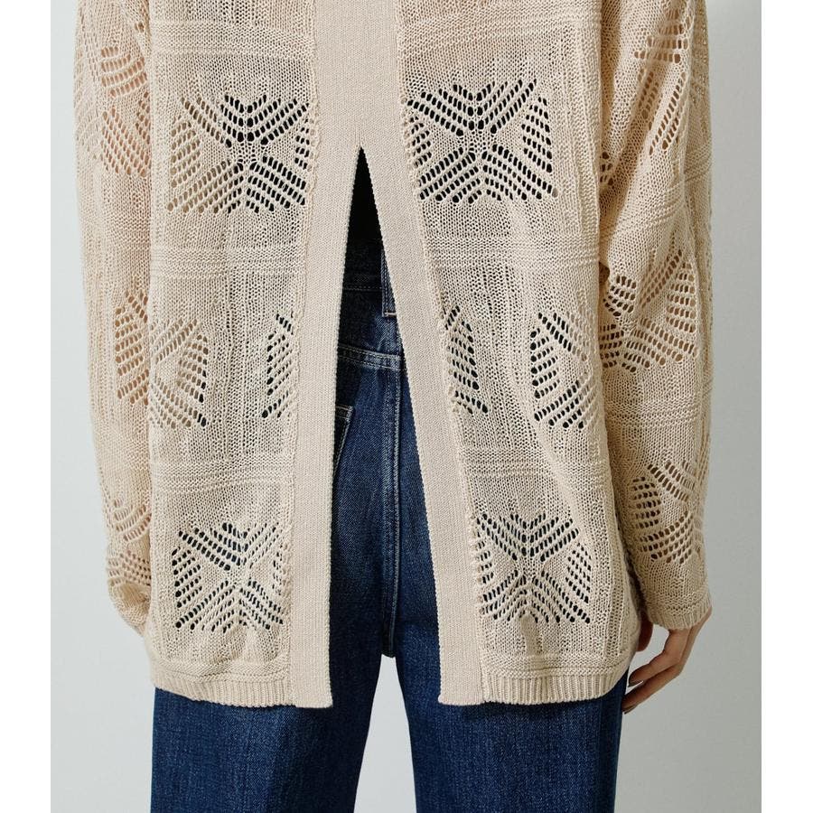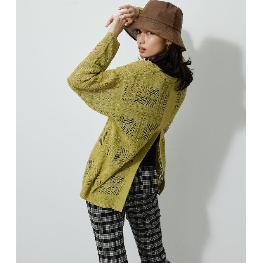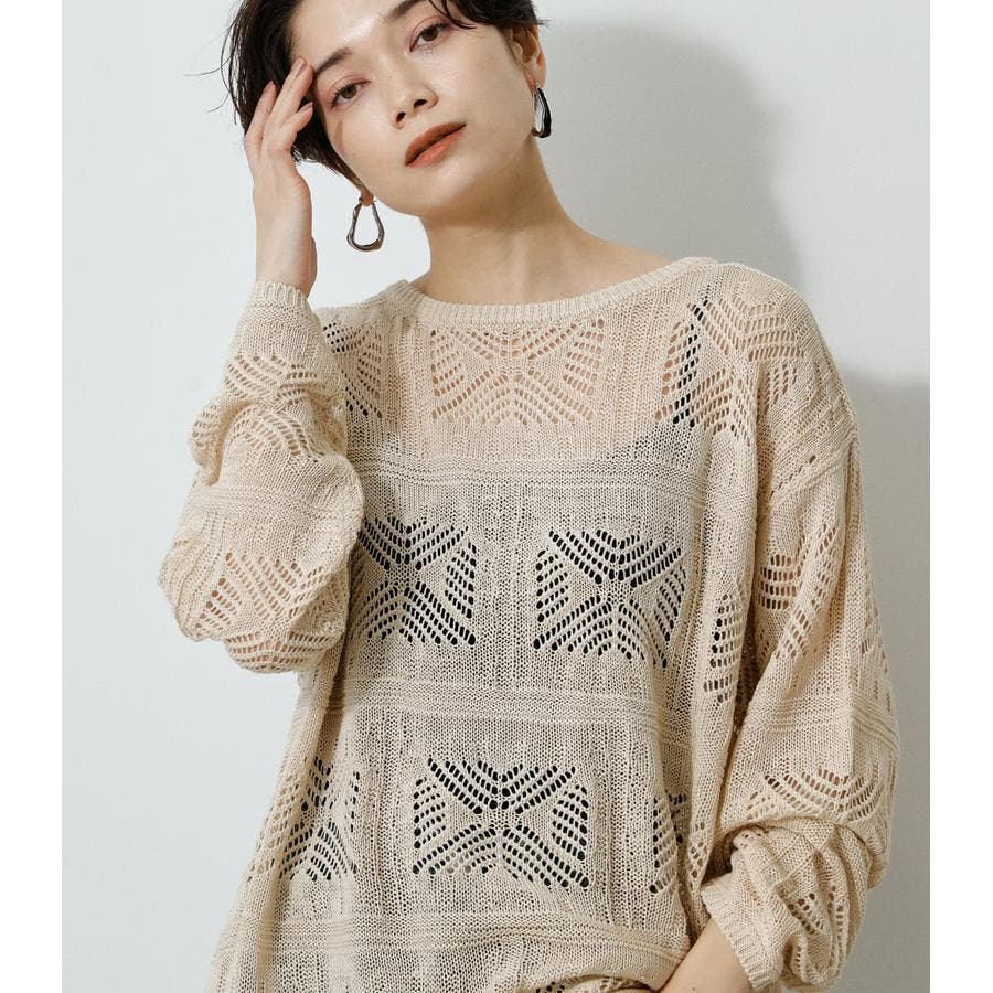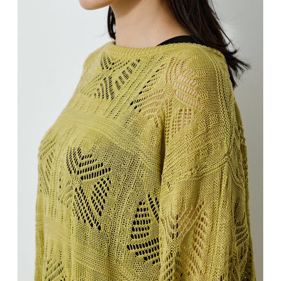 ・幾何学柄を施したクロシェ編みニットです。・深く入ったバックスリットが抜け感を演出し、トレンドライクな印象に。・程よくルーズなシルエットなので、細身のパンツはもちろん、トレンドのフレアパンツと合わせメリハリのあるスタイルに仕上げてあげるのがおすすめ。