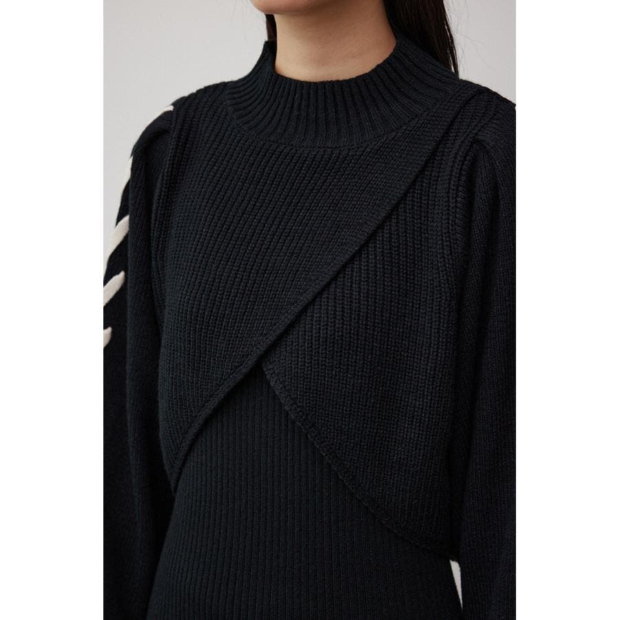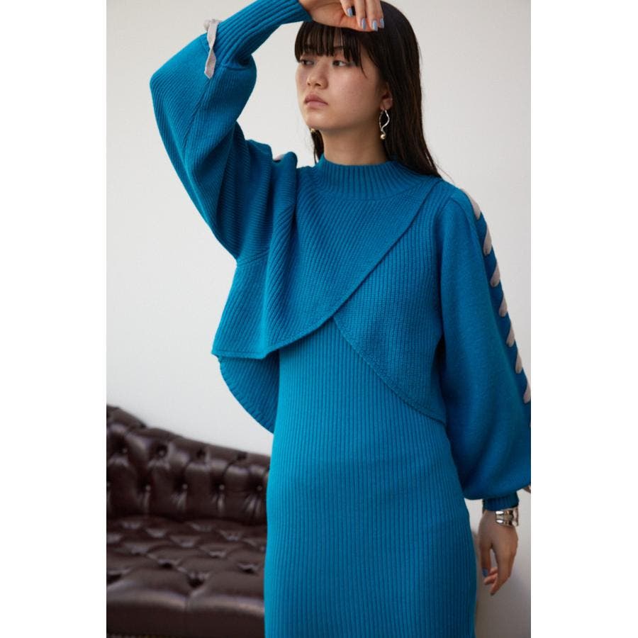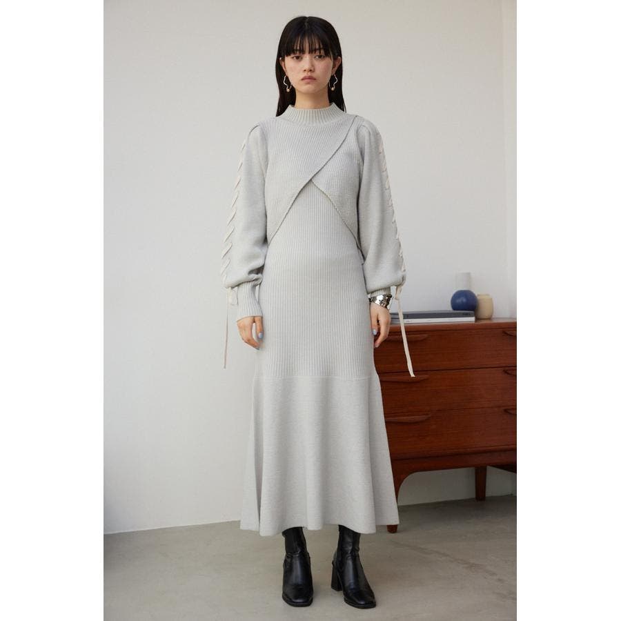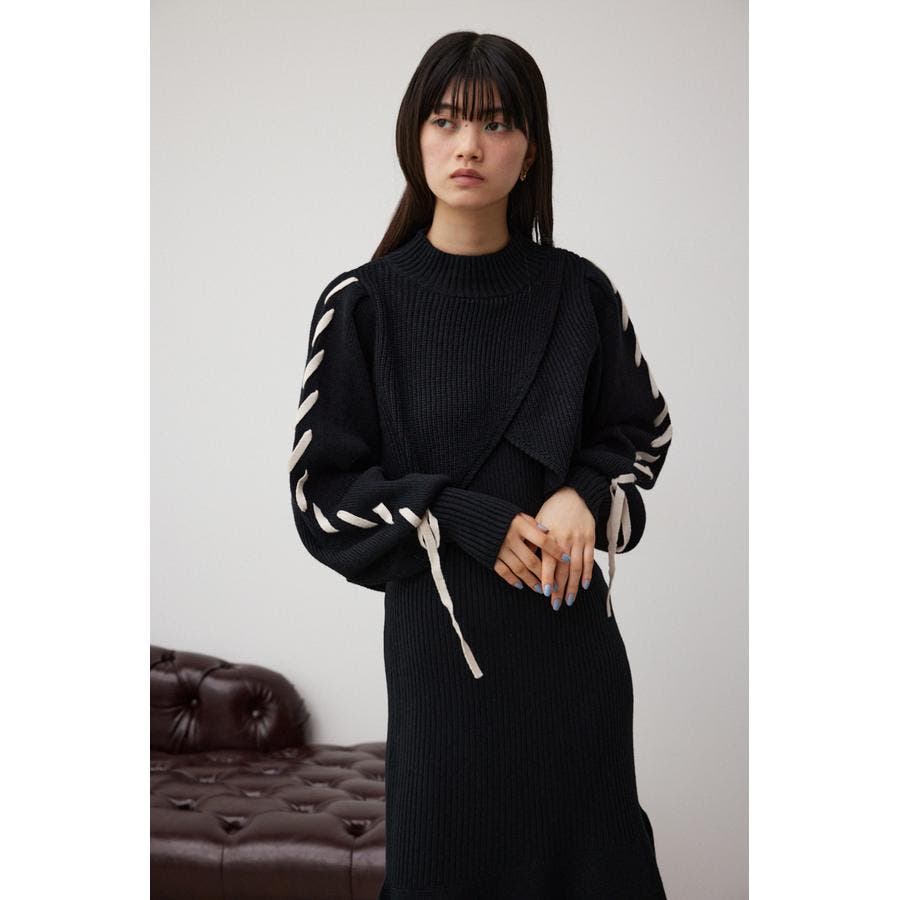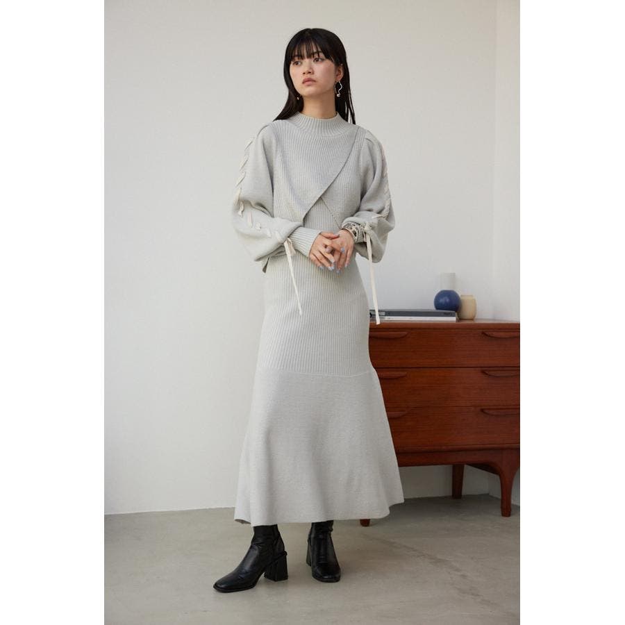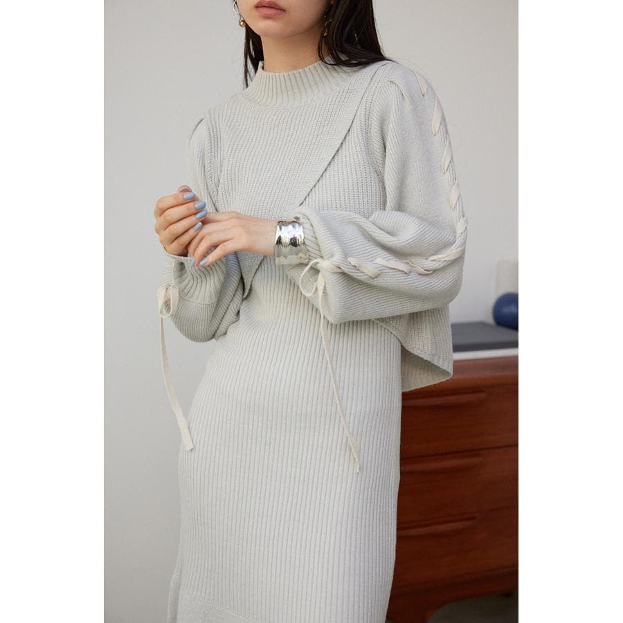 ・アウターのニットはフロントのカシュクールデザインと、ボリュームスリーブのレースアップデザインがポイント。