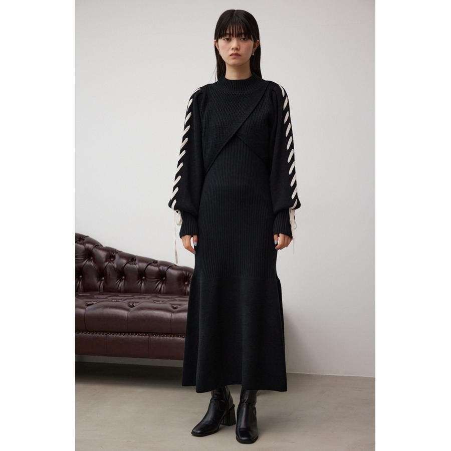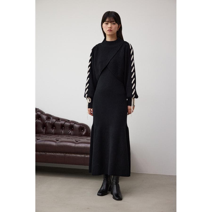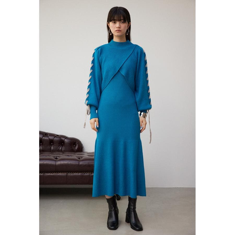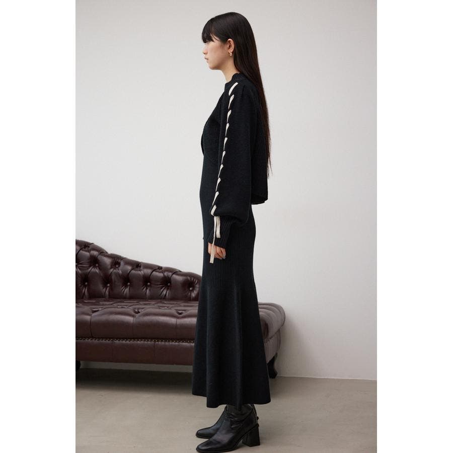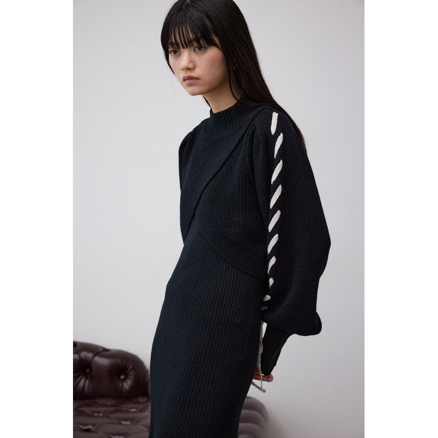 ・アウターのニットはフロントのカシュクールデザインと、ボリュームスリーブのレースアップデザインがポイント。