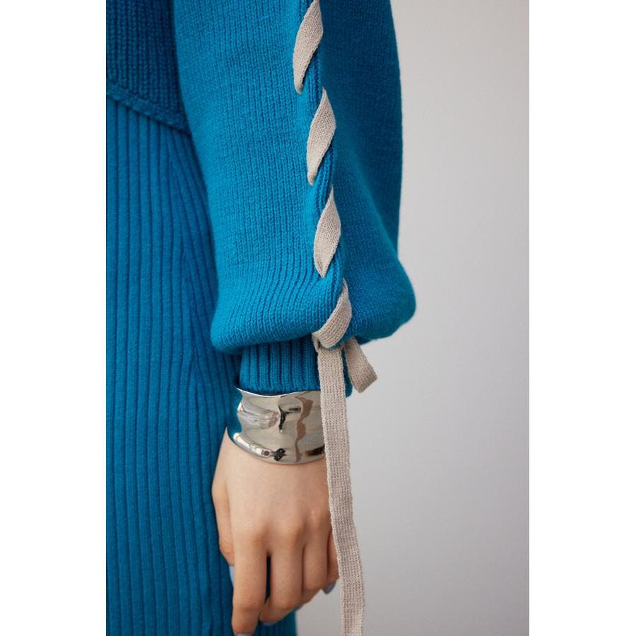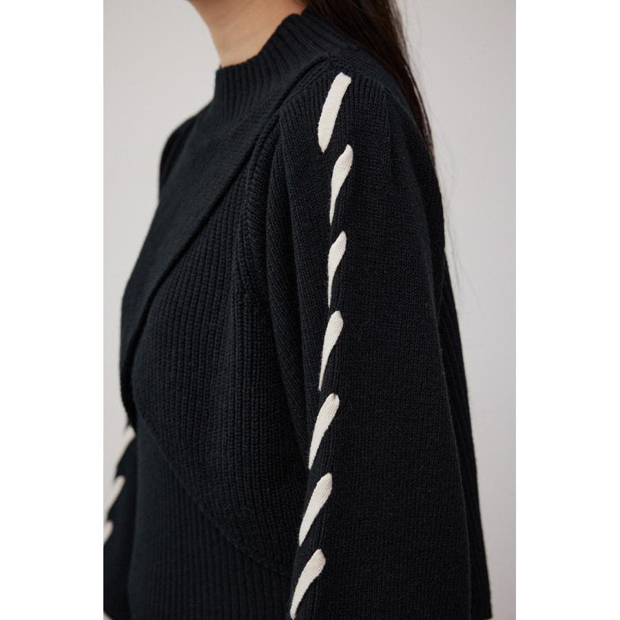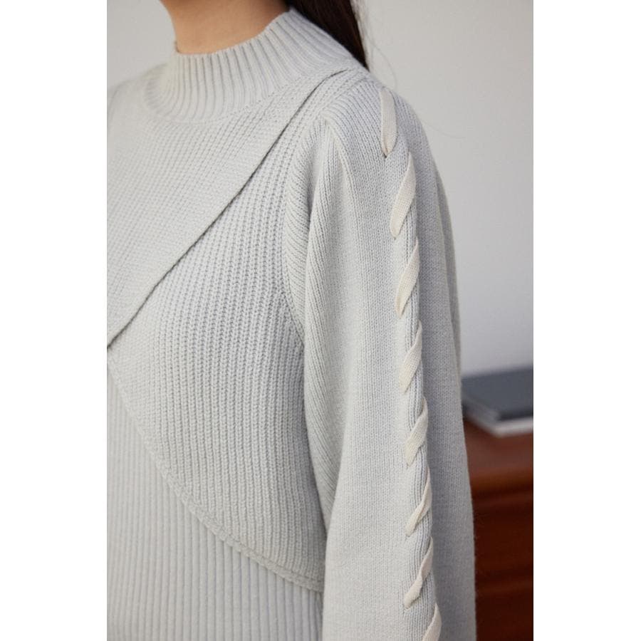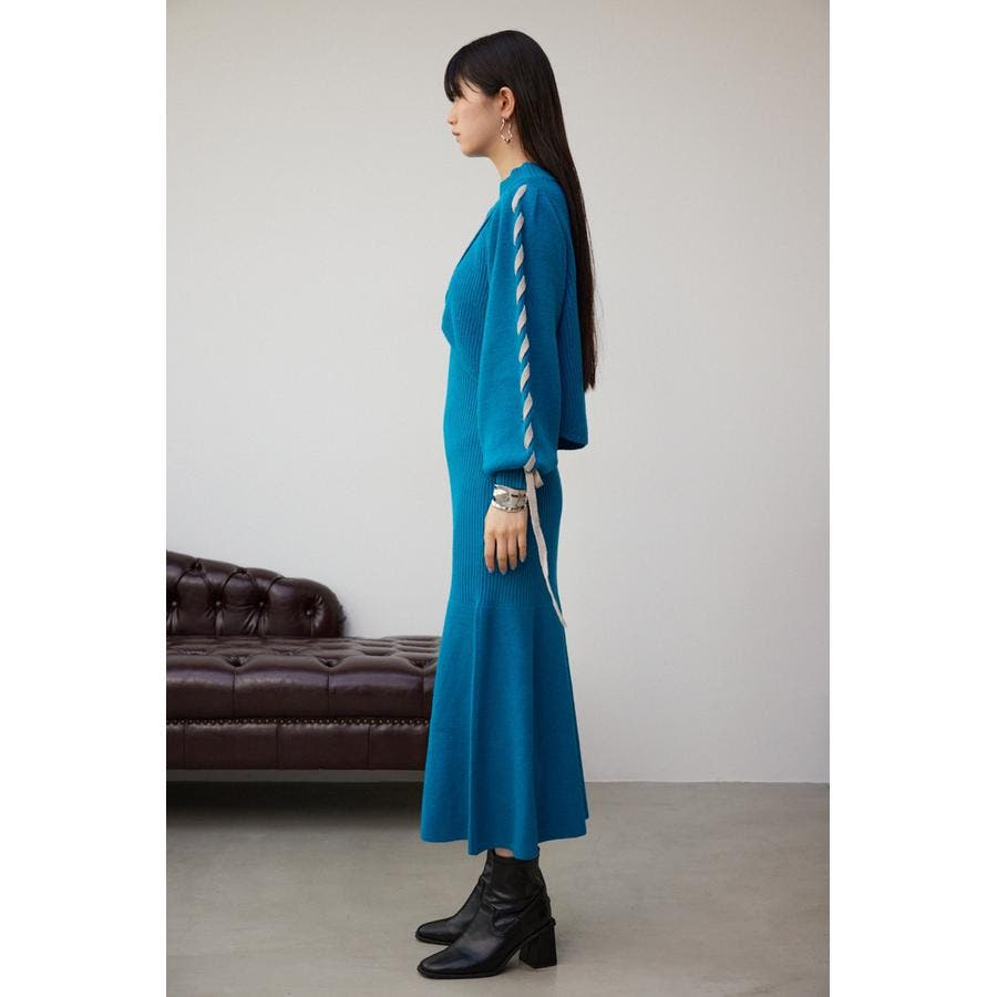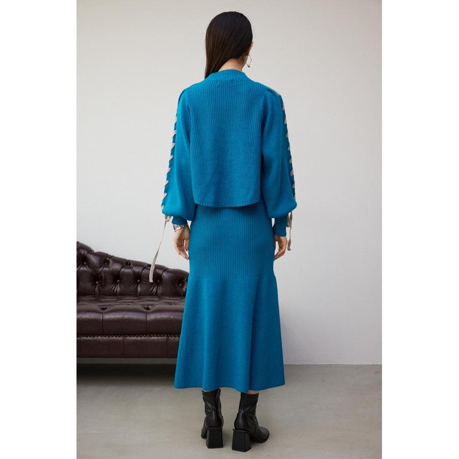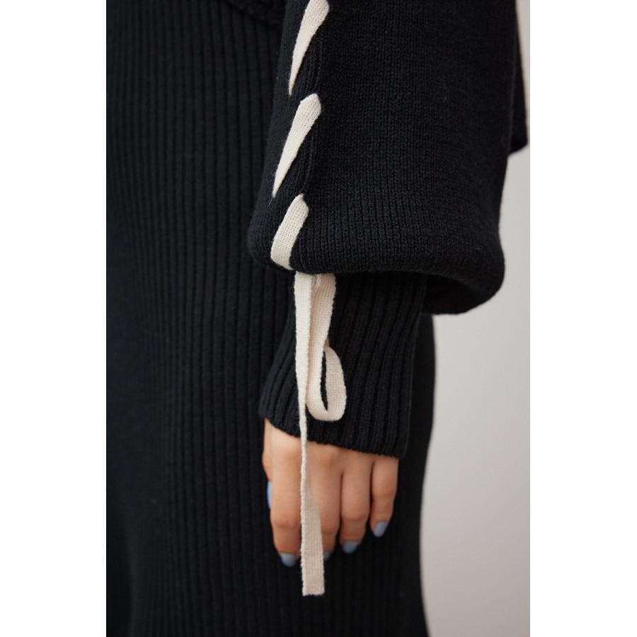 ・アウターのニットはフロントのカシュクールデザインと、ボリュームスリーブのレースアップデザインがポイント。