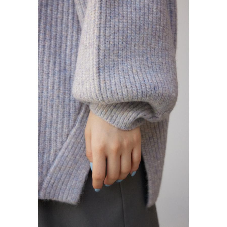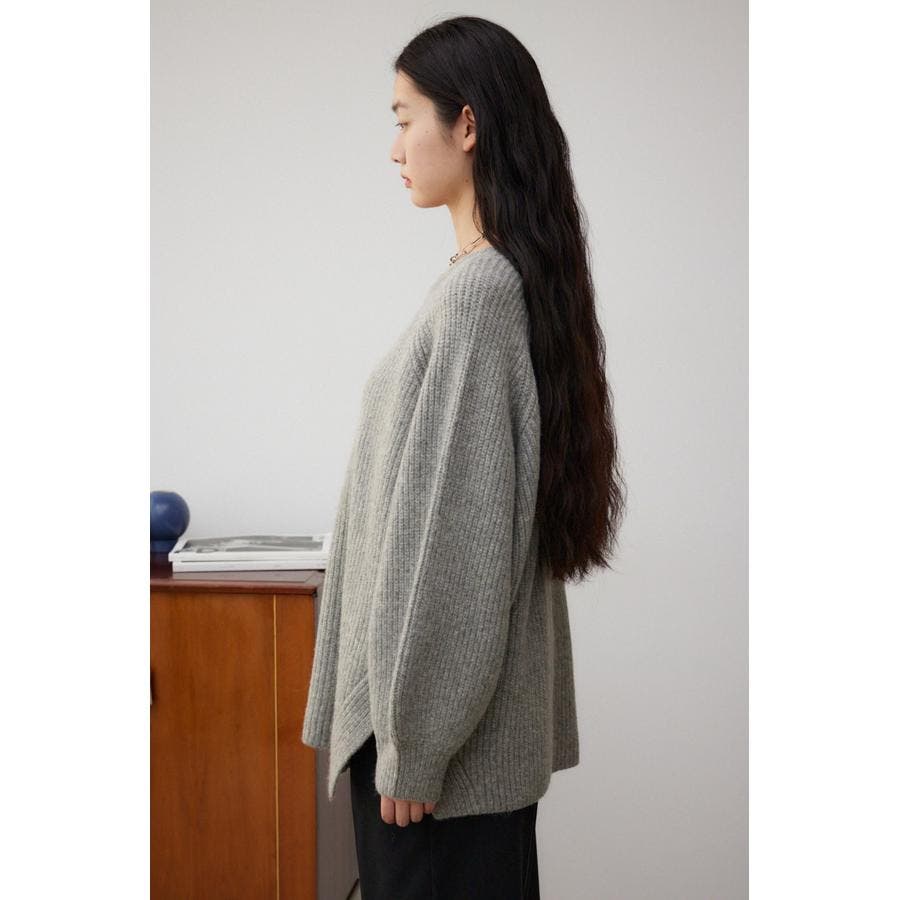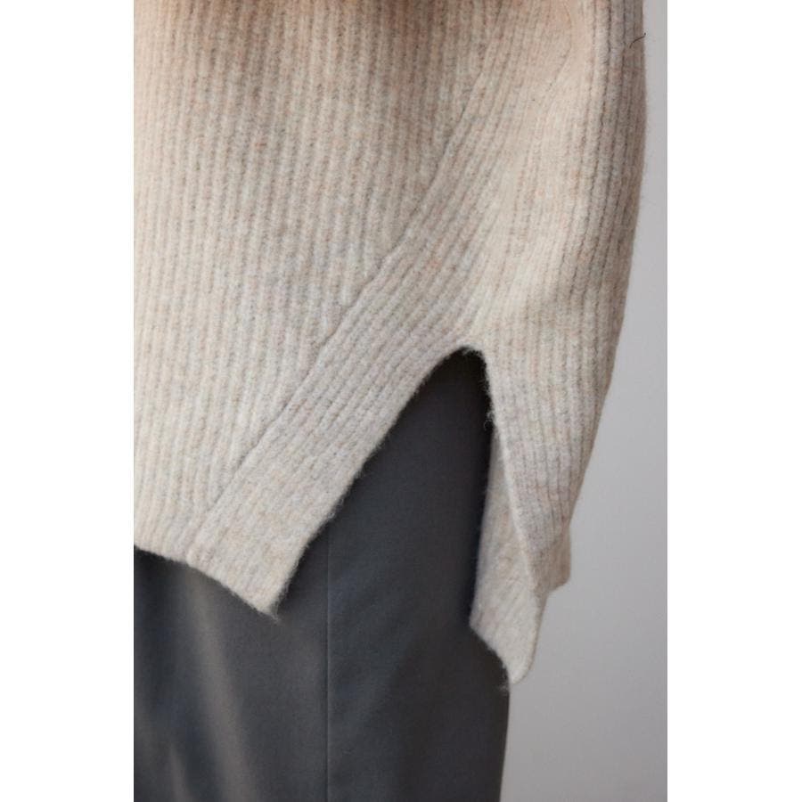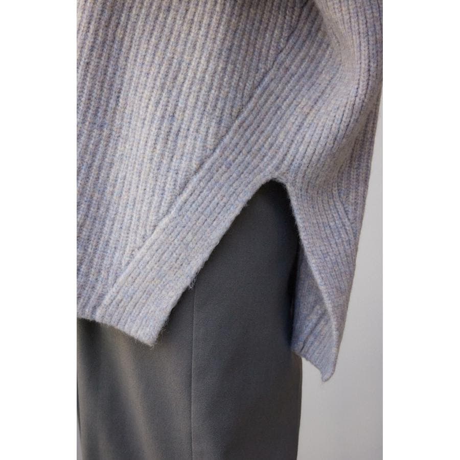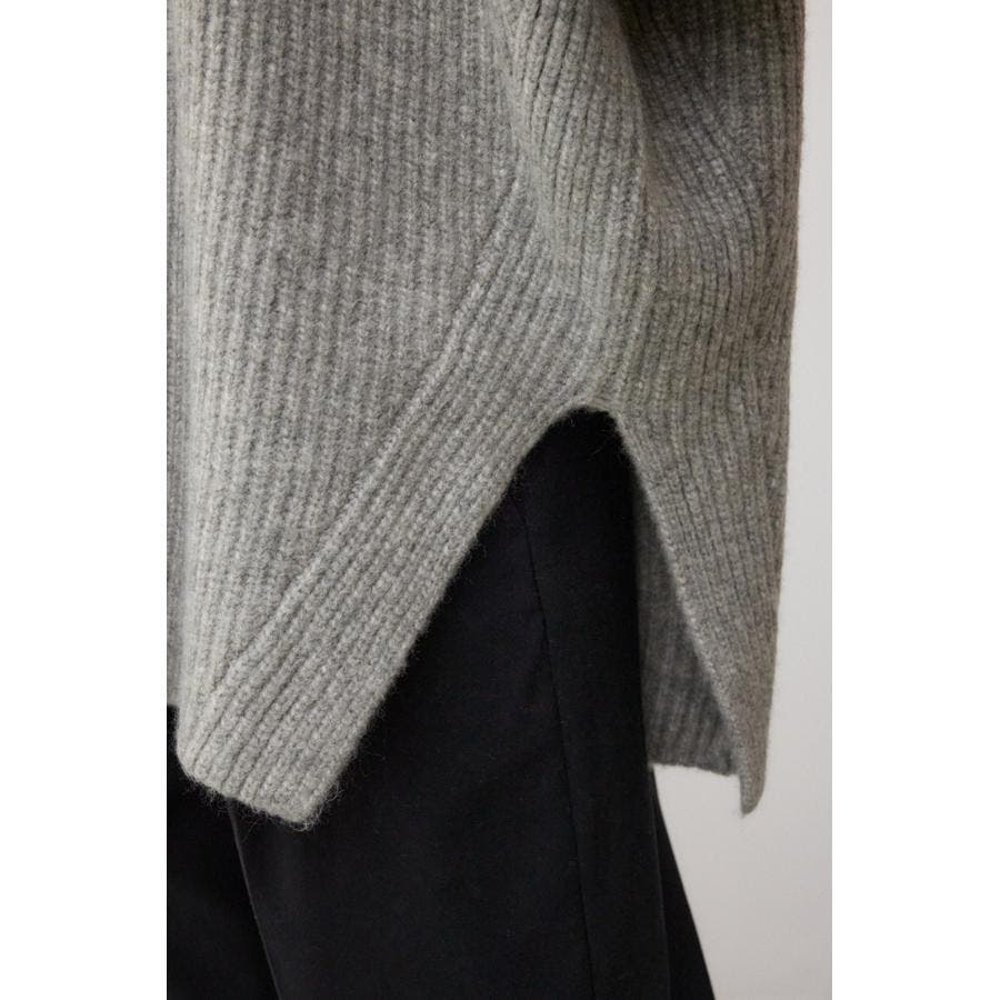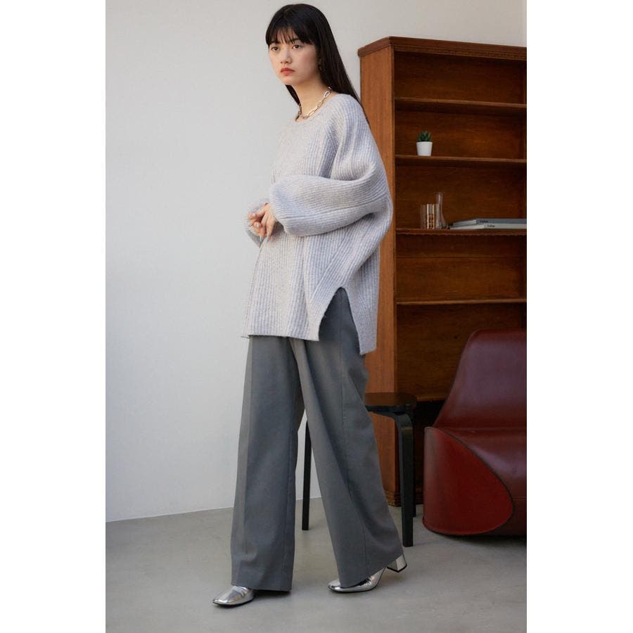 ・ミックス調の糸で編み上げた奥行きのあるカラーと、サイドスリットの入った抜け感のあるシルエットがポイント。