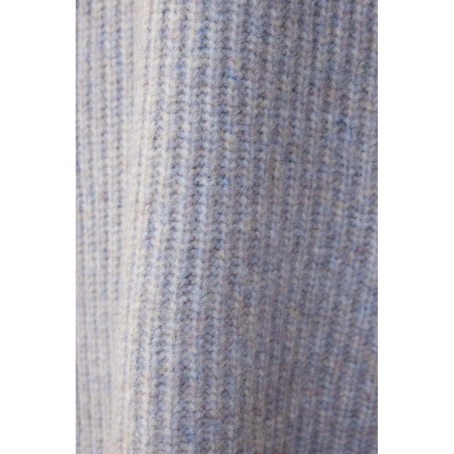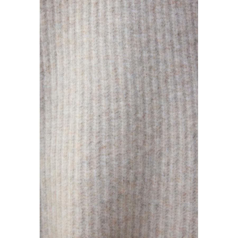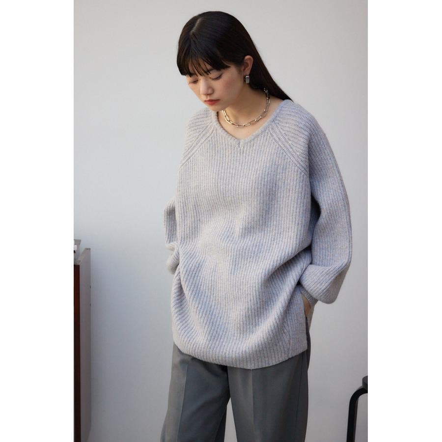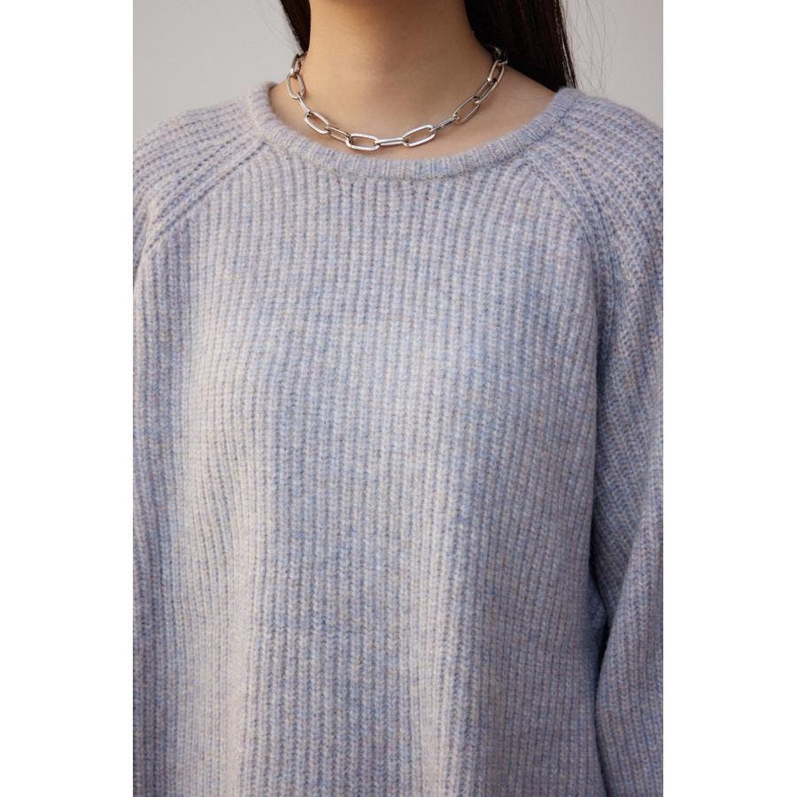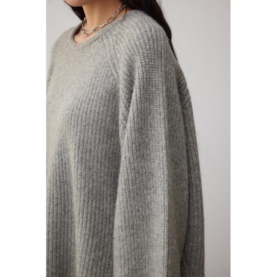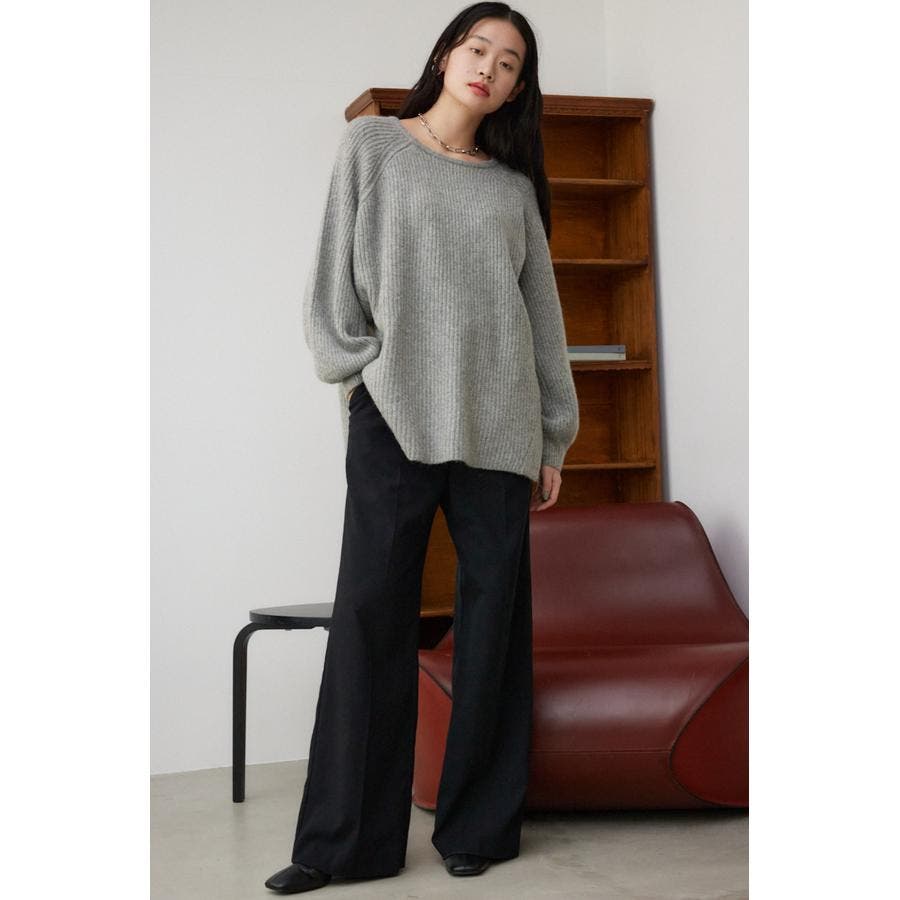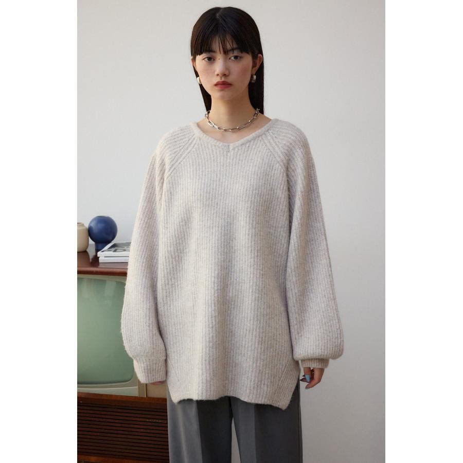 ・ミックス調の糸で編み上げた奥行きのあるカラーと、サイドスリットの入った抜け感のあるシルエットがポイント。