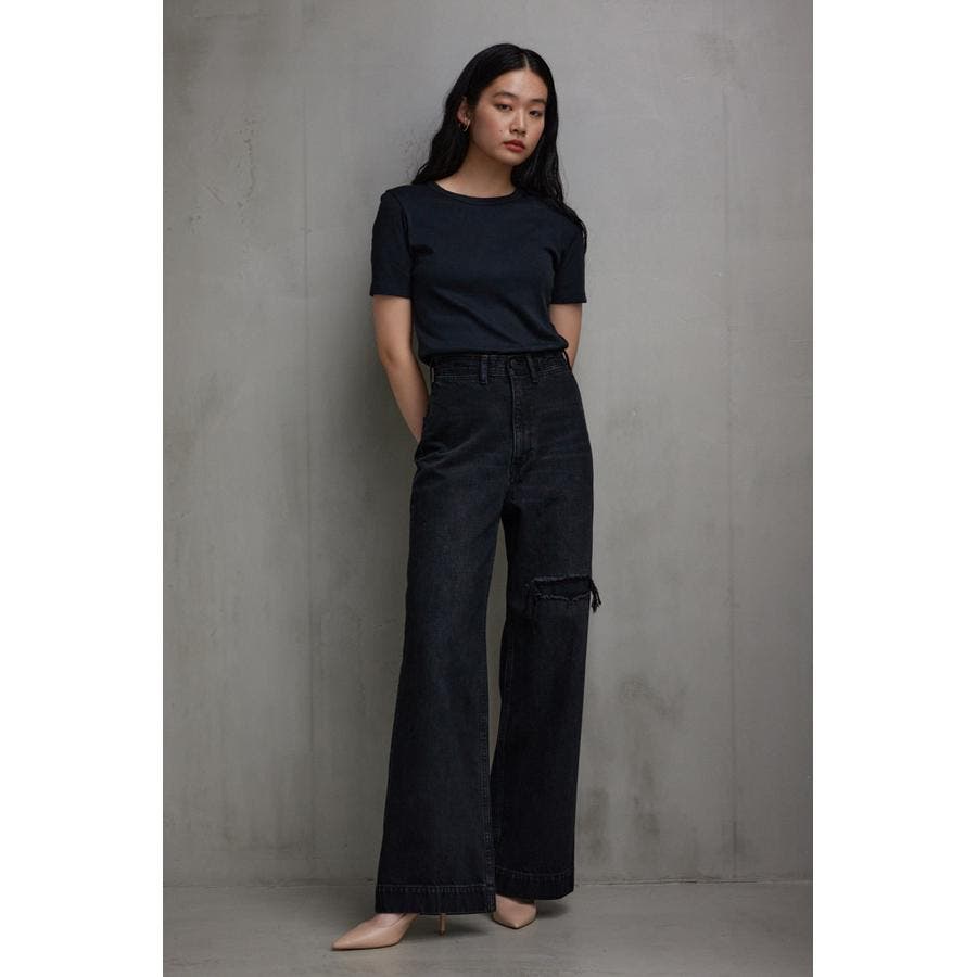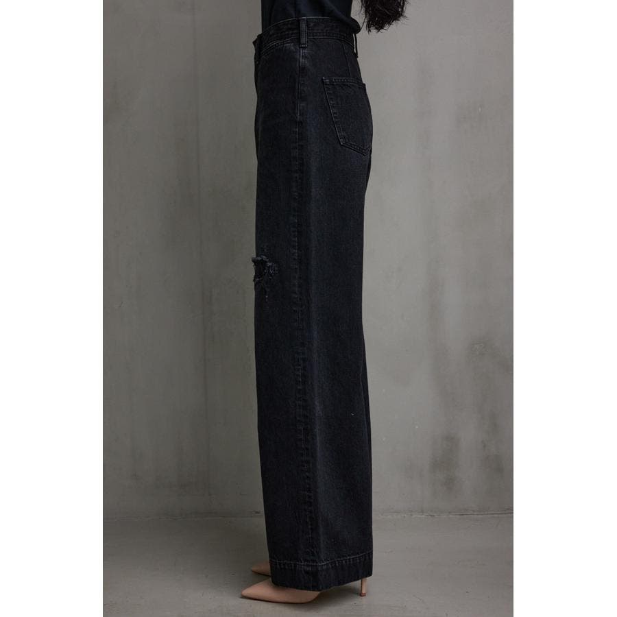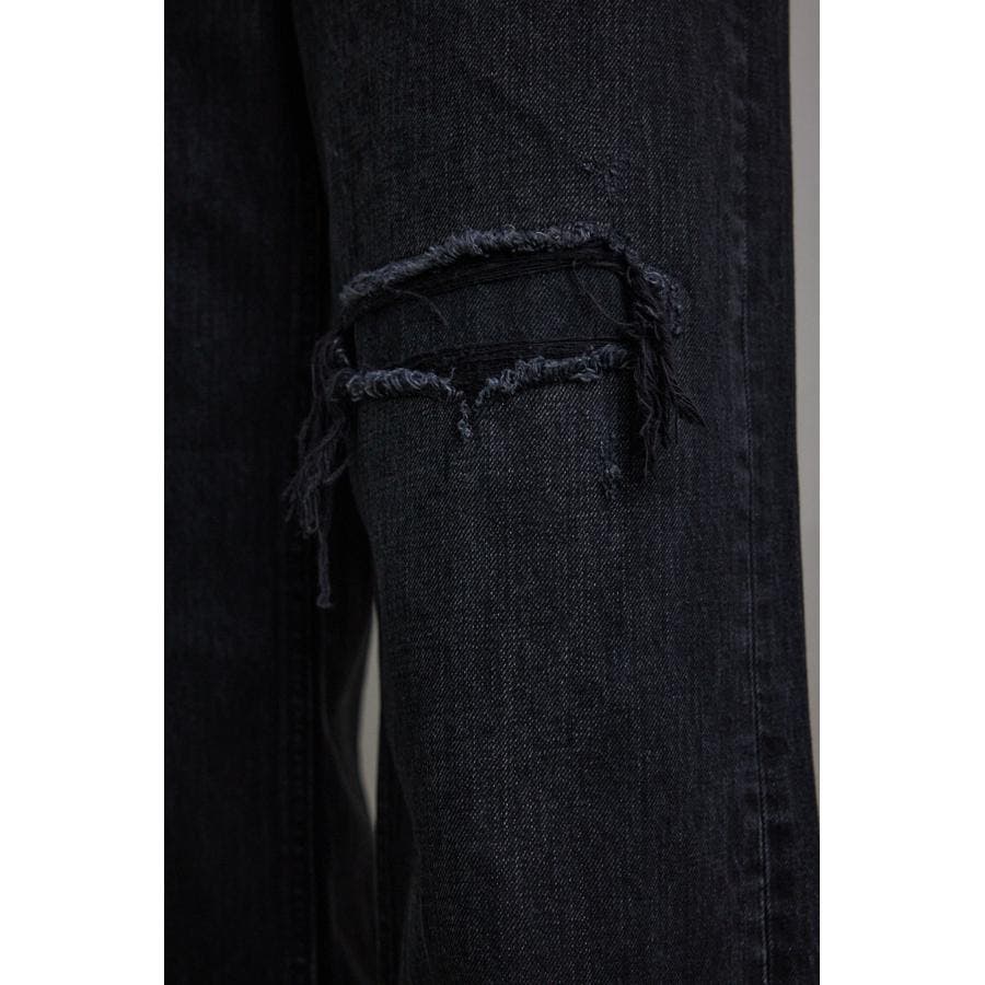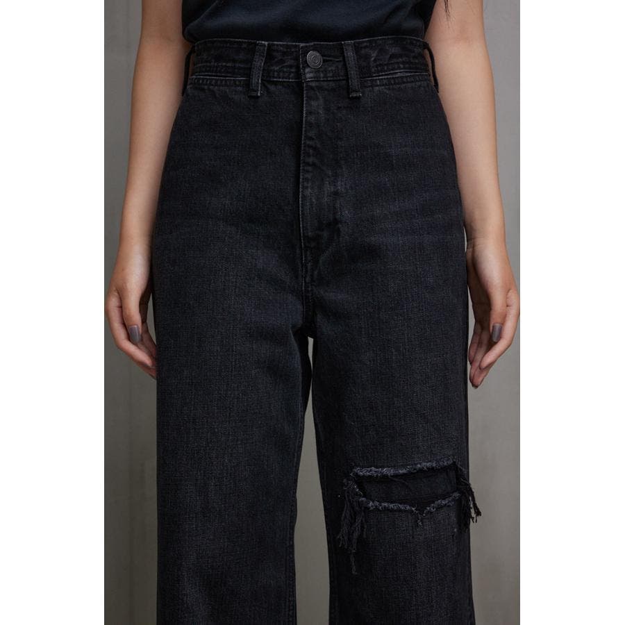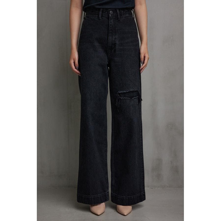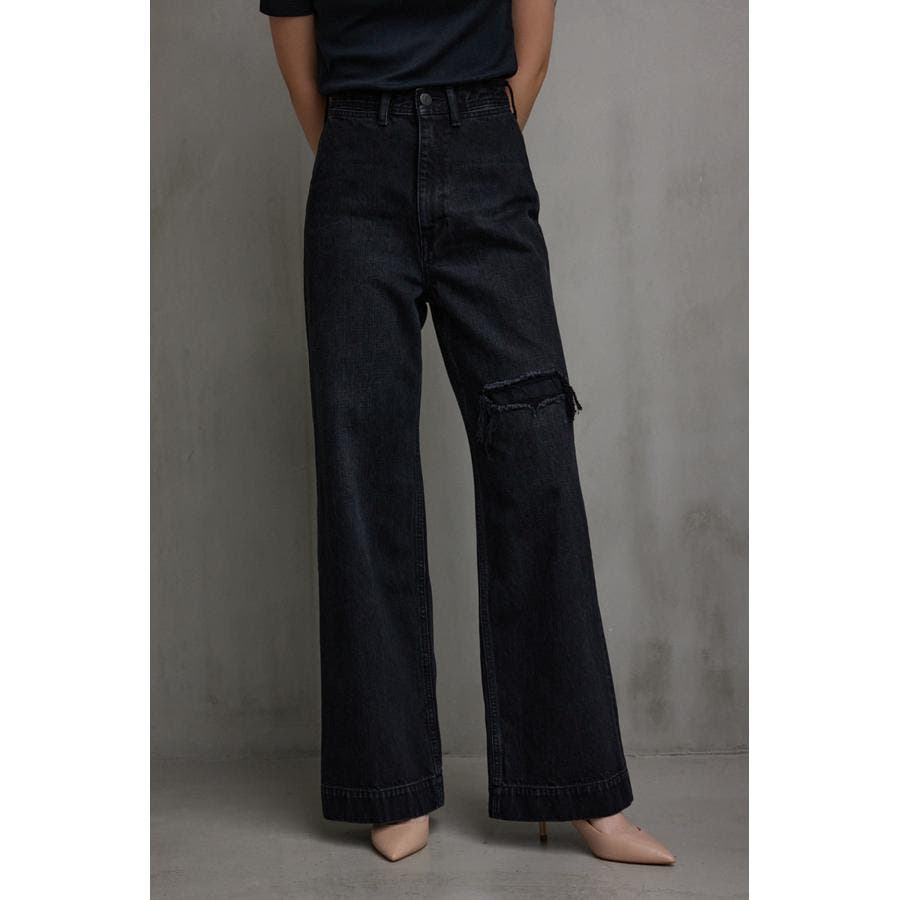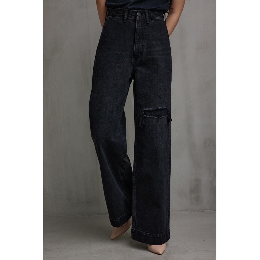 ・ワイドレッグシルエットと、膝上に設定されたリペアデザインが脚長効果を演出し、存在感のある1本に仕上げました。