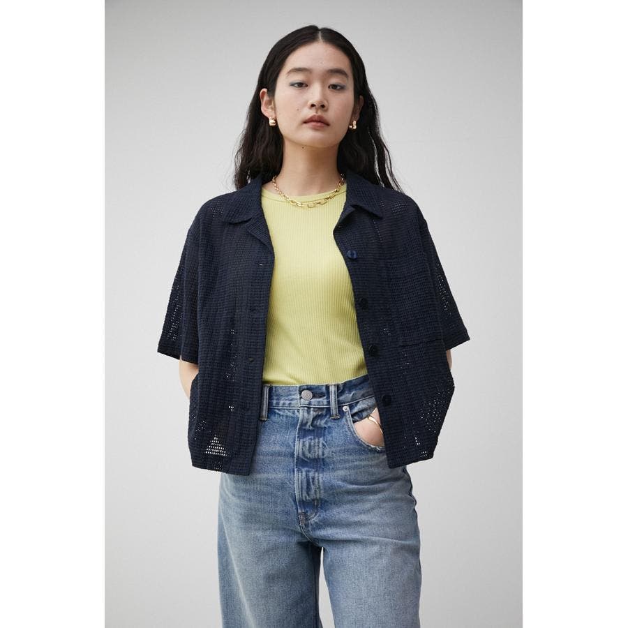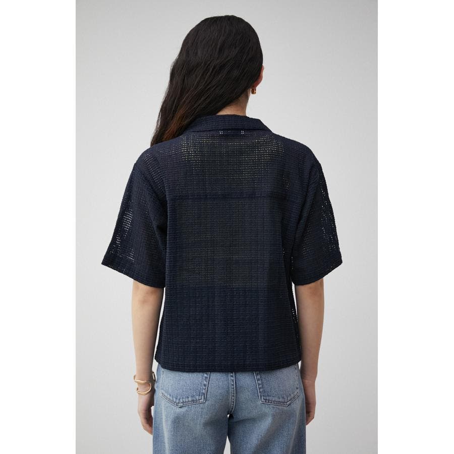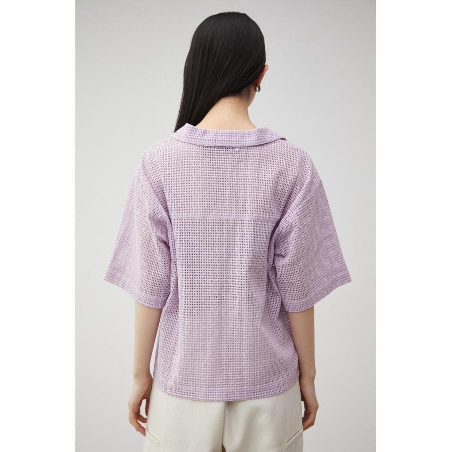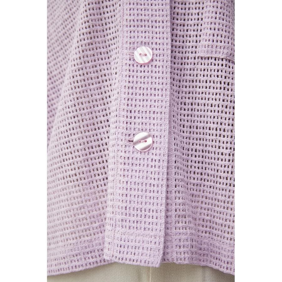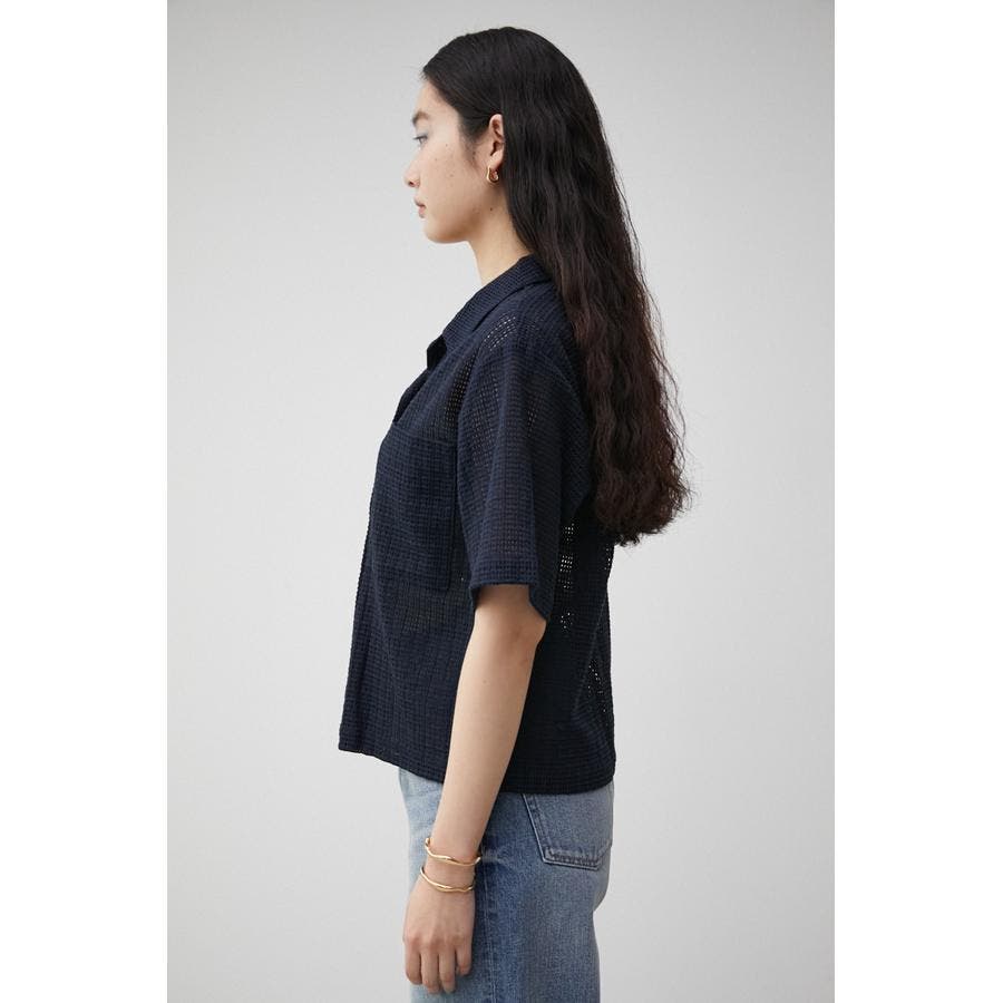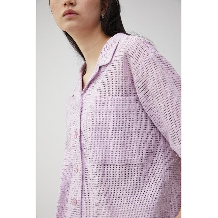 ・メンズライクなボクシーシルエットの開襟シャツをメッシュ素材で仕上げ、フロントに貝調ボタンを施すことで女性らしさのあるトレンドライクな印象に。