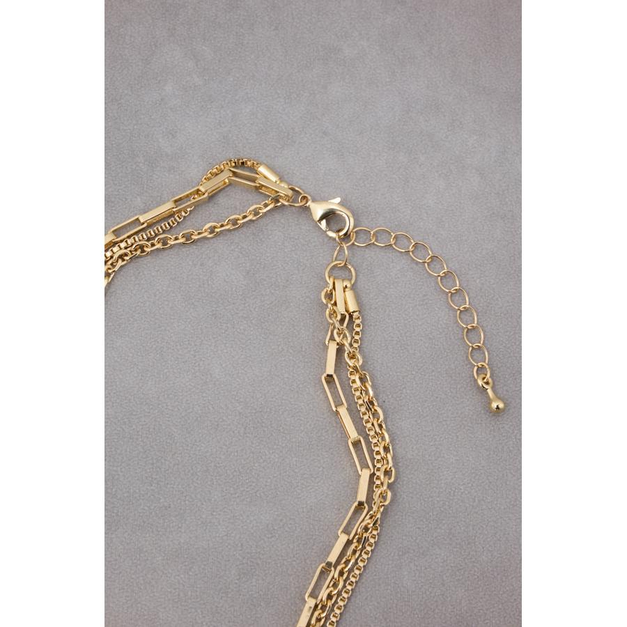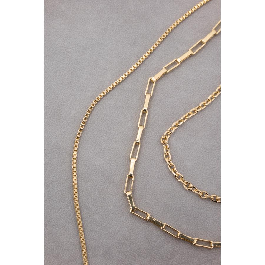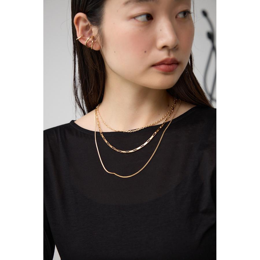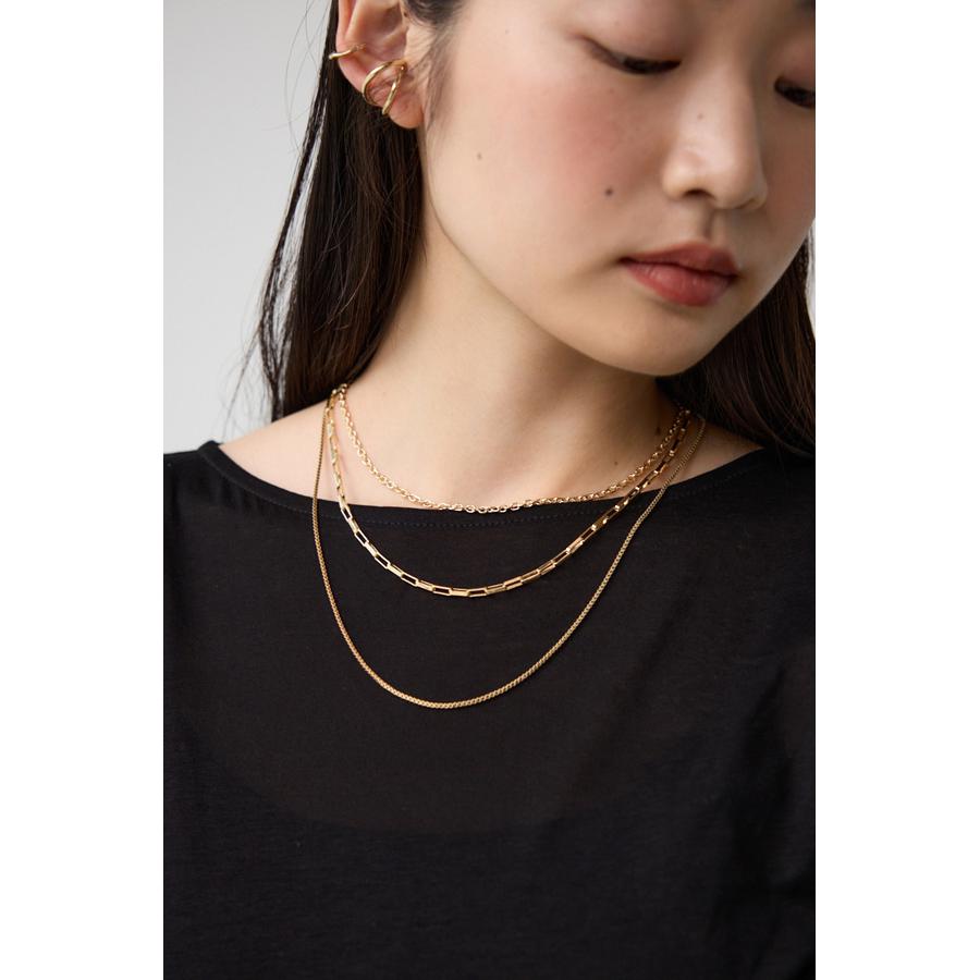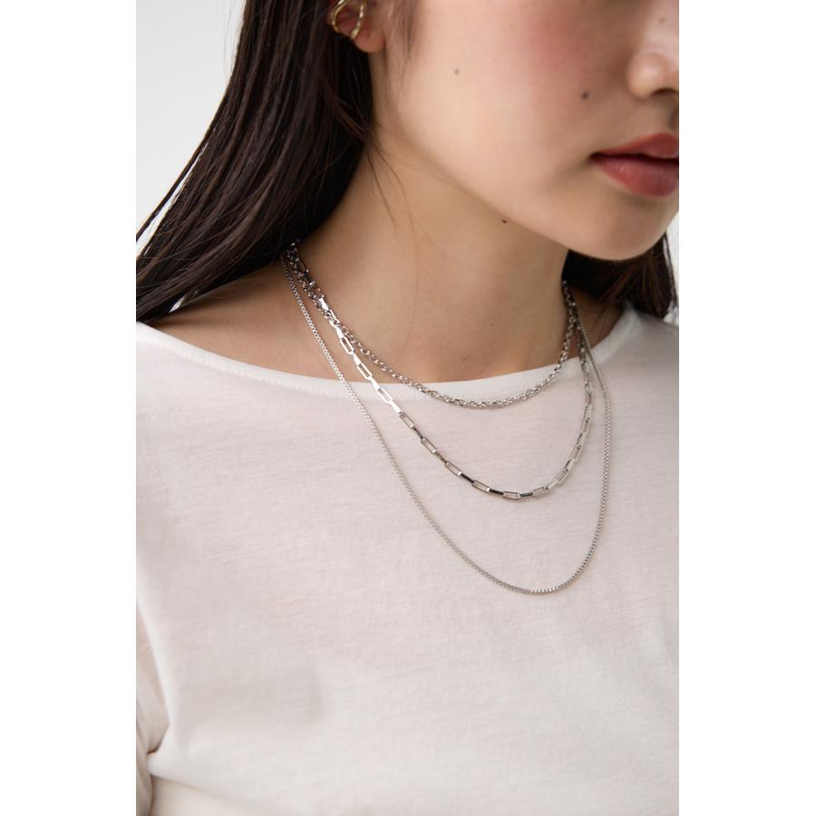 異なったデザインのチェーンが重なり合った3連ネックレス。