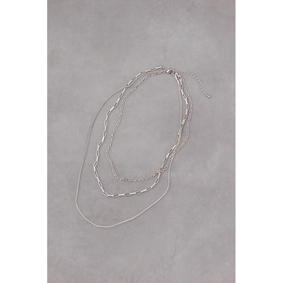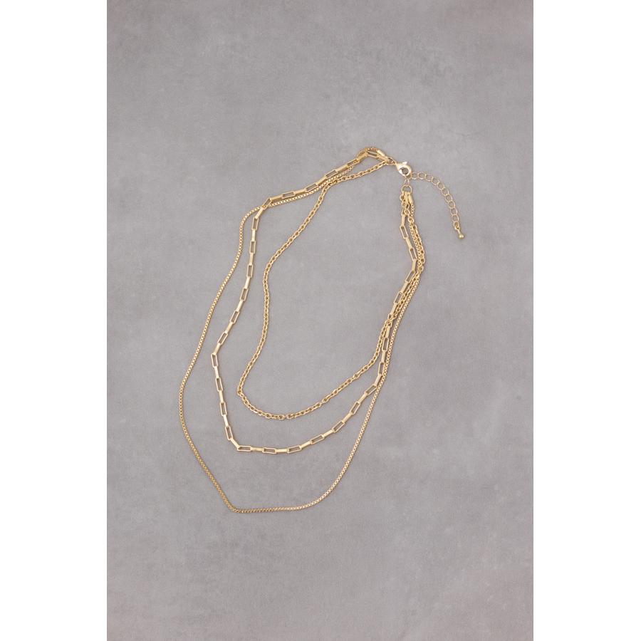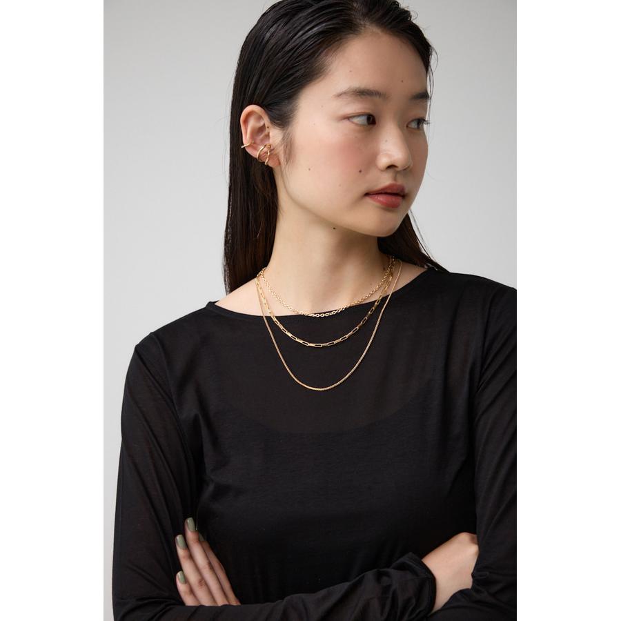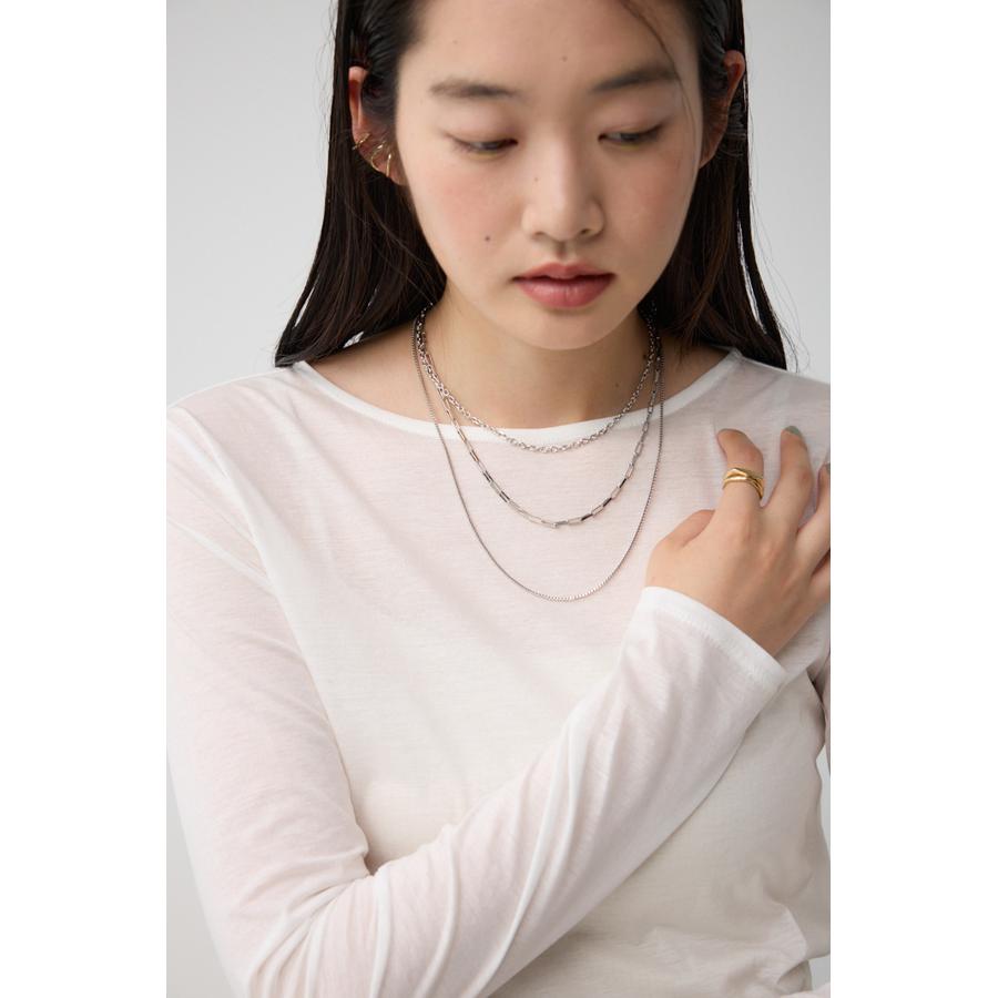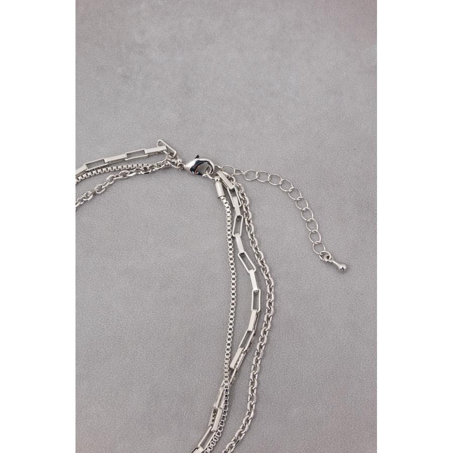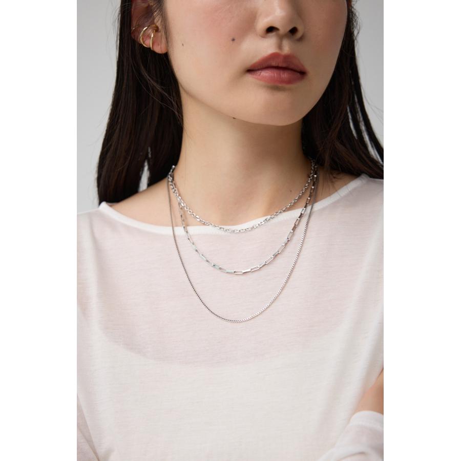 異なったデザインのチェーンが重なり合った3連ネックレス。