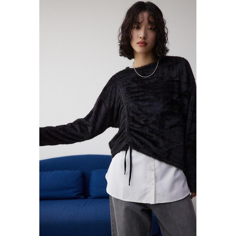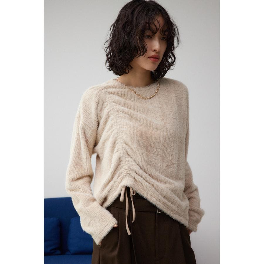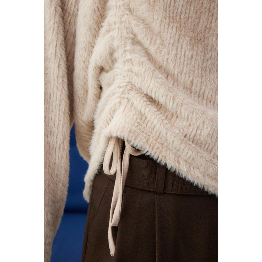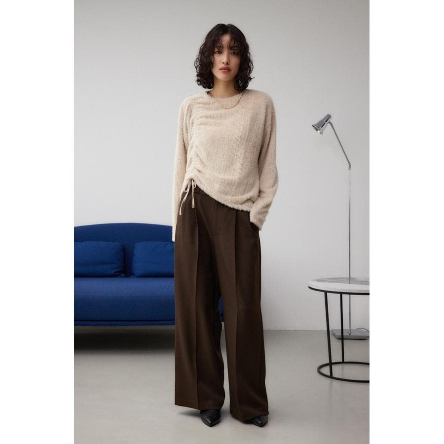 身頃の片側がシャーリングのデザインとなっており。絞るとアシンメトリーのデザインになり違ったスタイルを楽しめます。