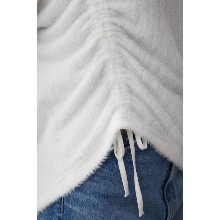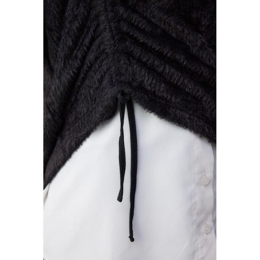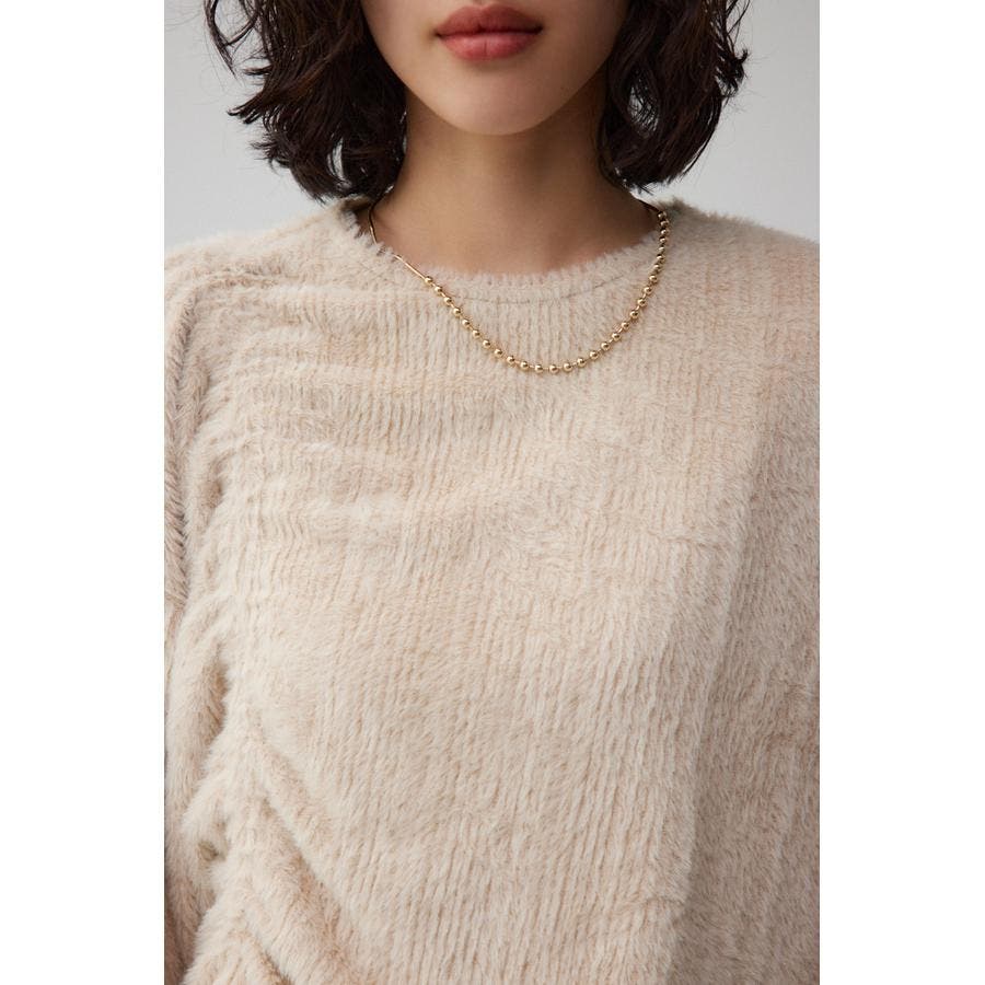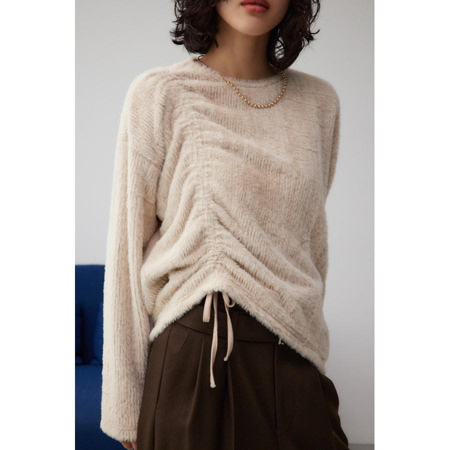 身頃の片側がシャーリングのデザインとなっており。絞るとアシンメトリーのデザインになり違ったスタイルを楽しめます。