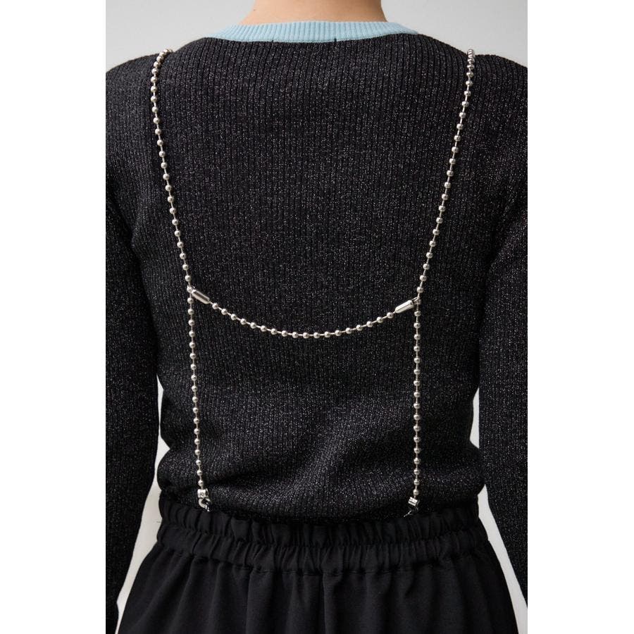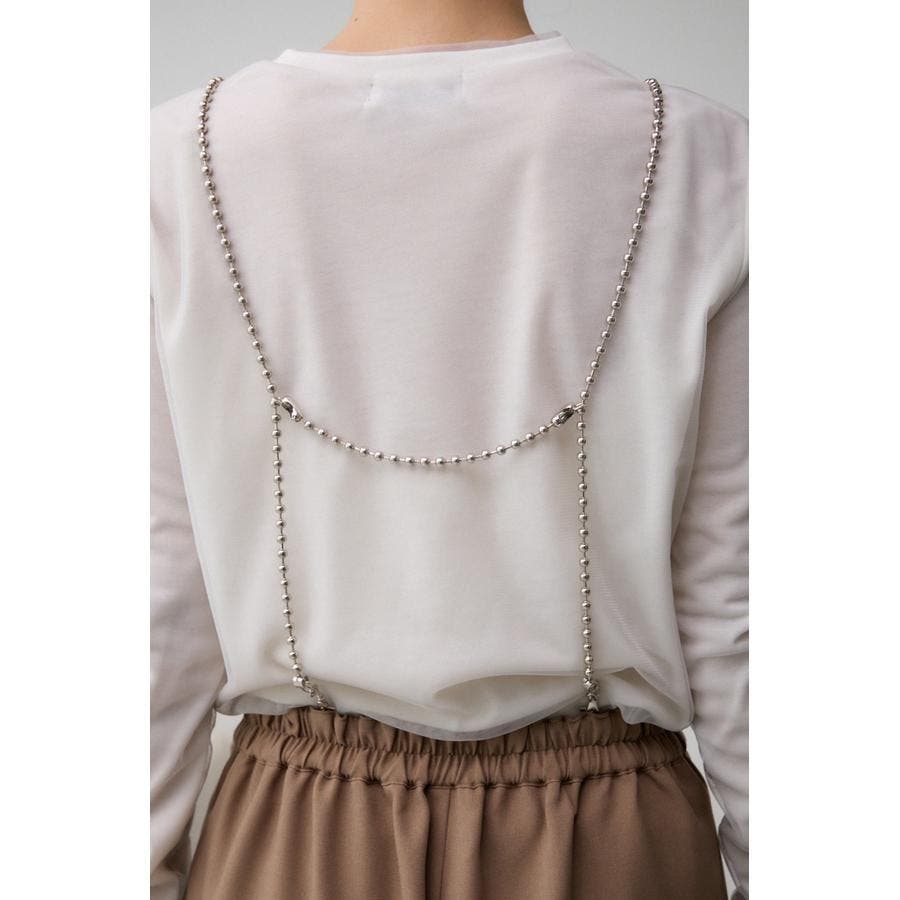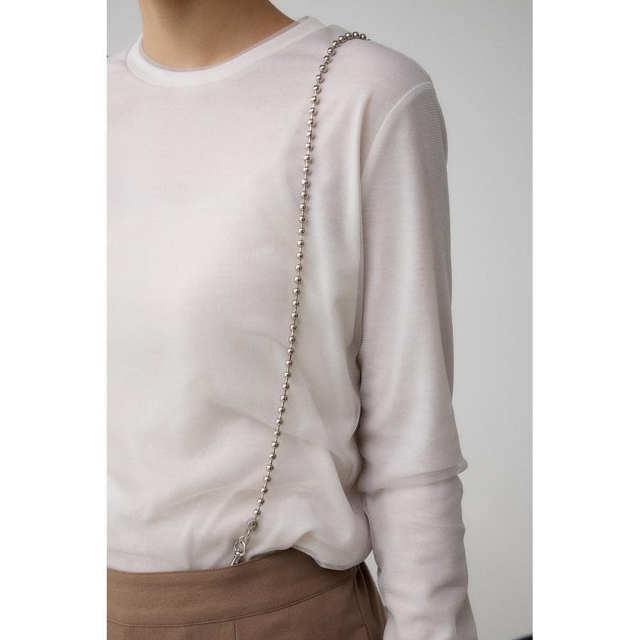 取り外しの出来るチェーンストラップがついているため、シンプルなハイゲージのニットなどに合わせるだけでトレンドらしさが出ます。