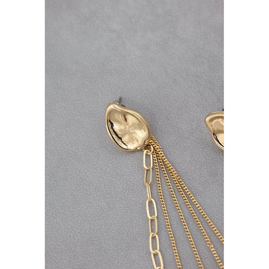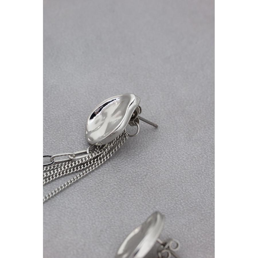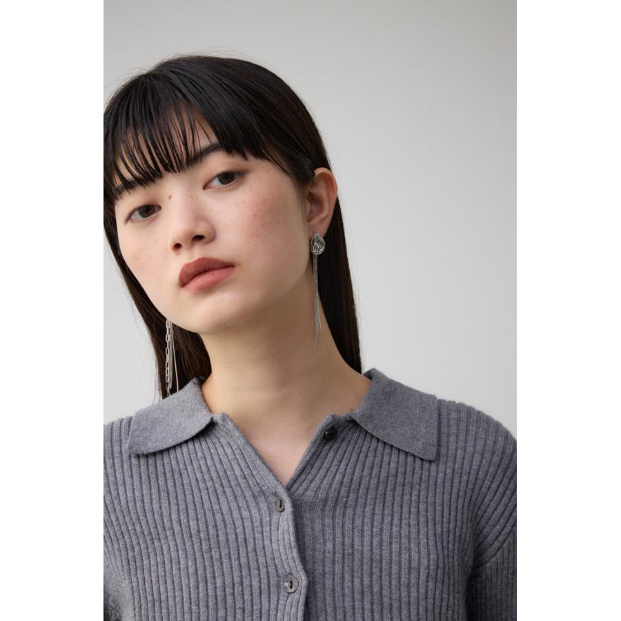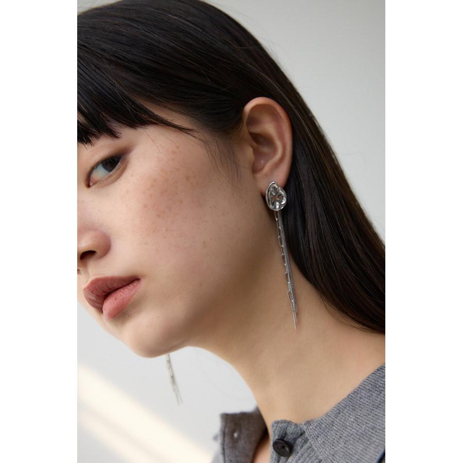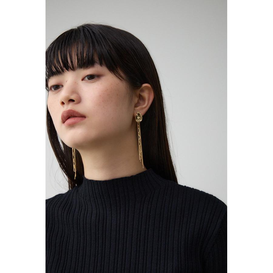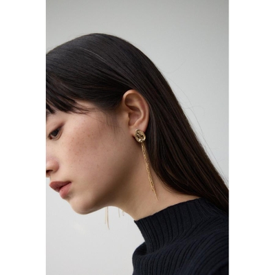 ニュアンス感のあるモチーフから様々なチェーンが組み合わさり、優雅に垂れ下がるマルチチェーンスウィングピアス。