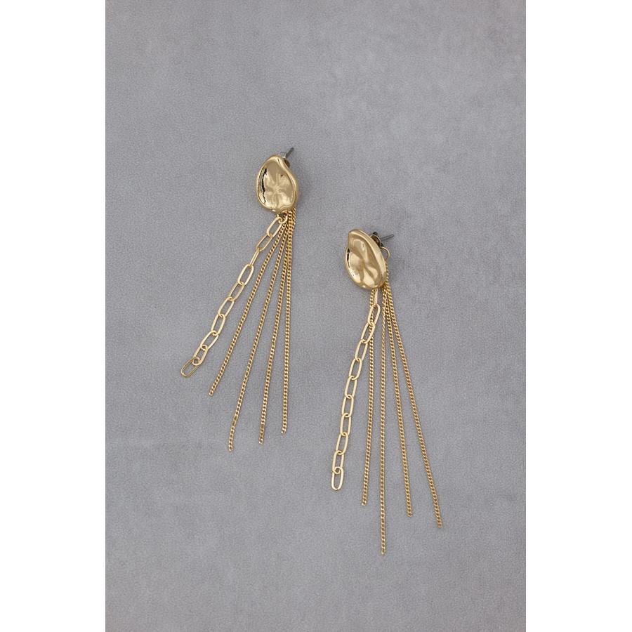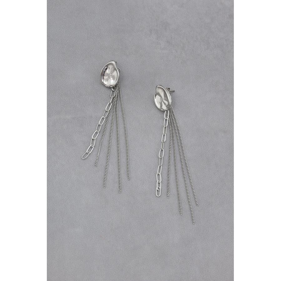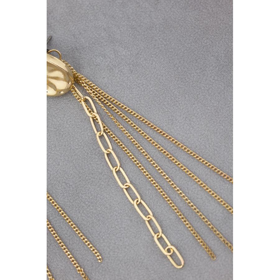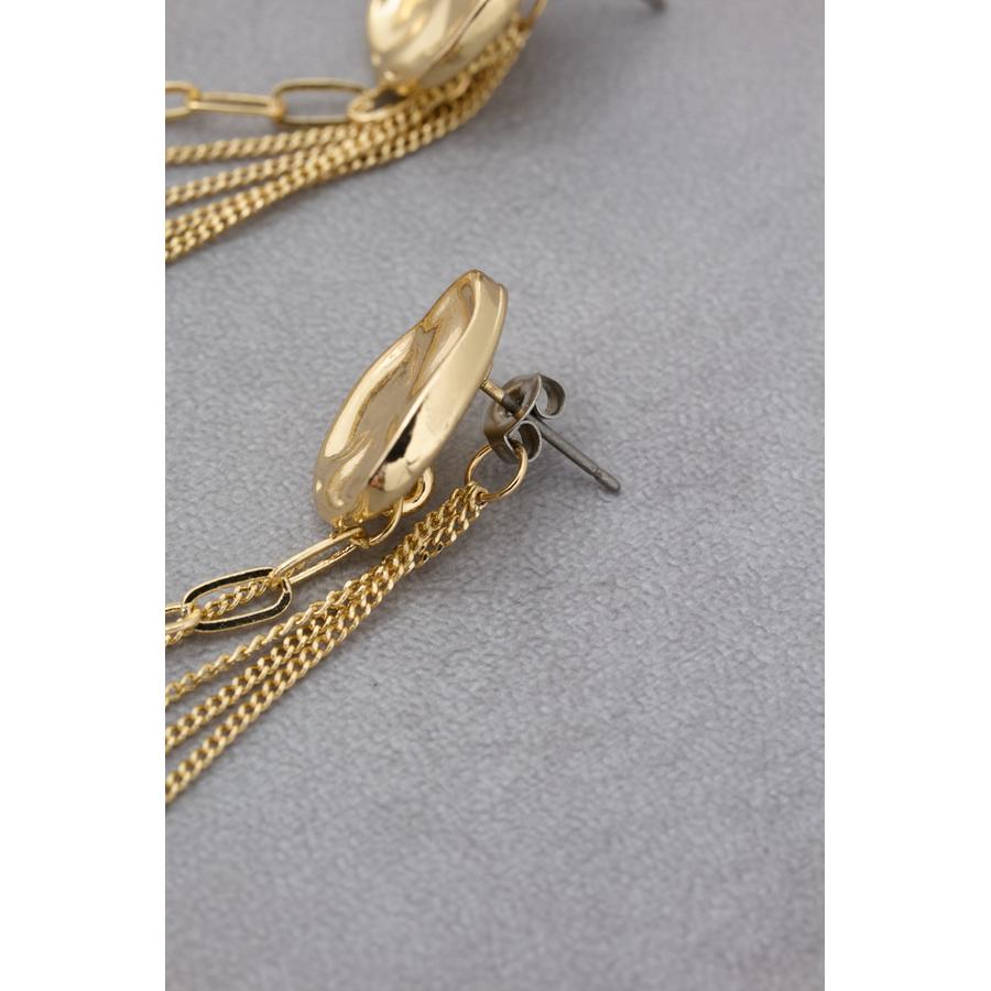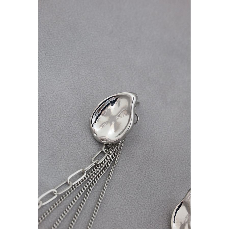 ニュアンス感のあるモチーフから様々なチェーンが組み合わさり、優雅に垂れ下がるマルチチェーンスウィングピアス。