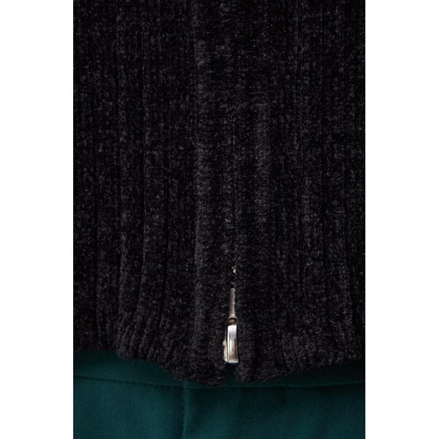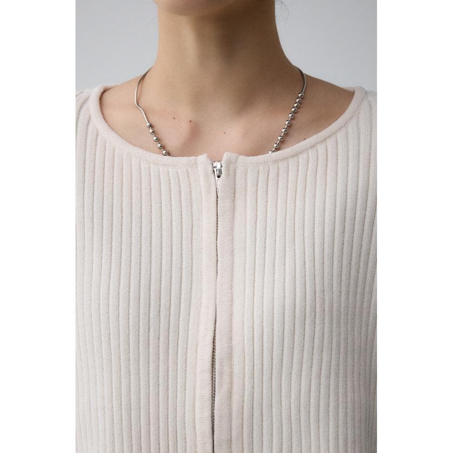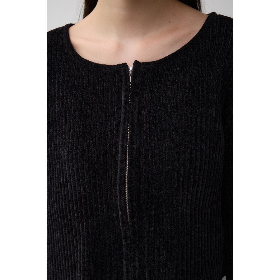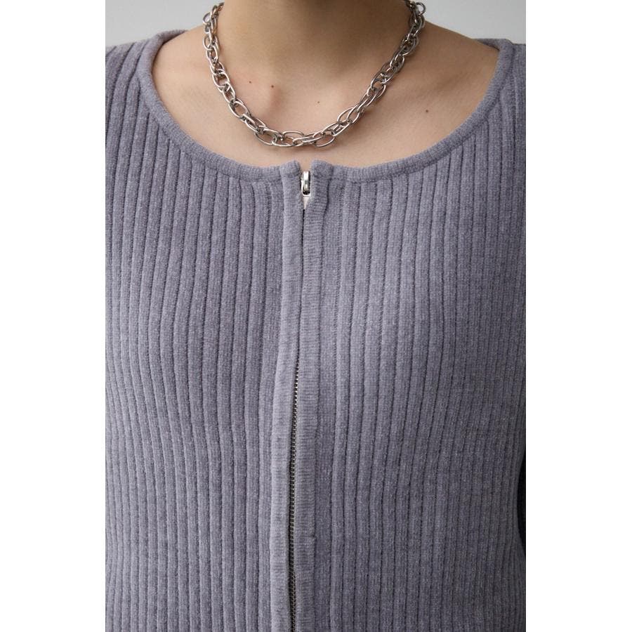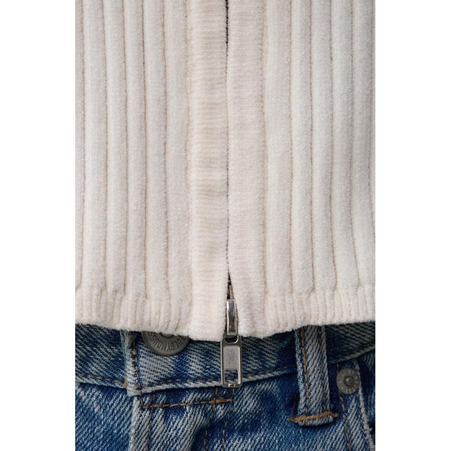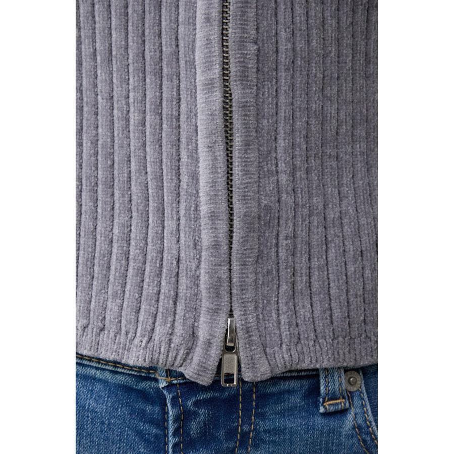 カジュアルなジップ使いを光沢のあるキレイ目なモールヤーンに用いることで、女性らしさも出せる一枚です。