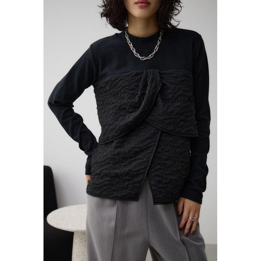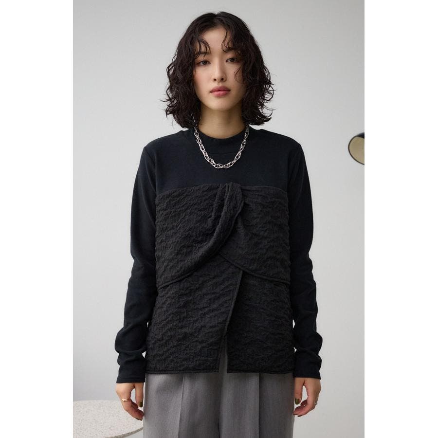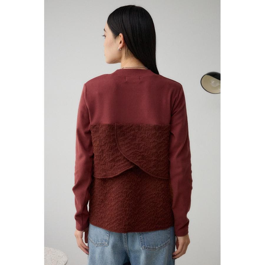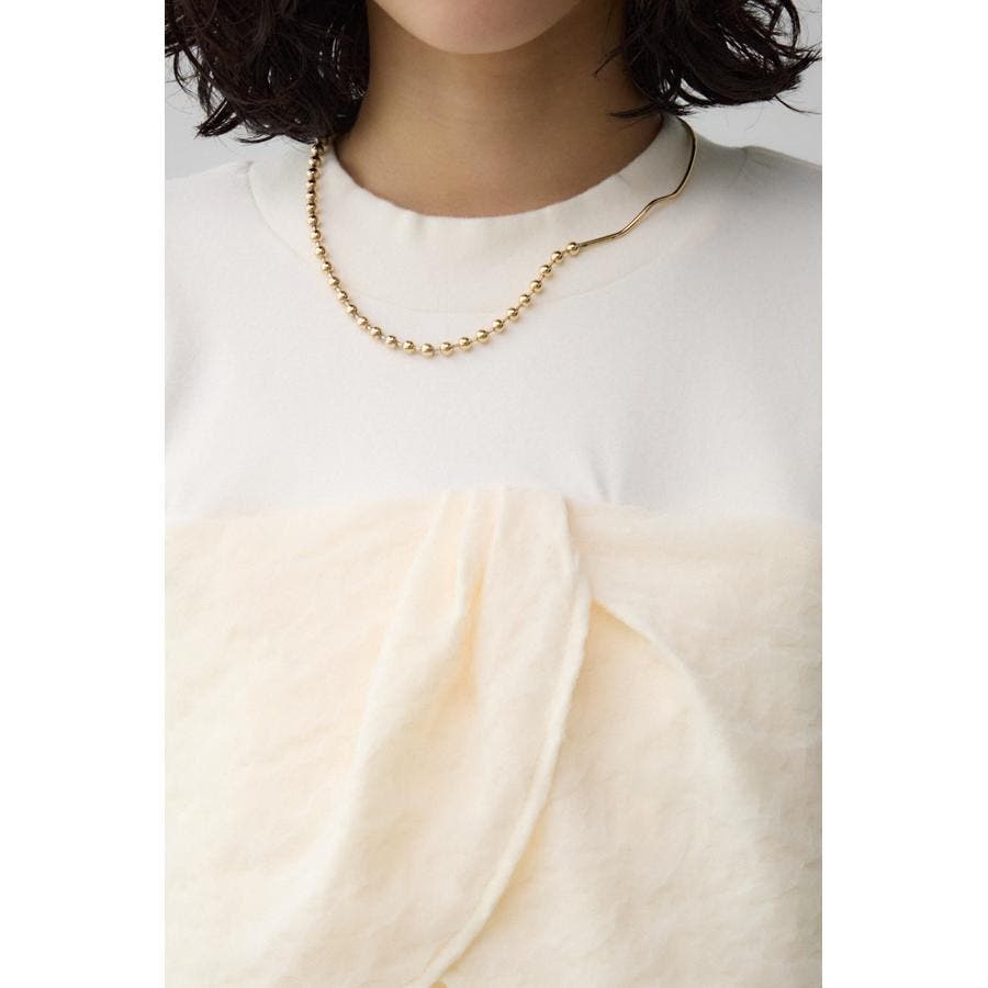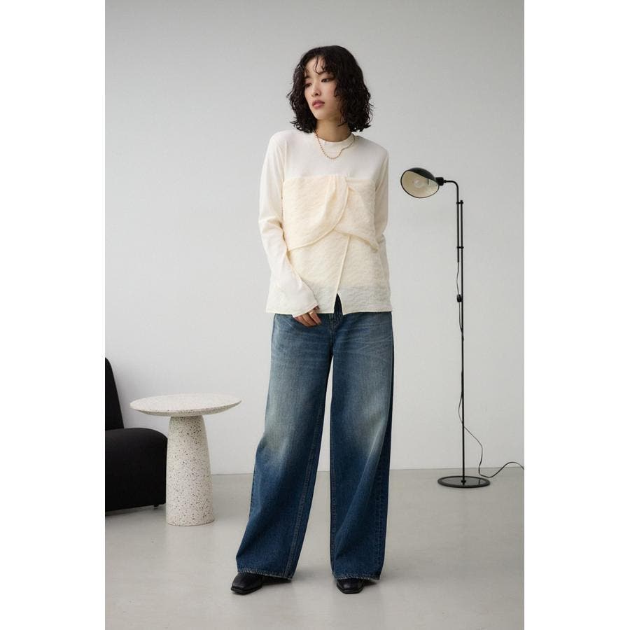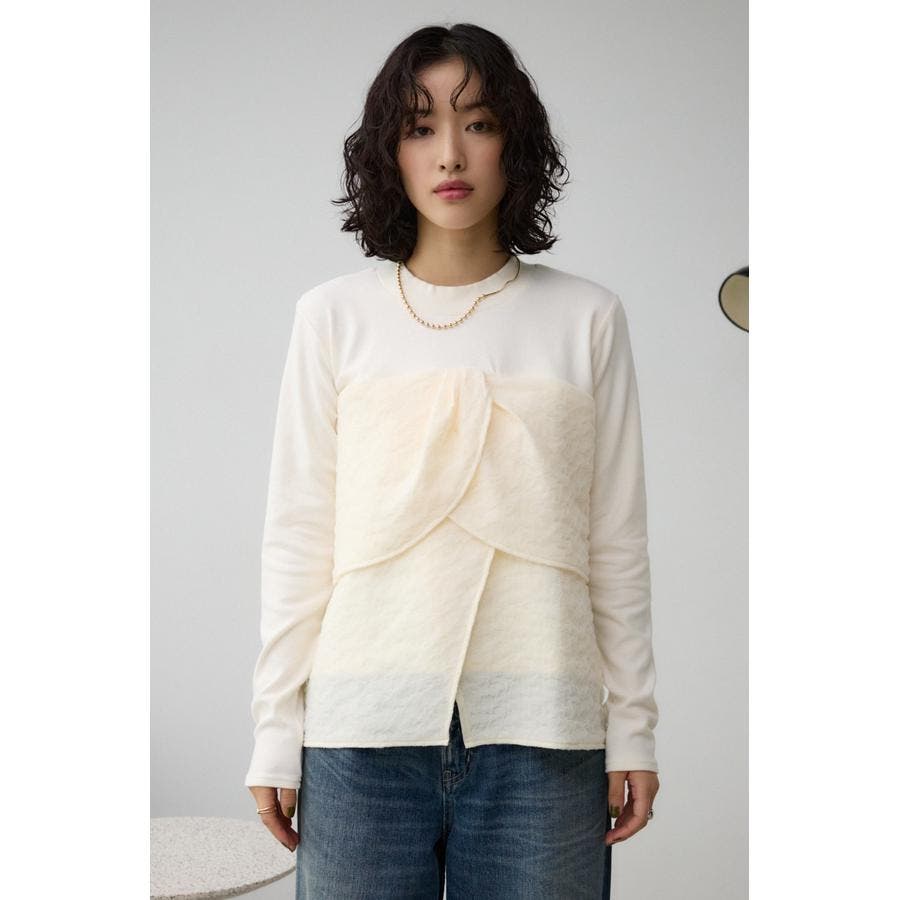 シルエットはすっきりとしていてカットソーとオーガンジーの布帛のドッキングトップス。