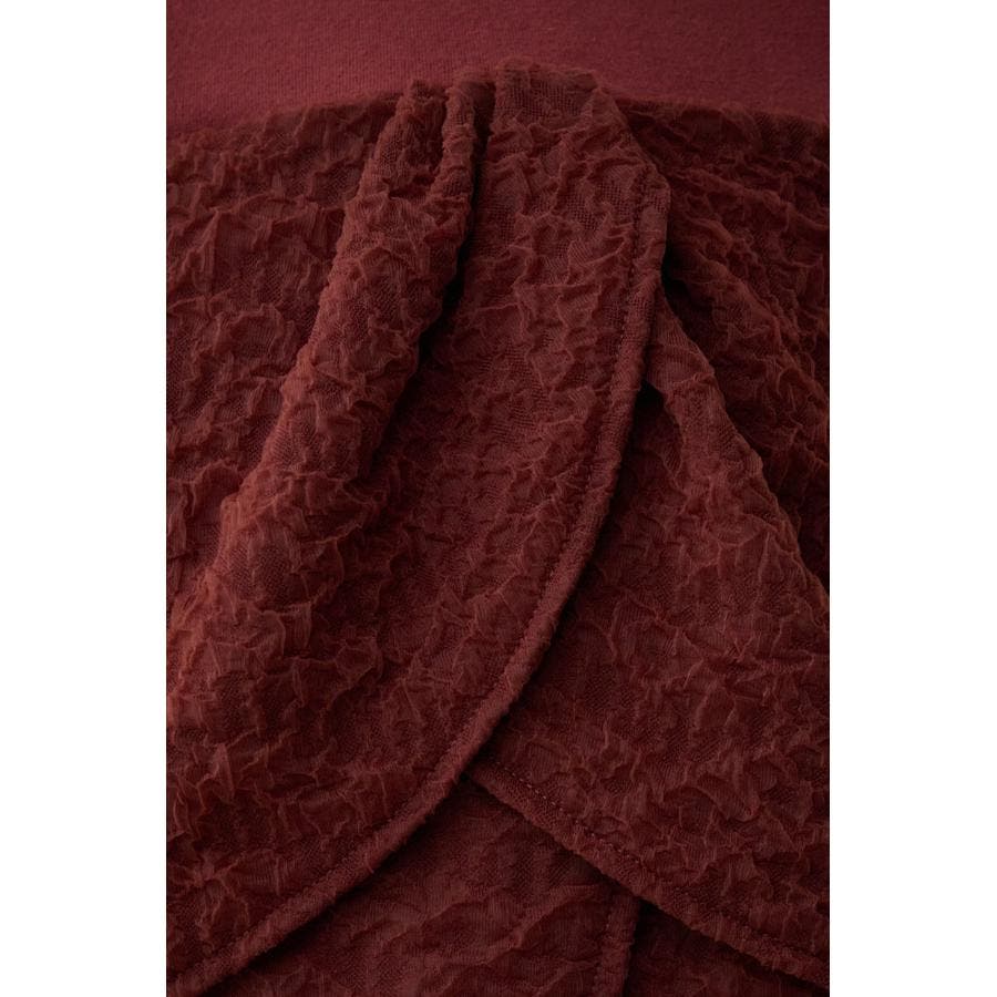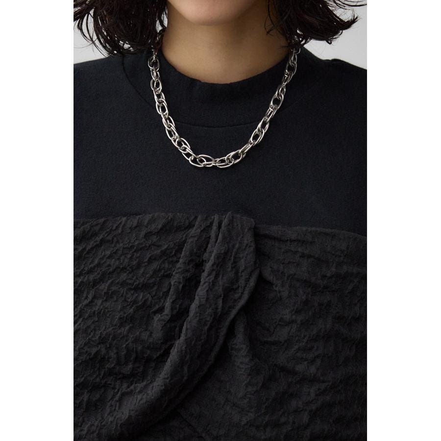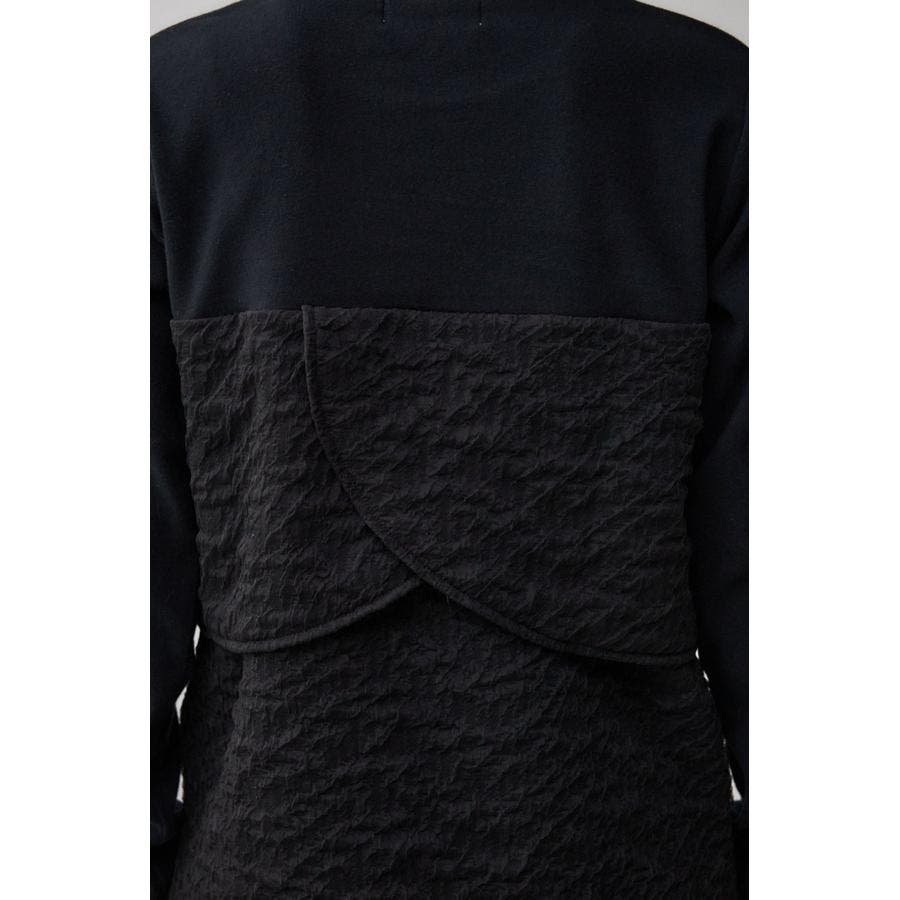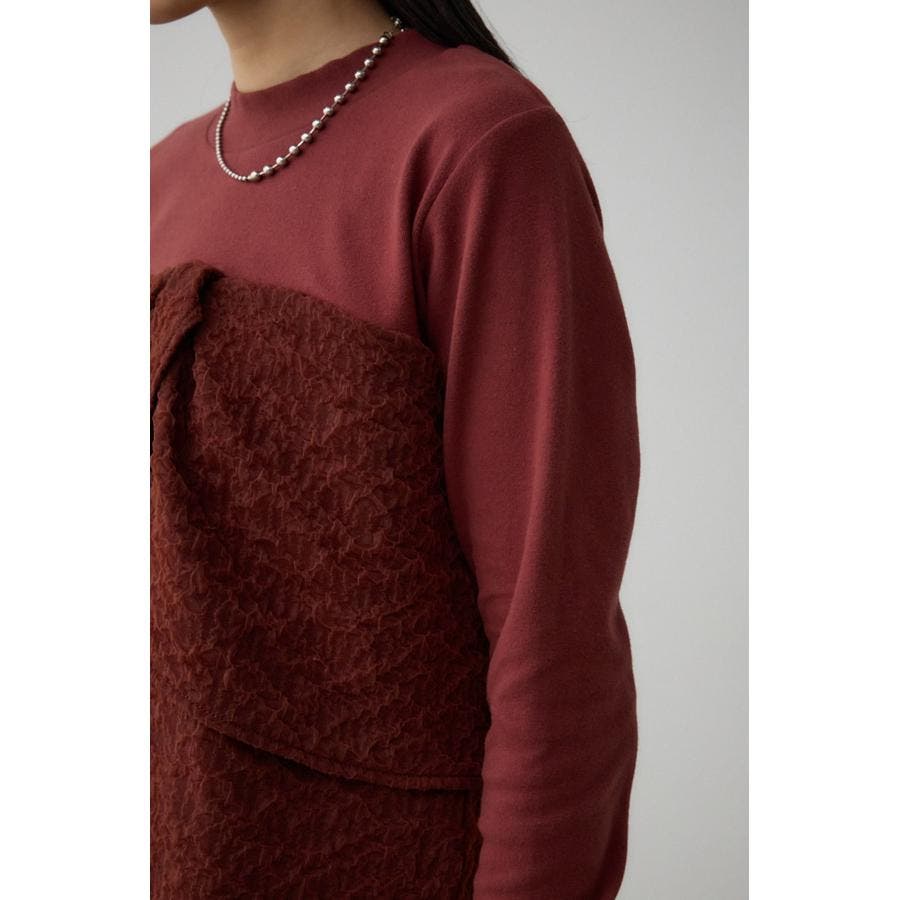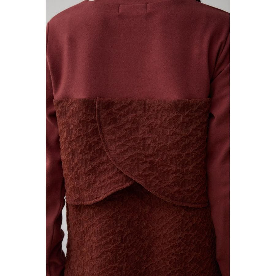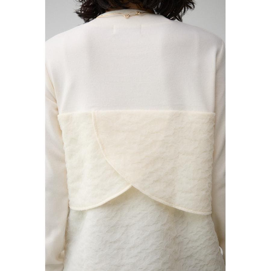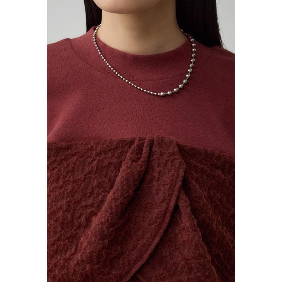 低めのハイネックで、胸からオーガンジー生地を重ねた切替えデザインがポイントです。