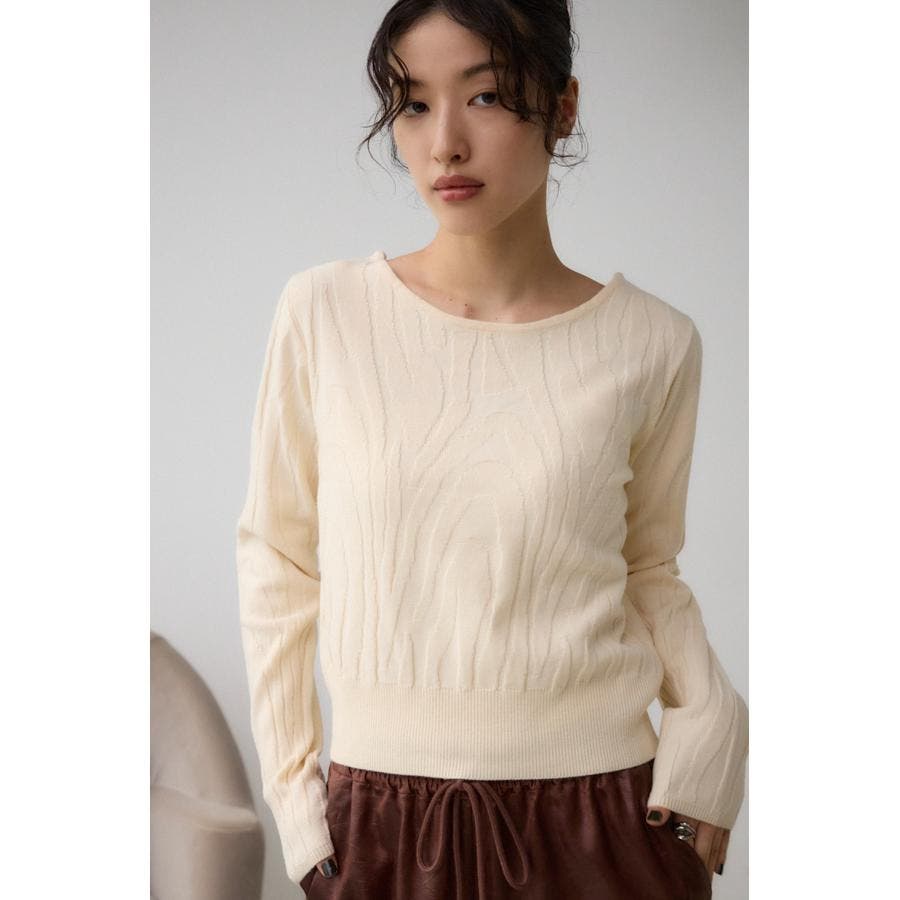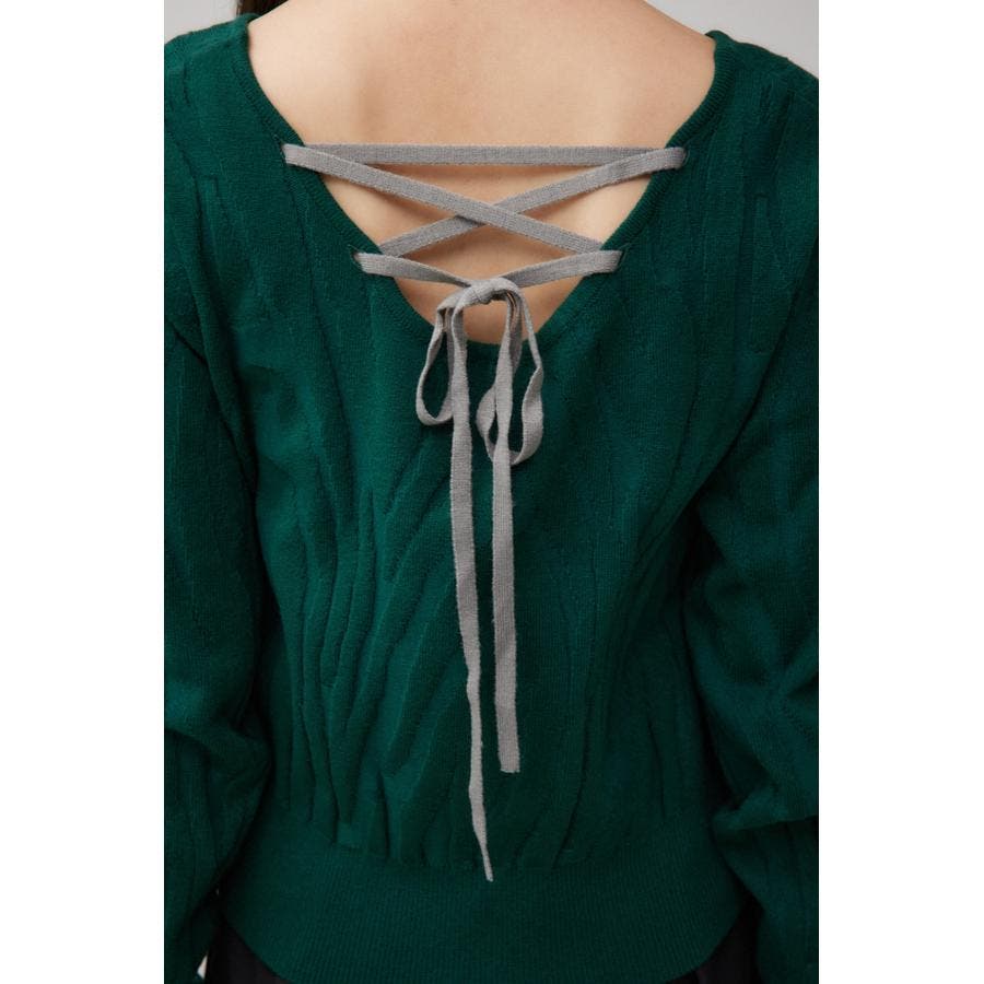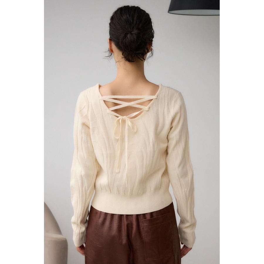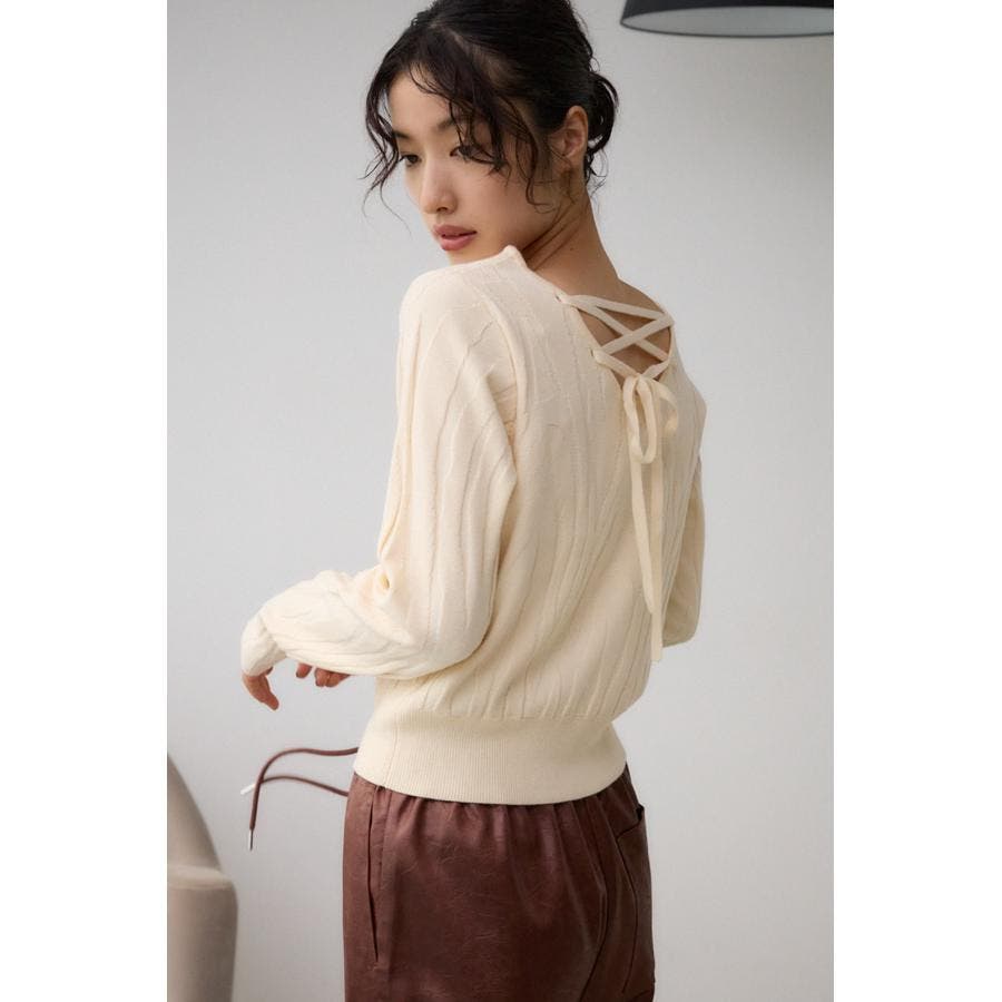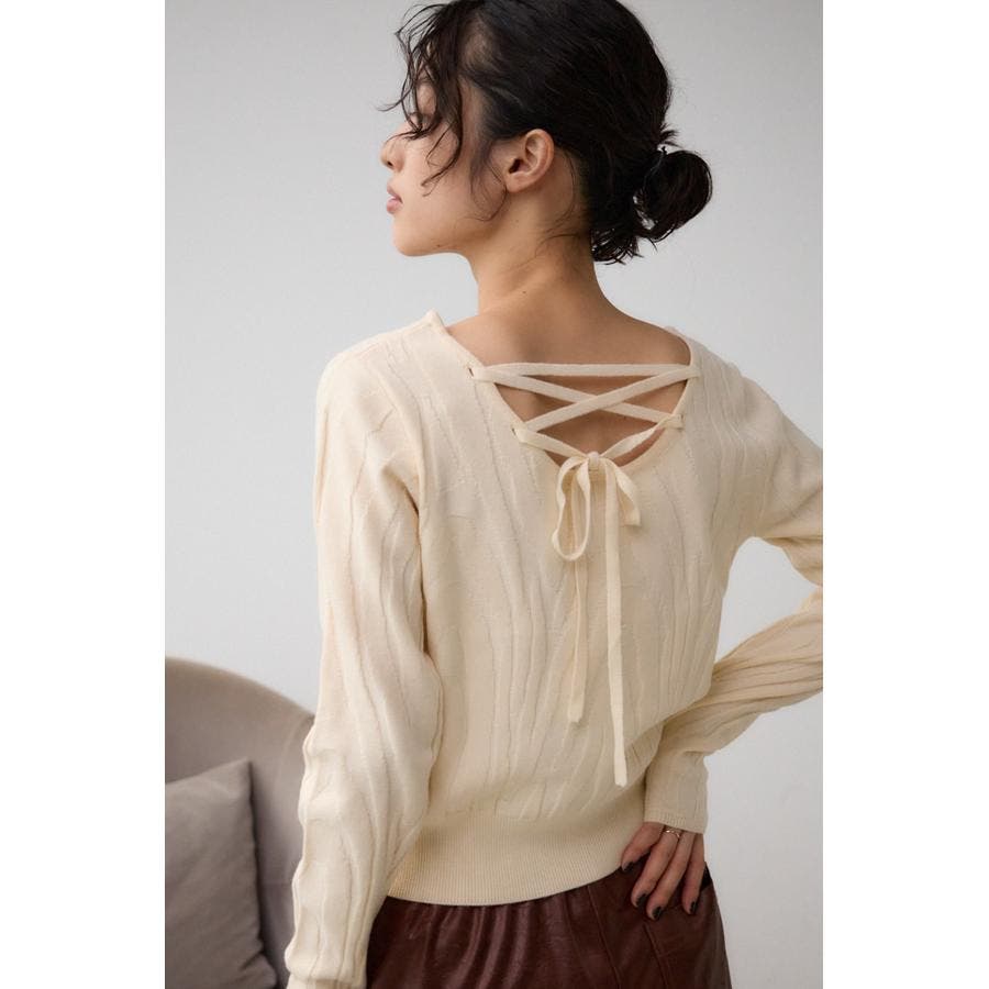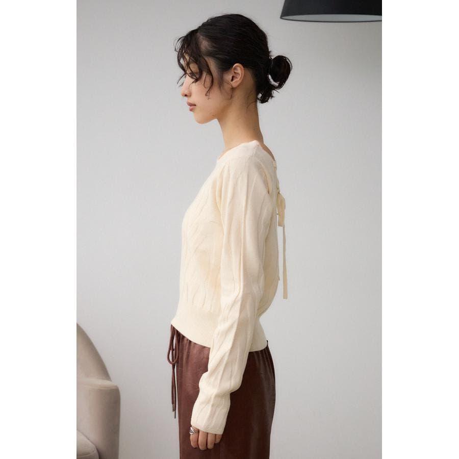 立体感のあるジャガード柄とバックリボンがポイントの秋口から活躍するニットです。
