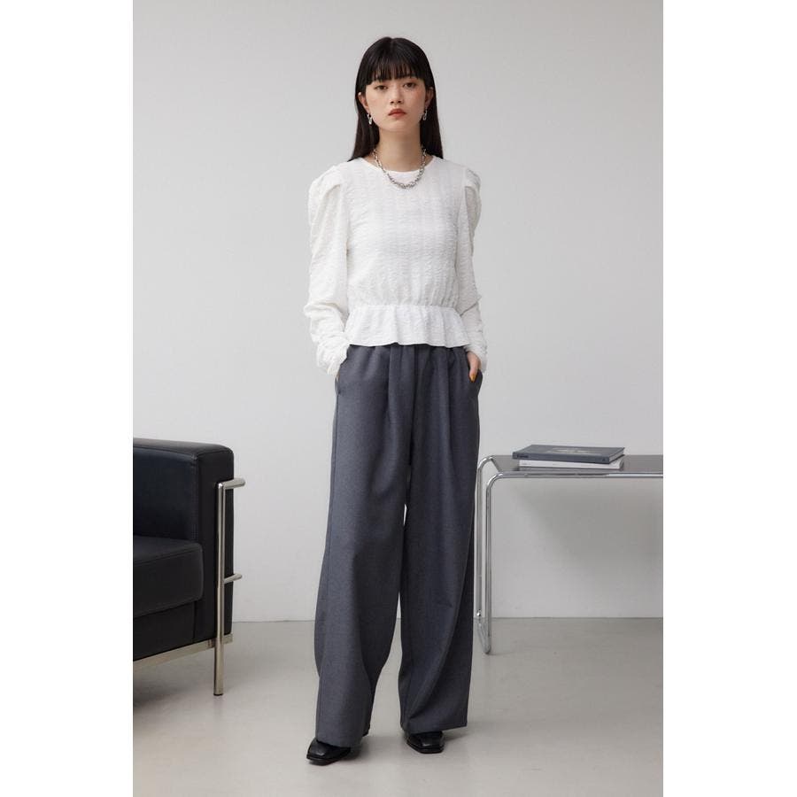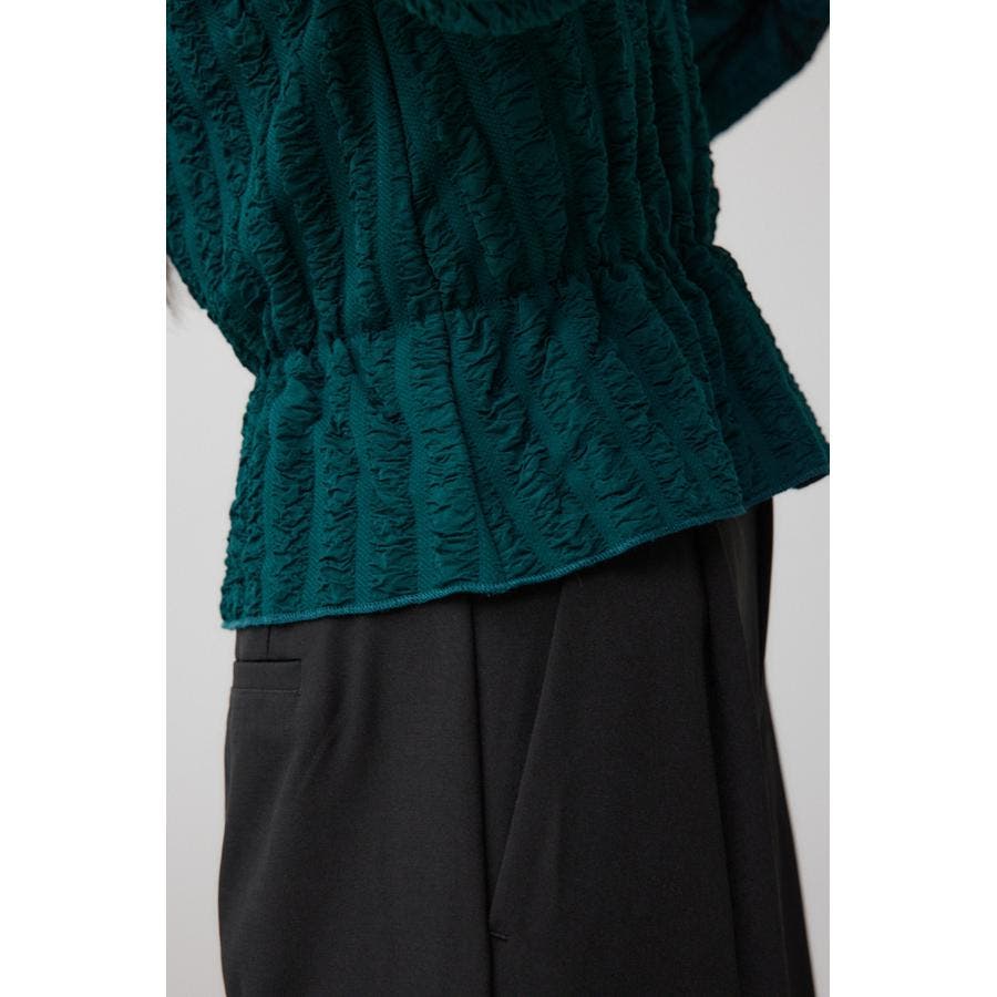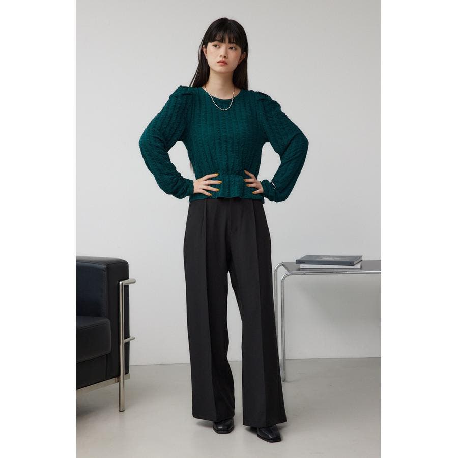 ペプラムのデザインがウエストり周りをすっきり見せてくれ、ボトムにインしてもしなくてもスタイリングが決まる一枚です。