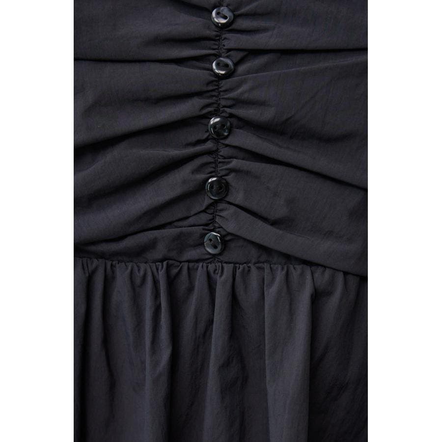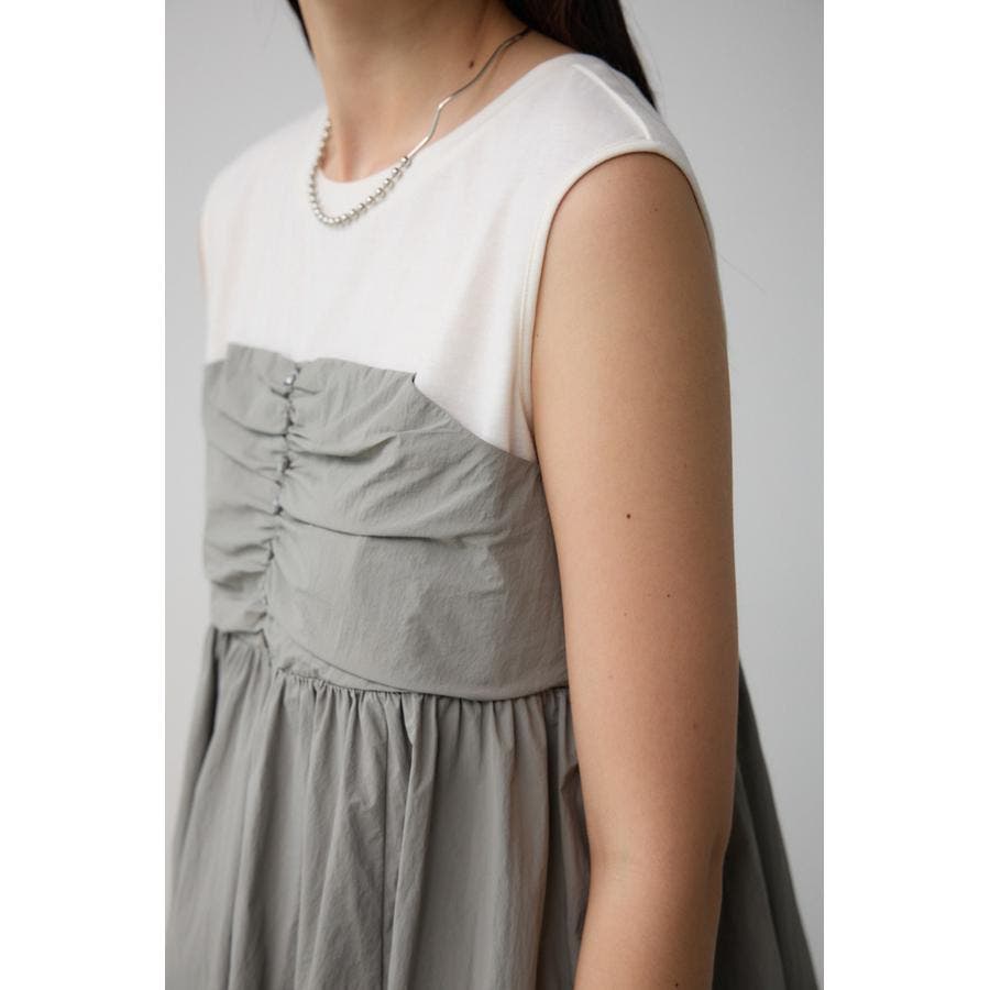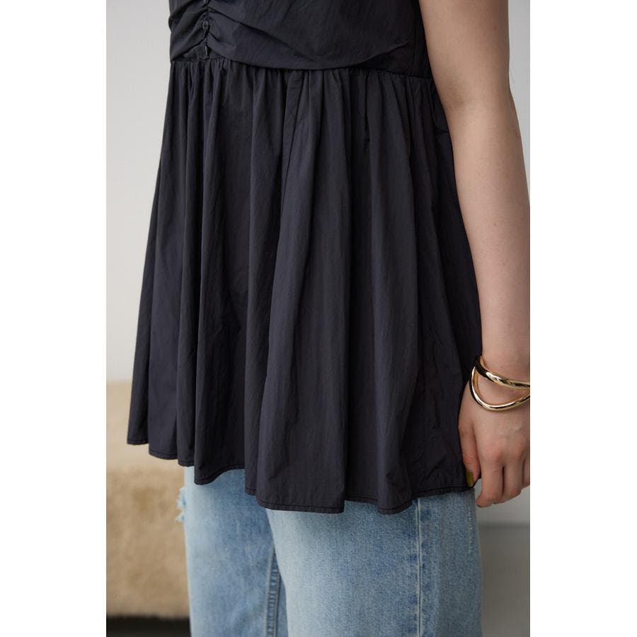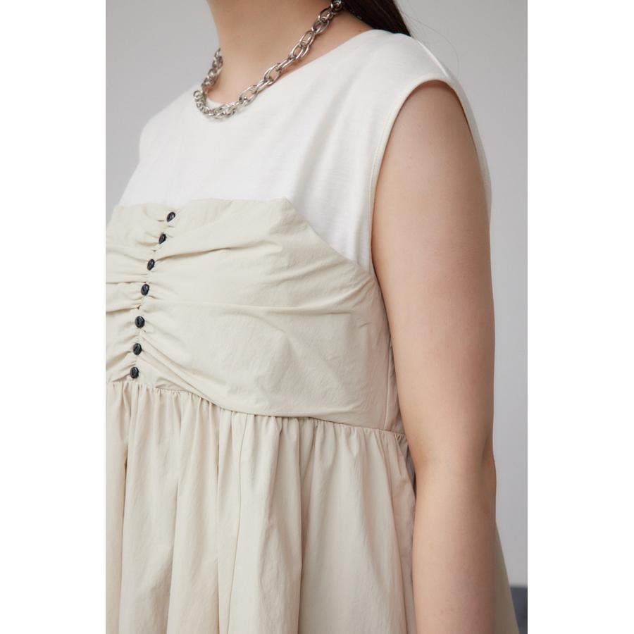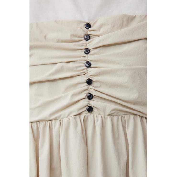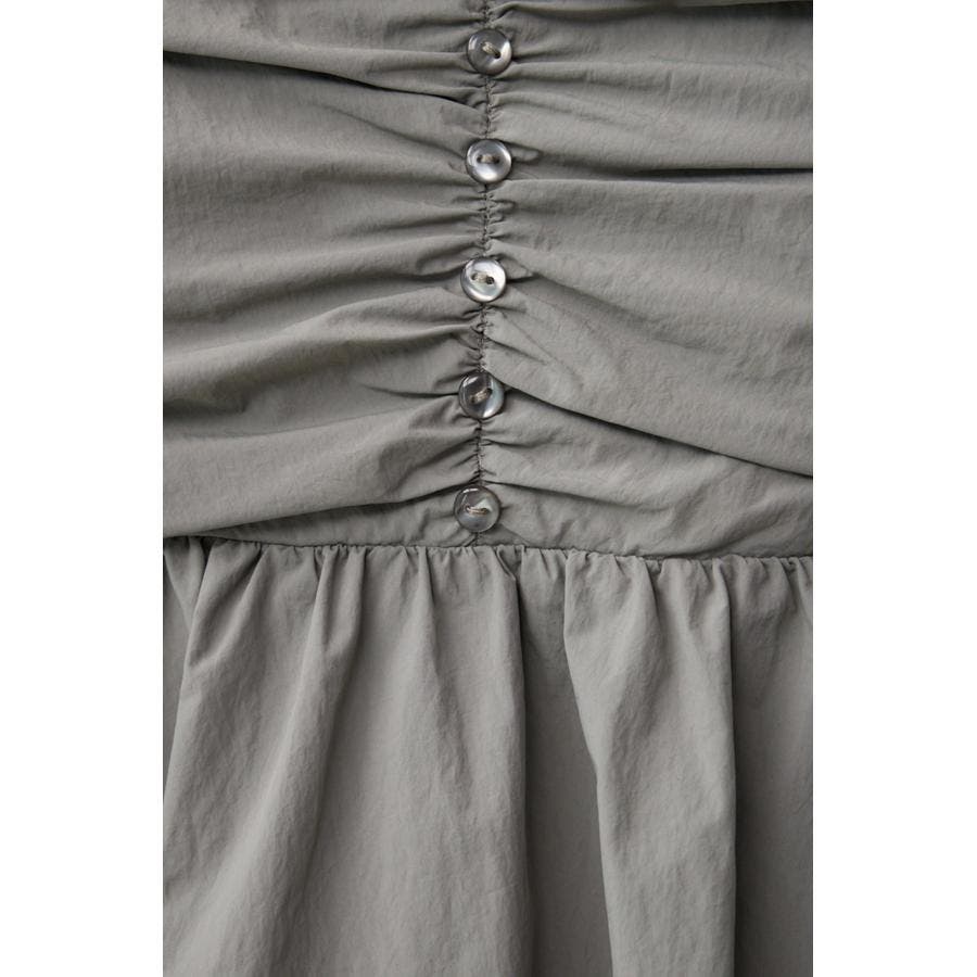 フロントのボタンがアクセントになり、ギャザーを寄せたデザインが女性らしさをプラス。