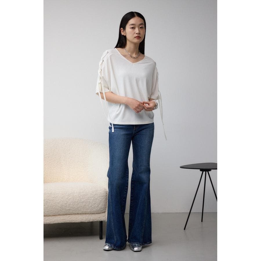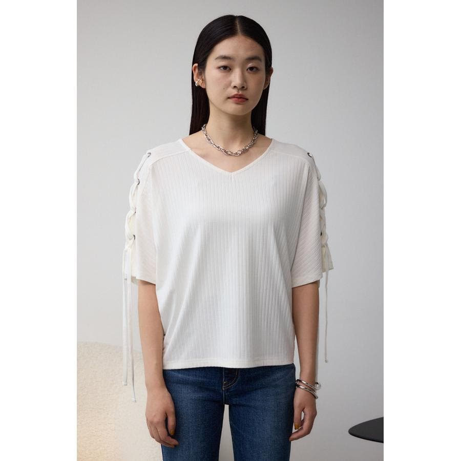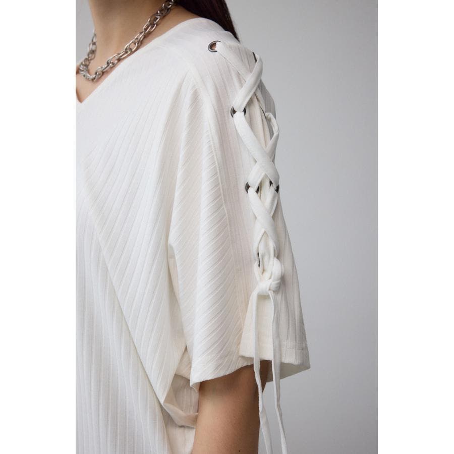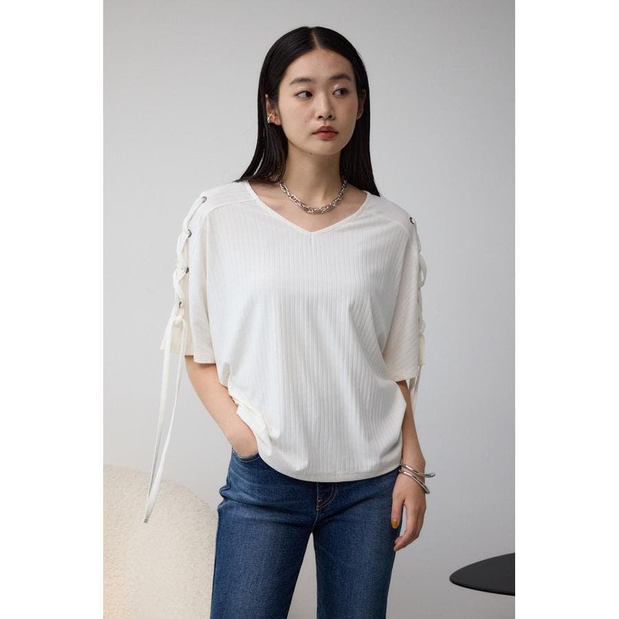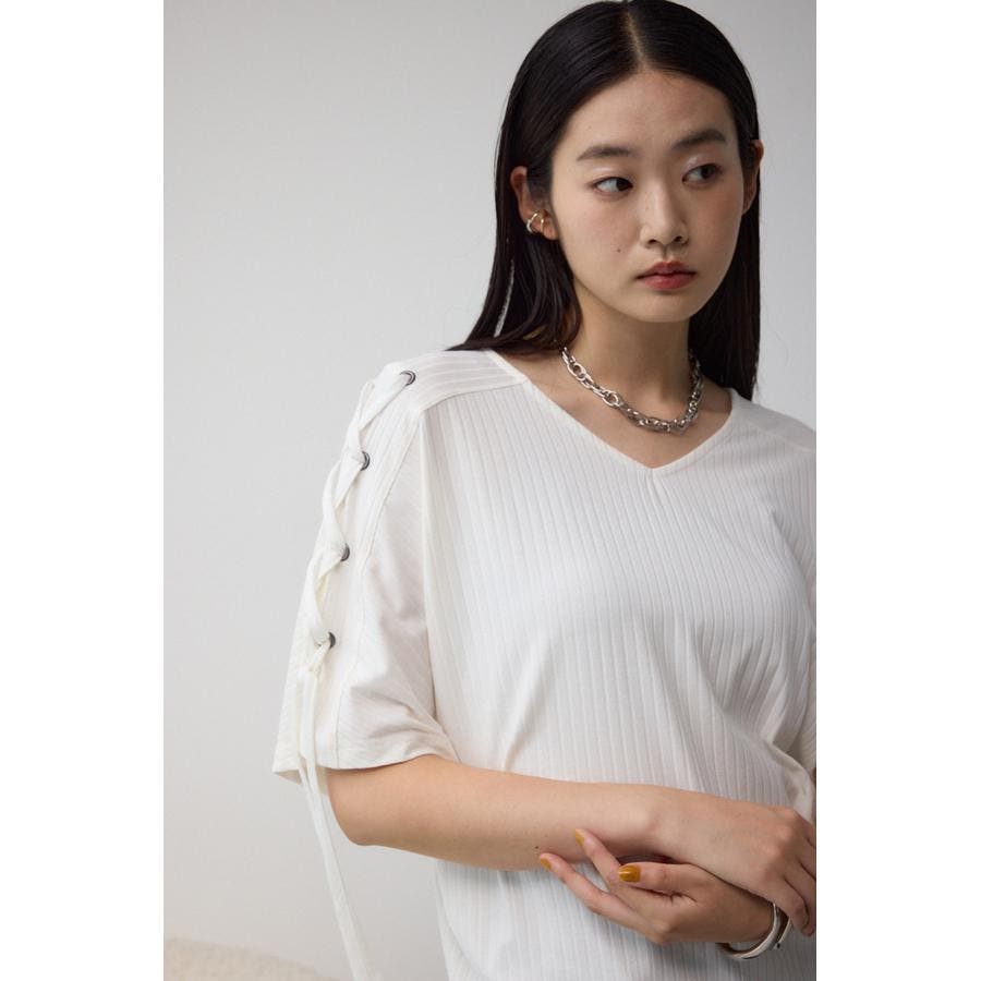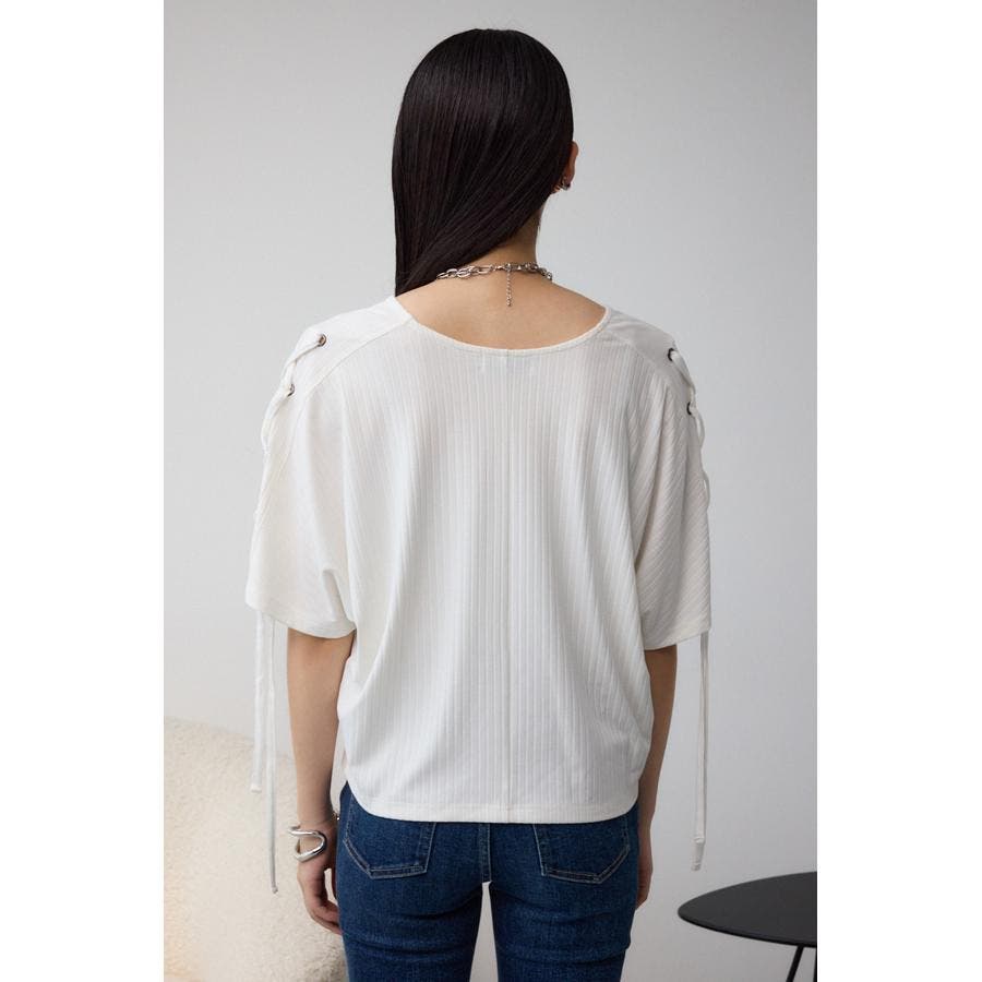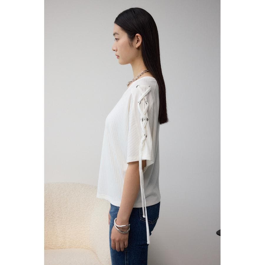 ■商品(デザイン)ポイント:レースアップが目を惹くドルマンカットソー。