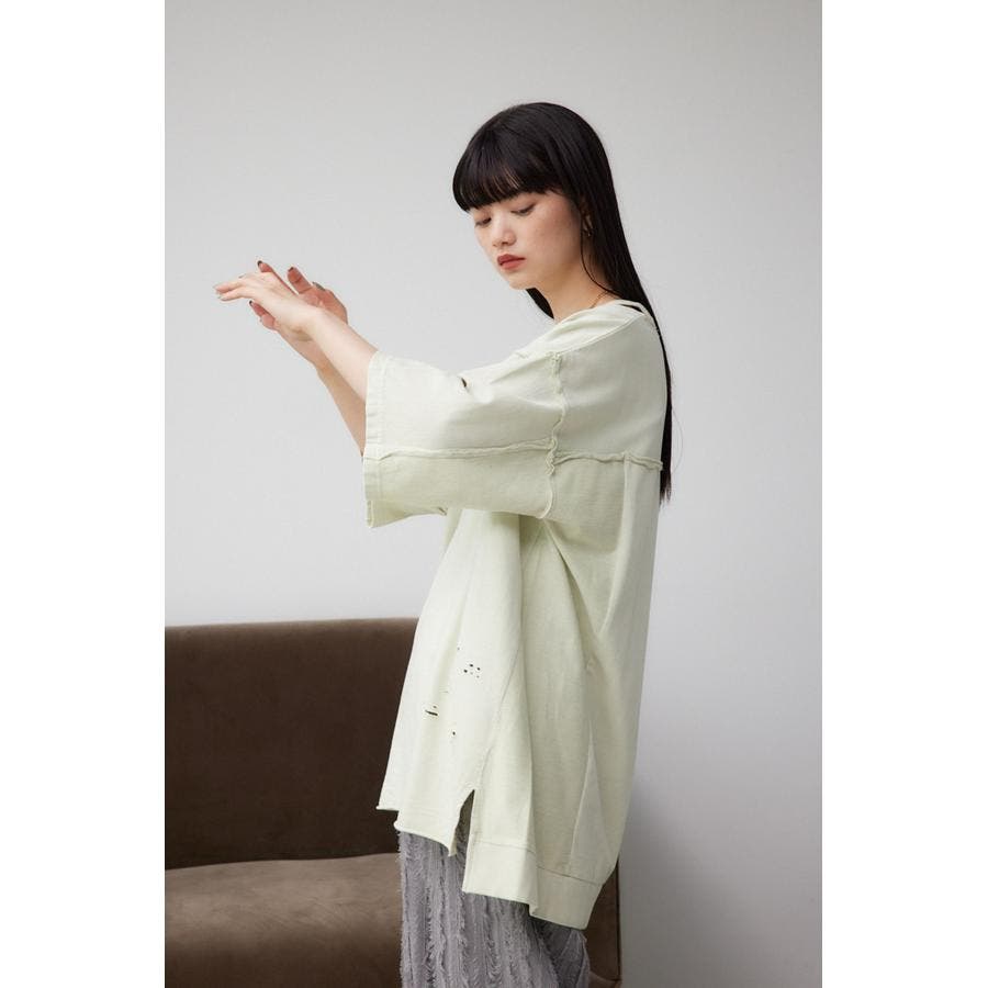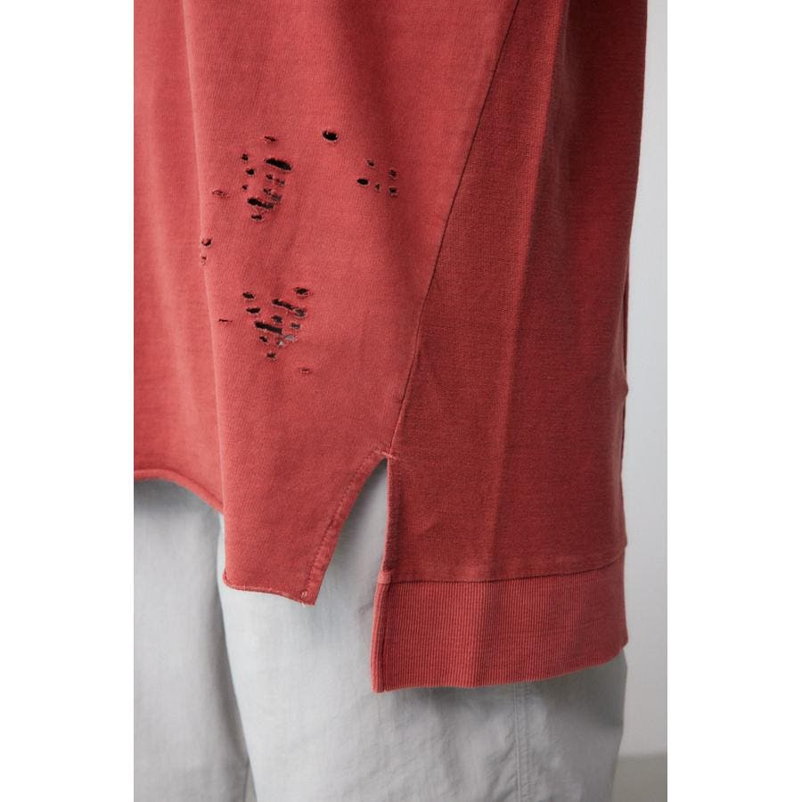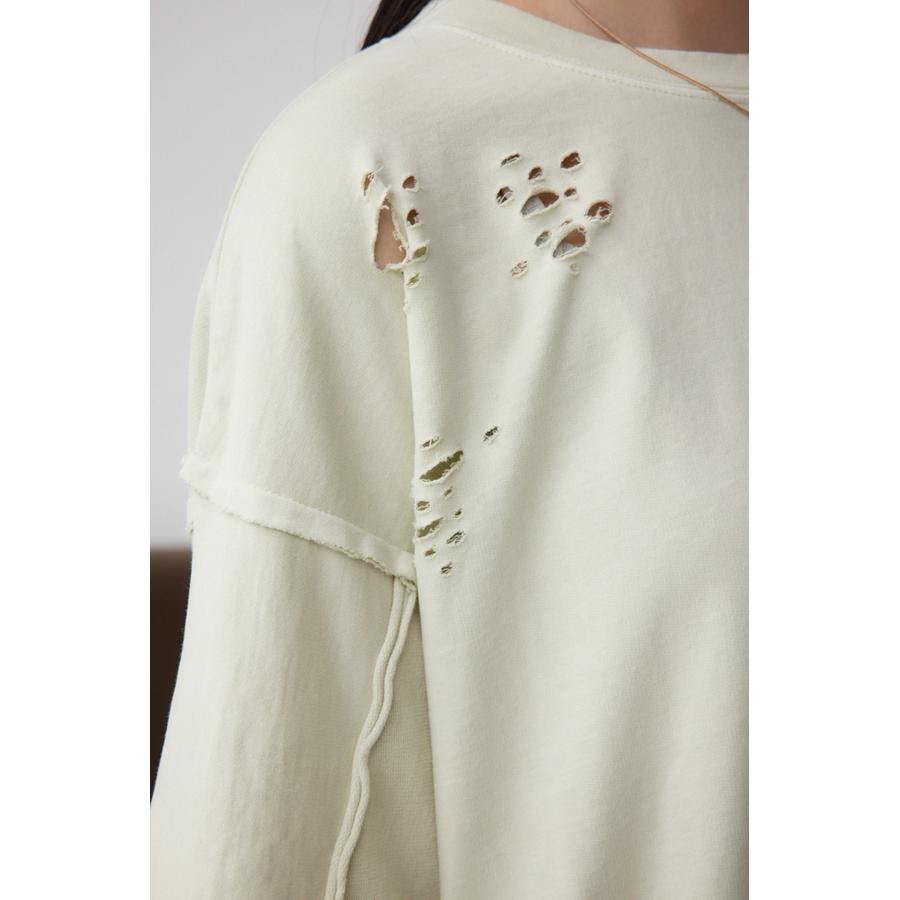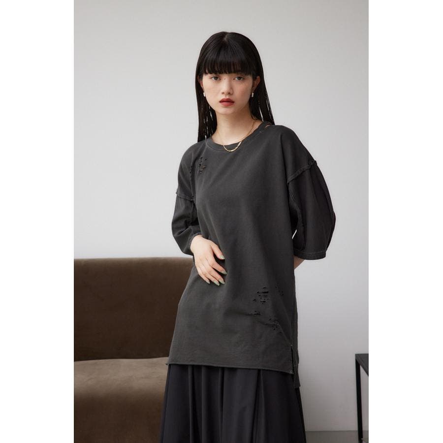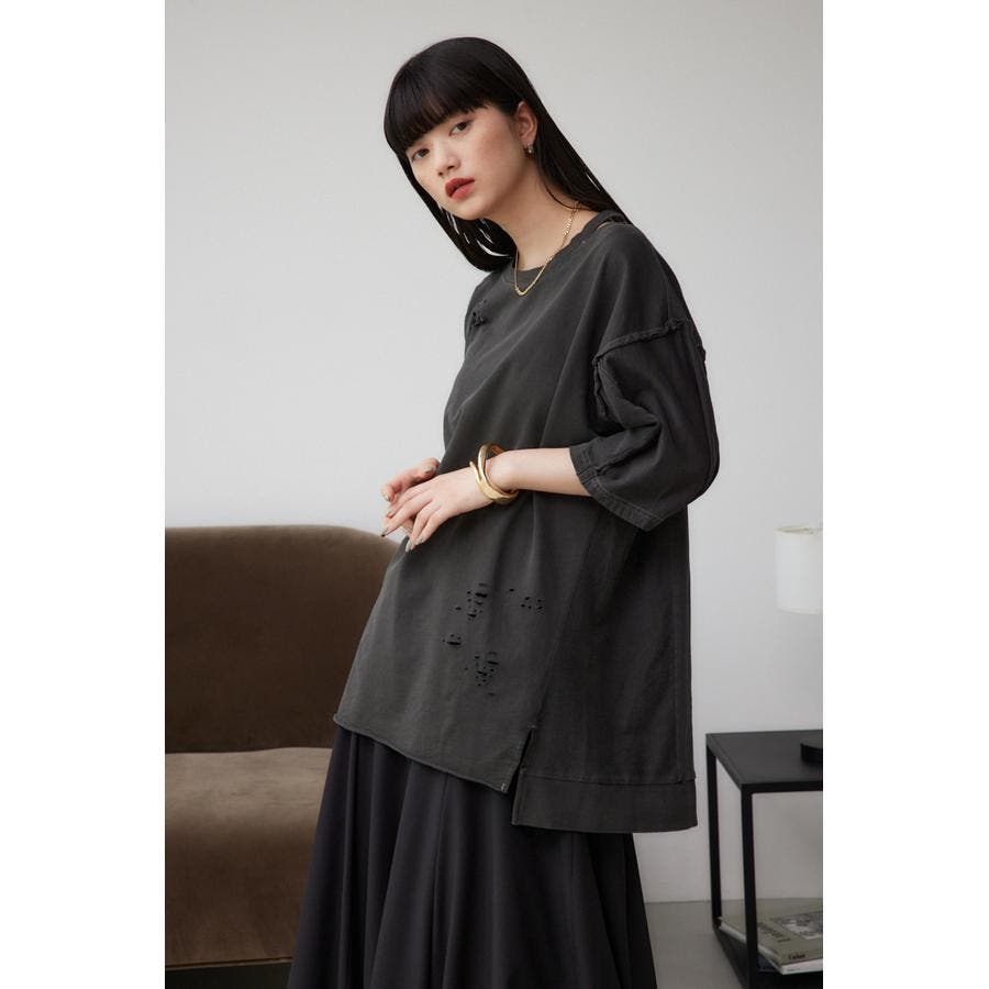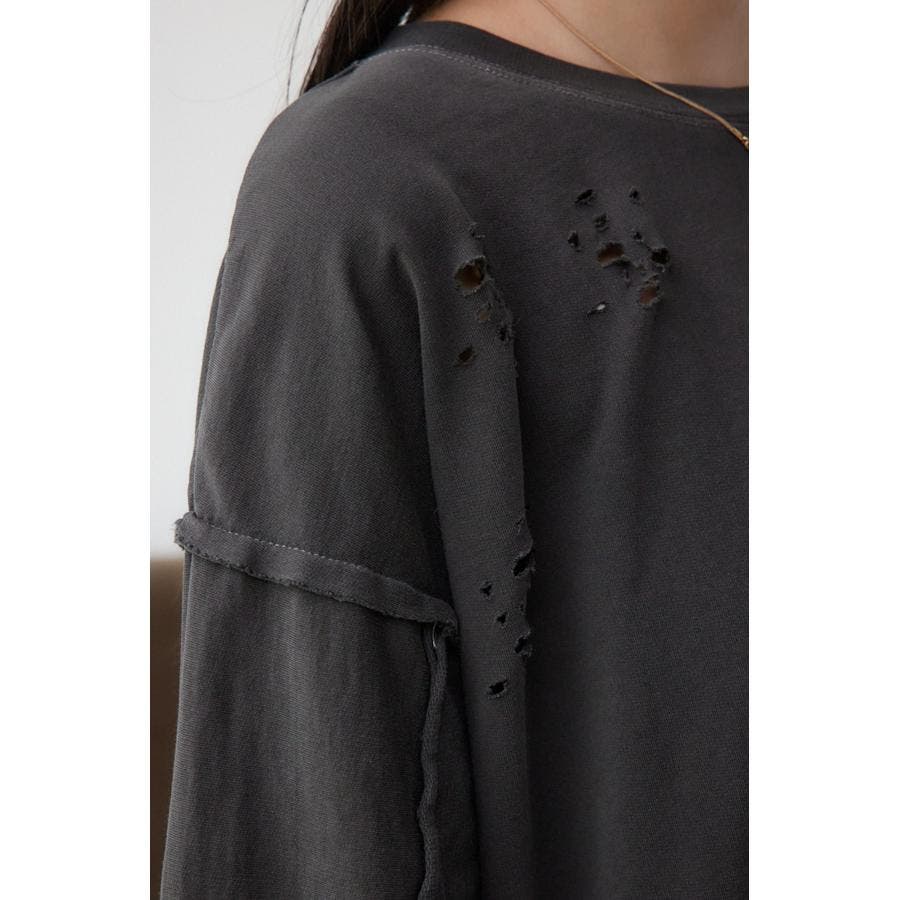 ダメージ加工と、切り替えデザインがポイントの裏毛トップスです。